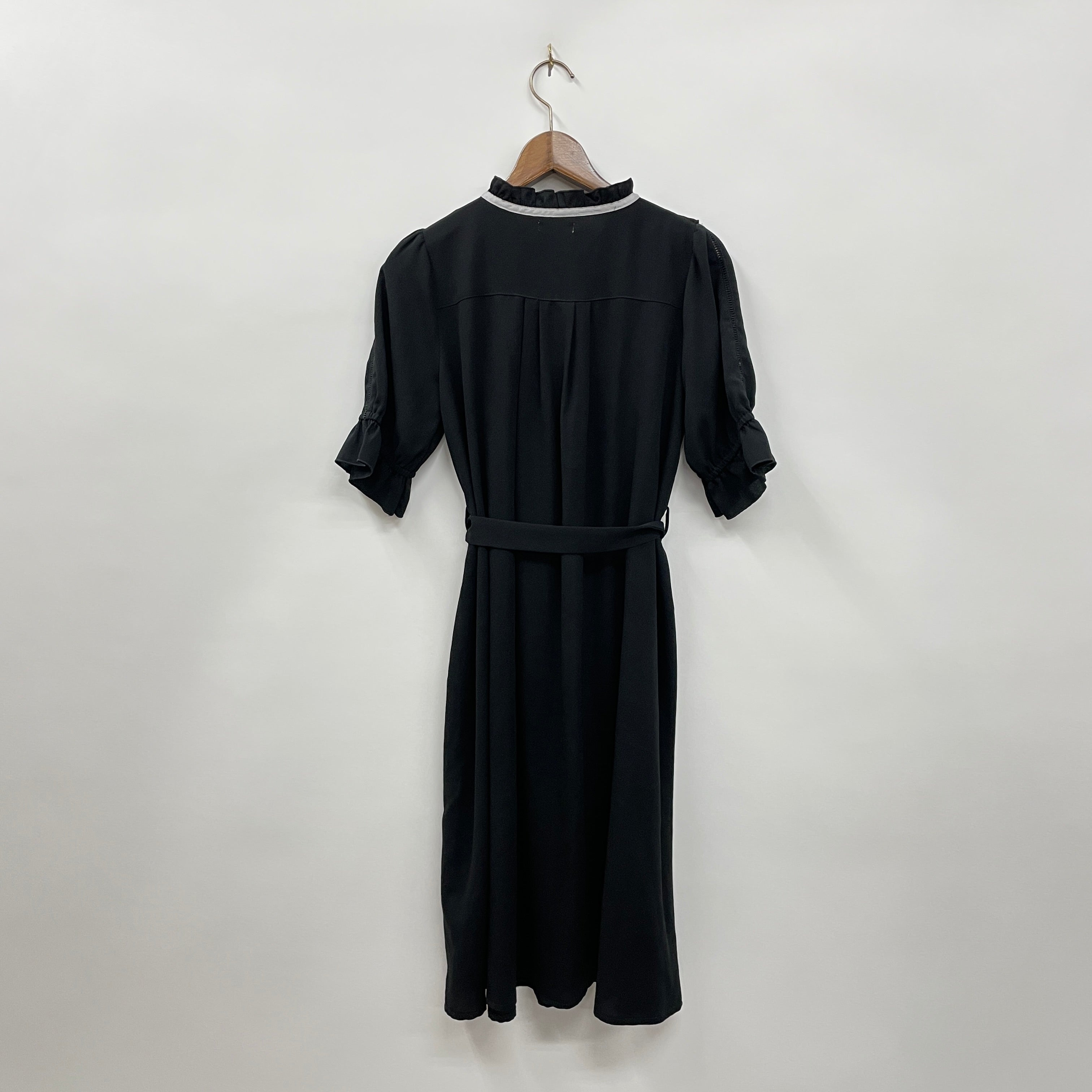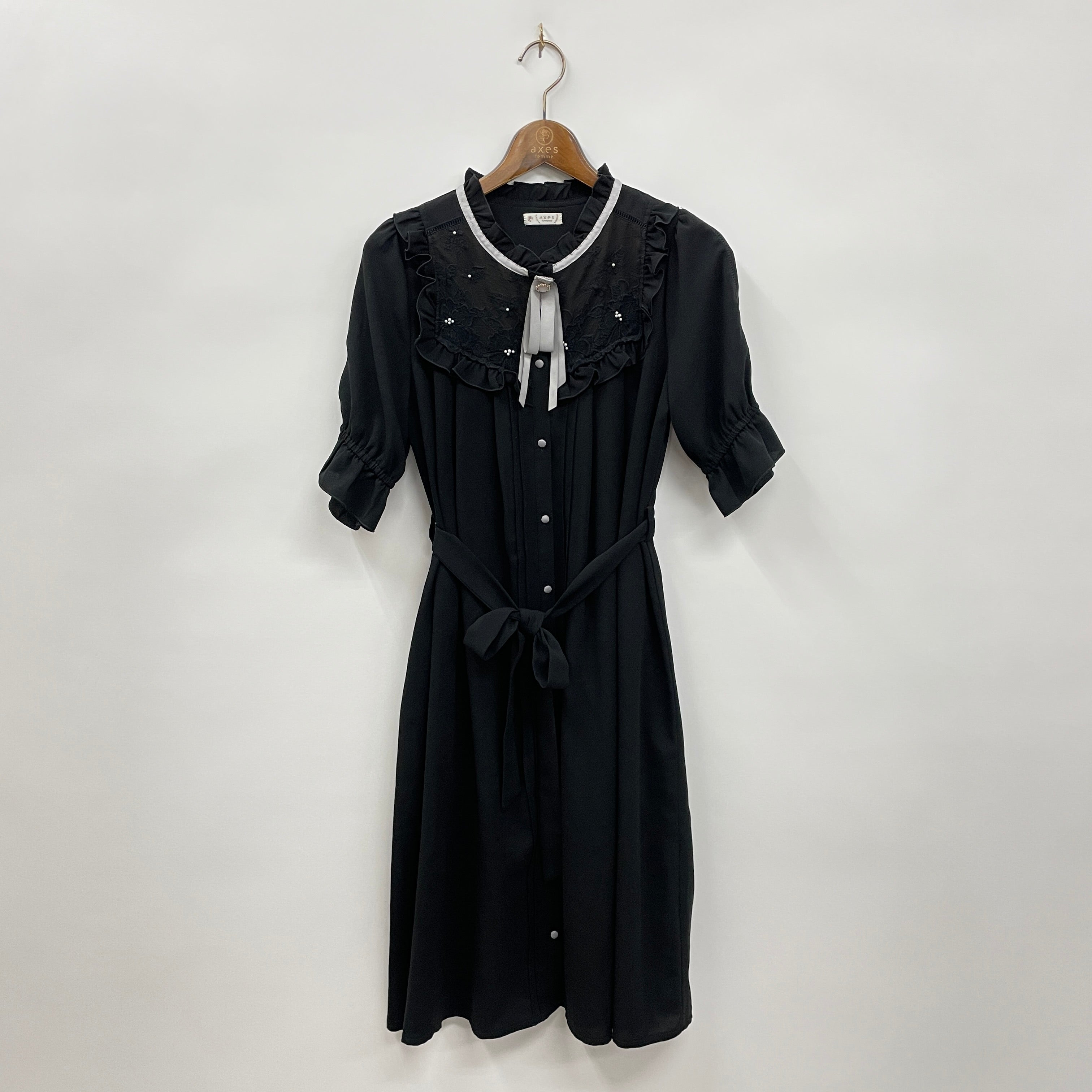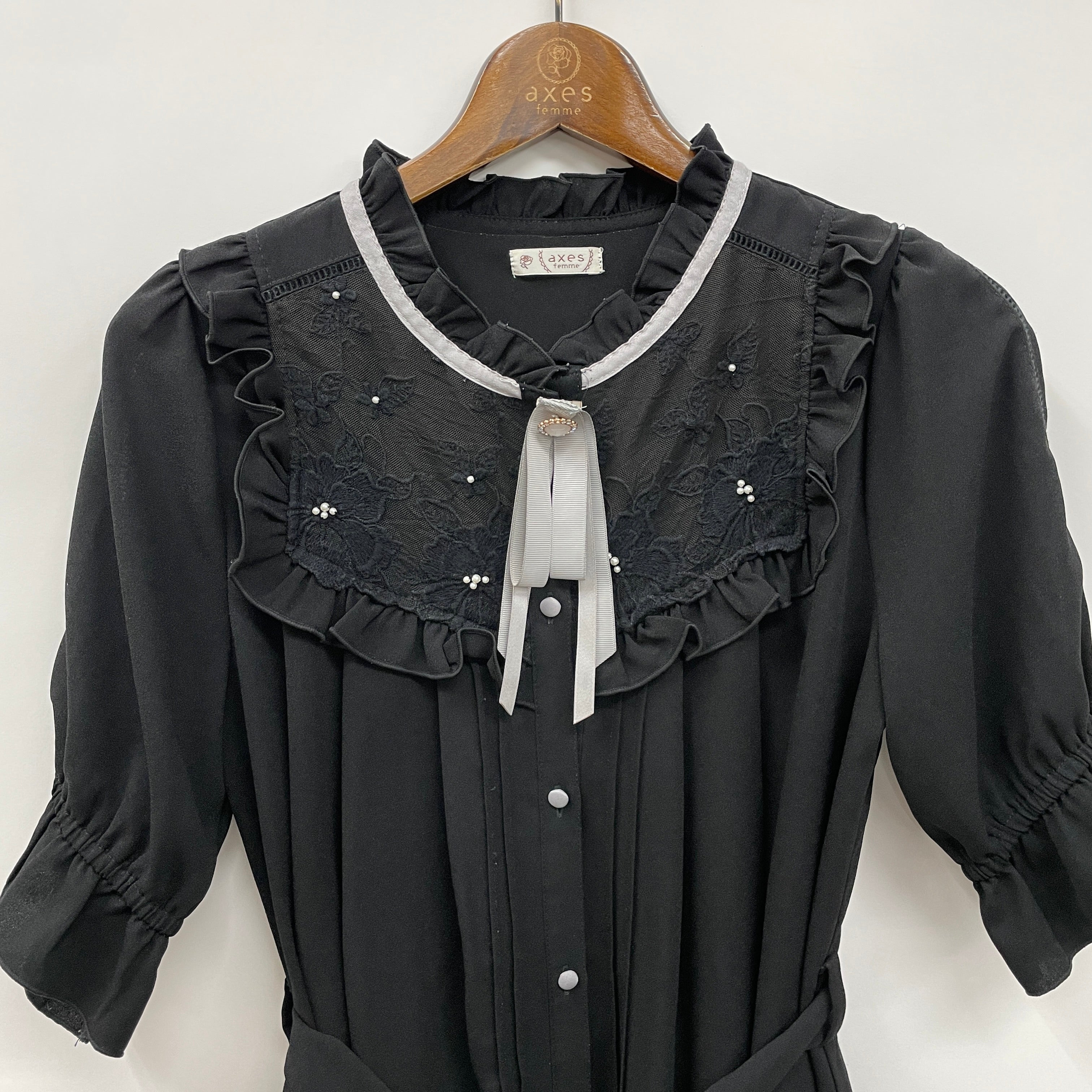 フリルデザインが可愛らしいシャツワンピース。ややしぼ感のある素材でさらっと着ていただけます。ロングスカートやペチスカートと合わせたフェミニンなスタイリングがおすすめ。リボンブローチは取り外し可能です、お手持ちのブローチやリボンと合わせても◎。