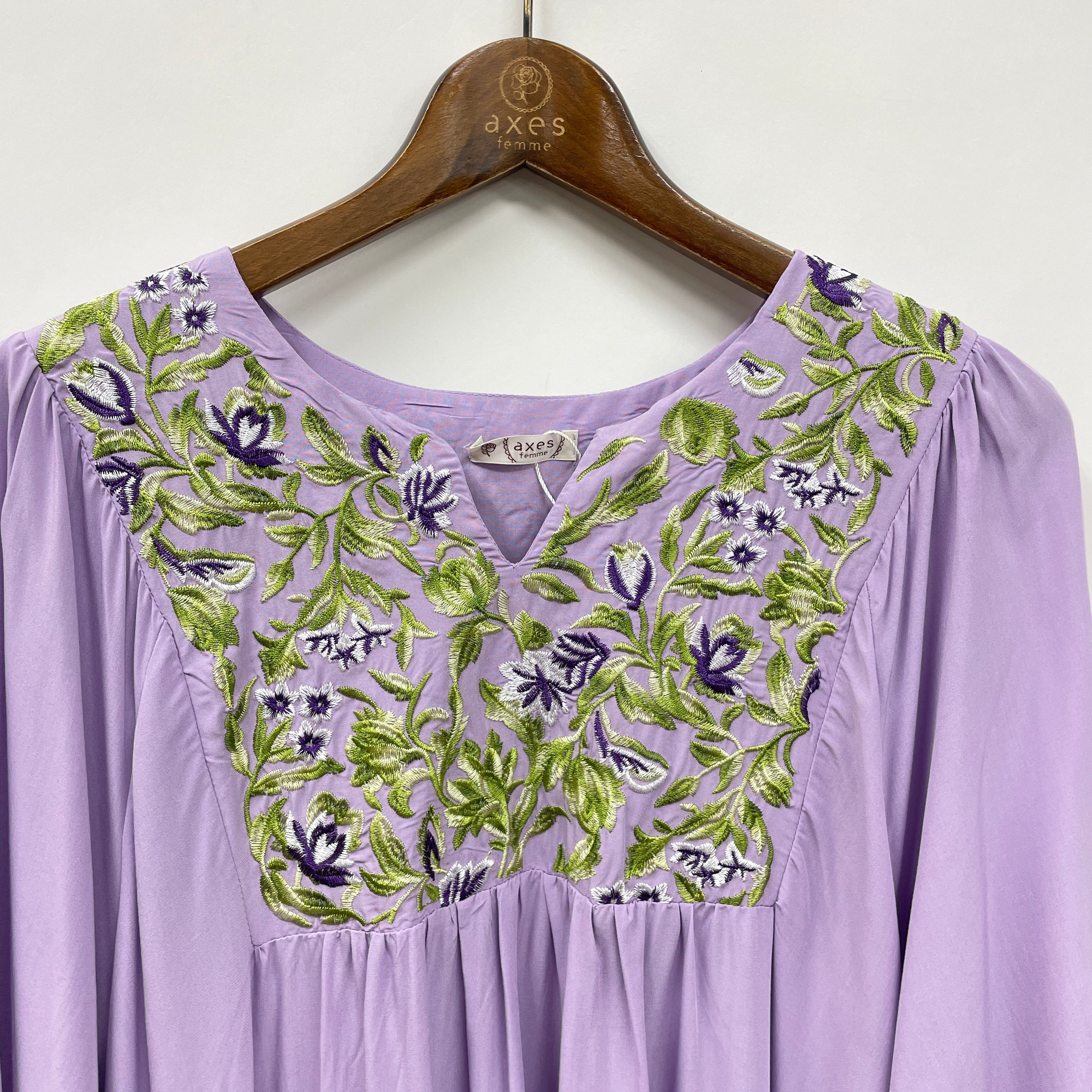 胸元の刺繍が上品で華やかな印象をプラス。