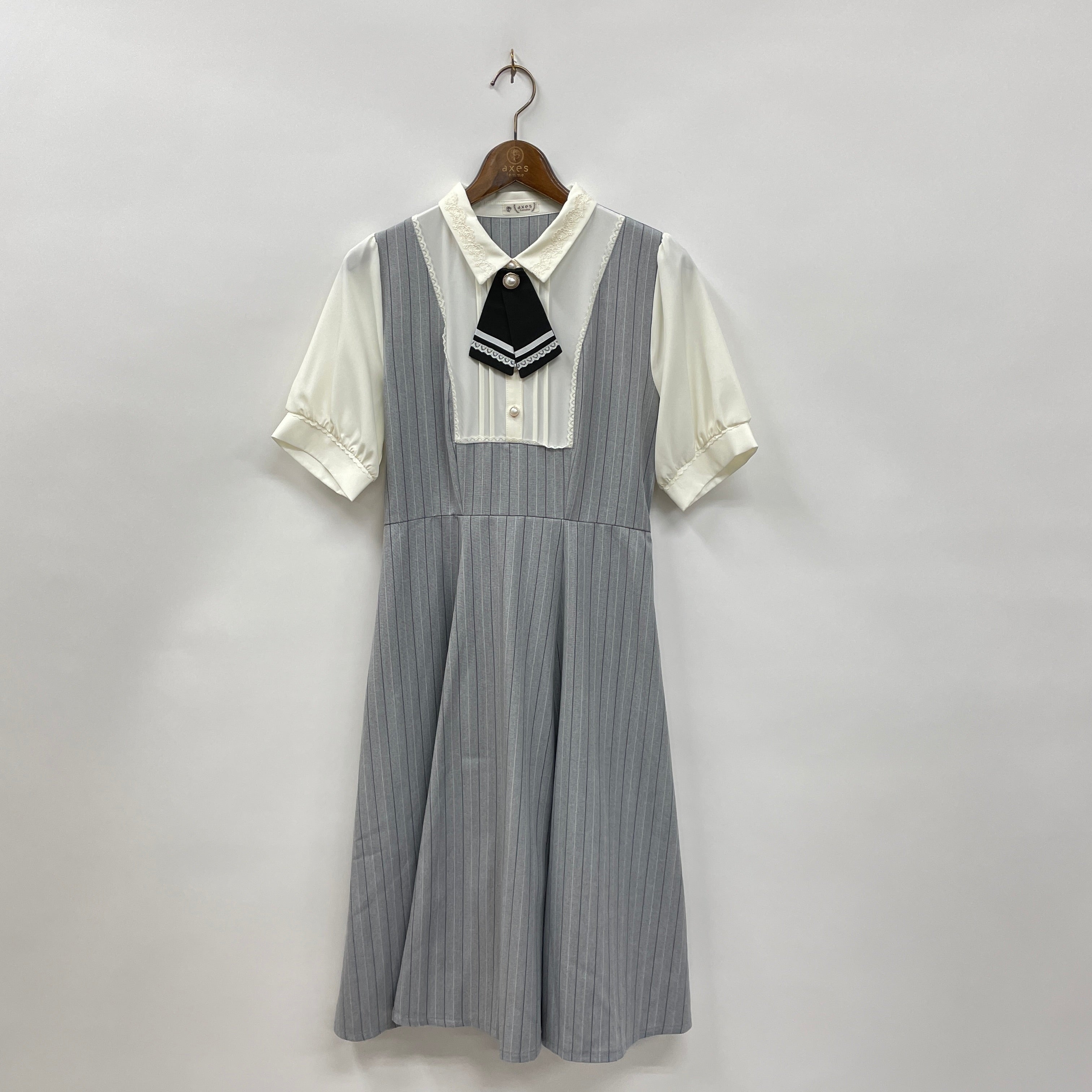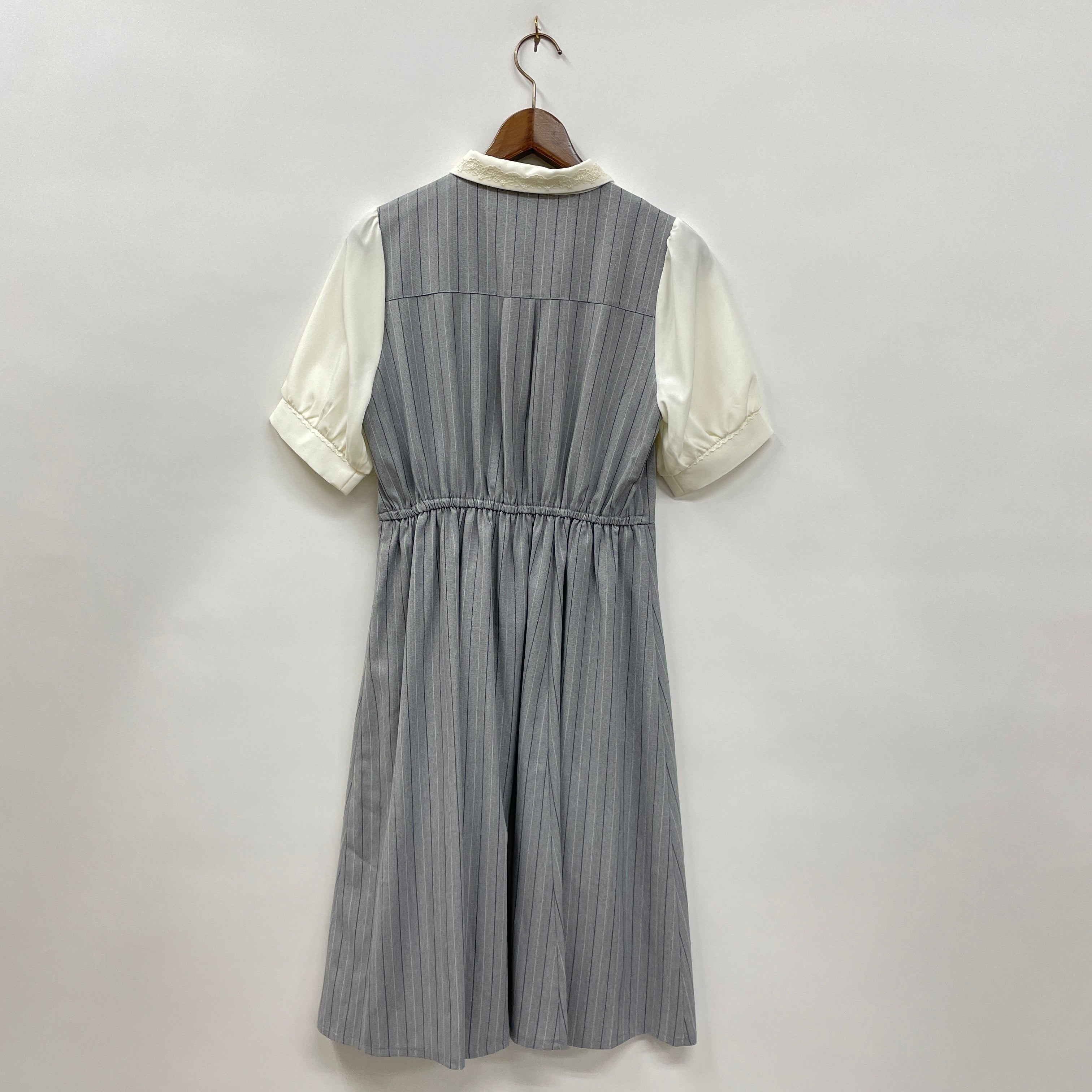 さりげないピンストライプ素材を使用したクラシカルテイストのワンピースです。直線的なブロッキングデザインでかっちりとした印象に。