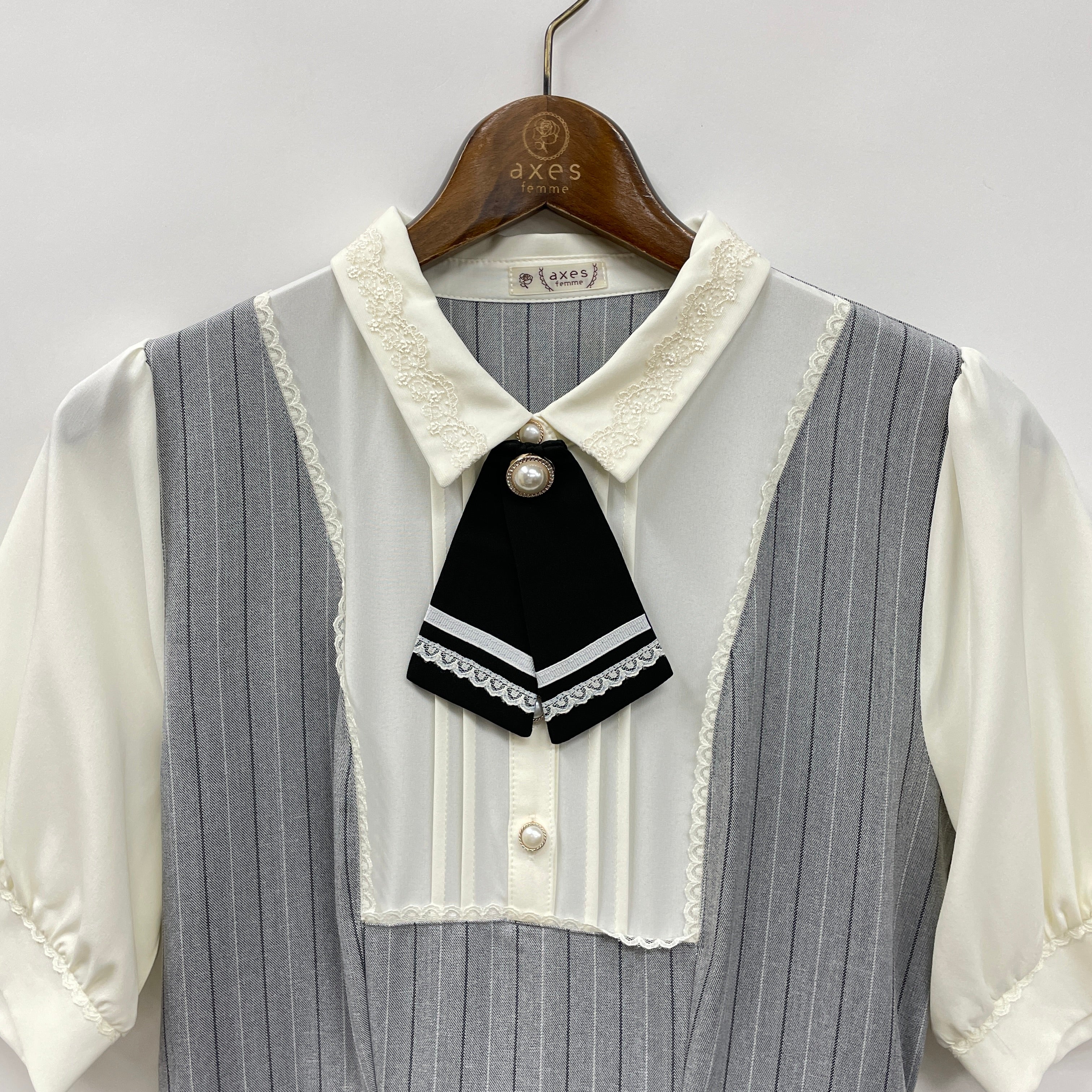 かわいらしいパールデザインのタイブローチは取り外し可能です。