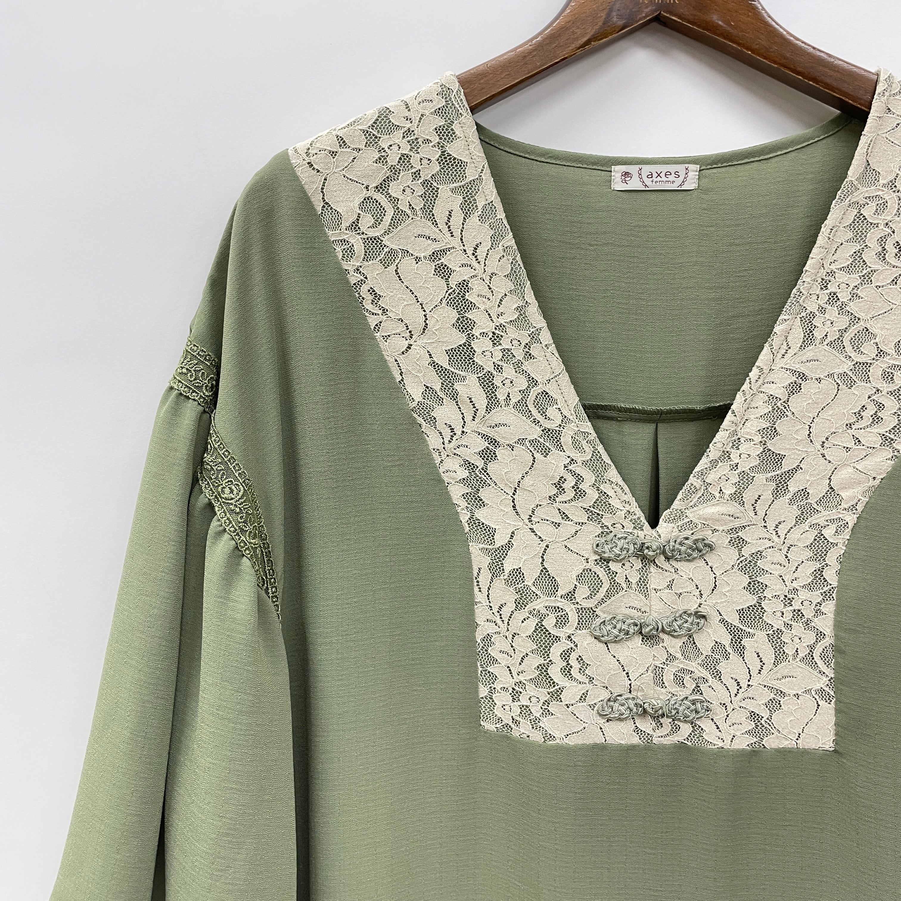 すっきりとしたVネックを飾るレースデザインがフェミニンさをプラスします。
