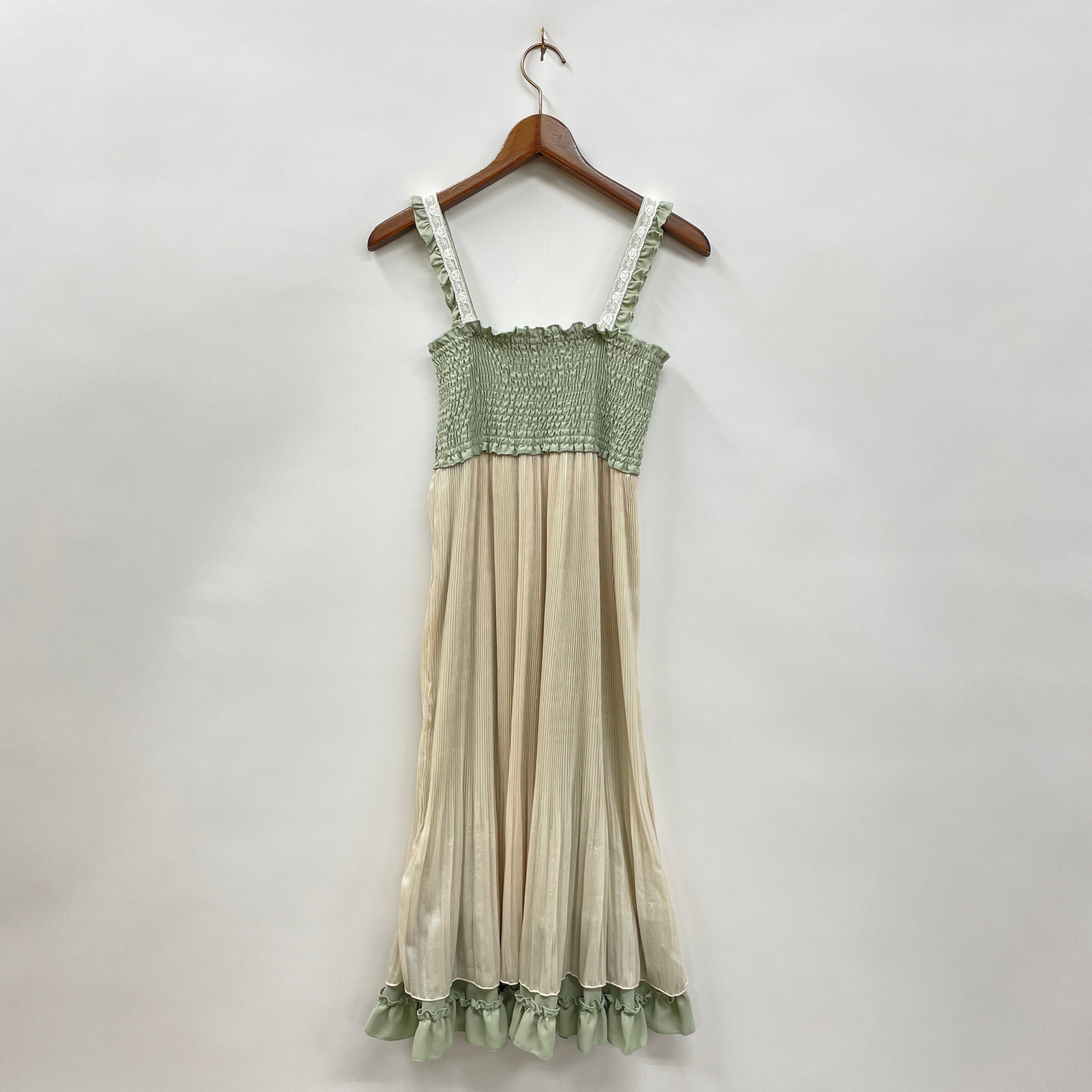 胸元はシャーリングゴム仕様です。適度なフィット感、着心地のよさが◎。肩ひもはボタンで調整可能です。ひもを外しロングスカートとしての着用もおすすめです。小柄な方から高身長の方まで着やすいしデザインに◎。