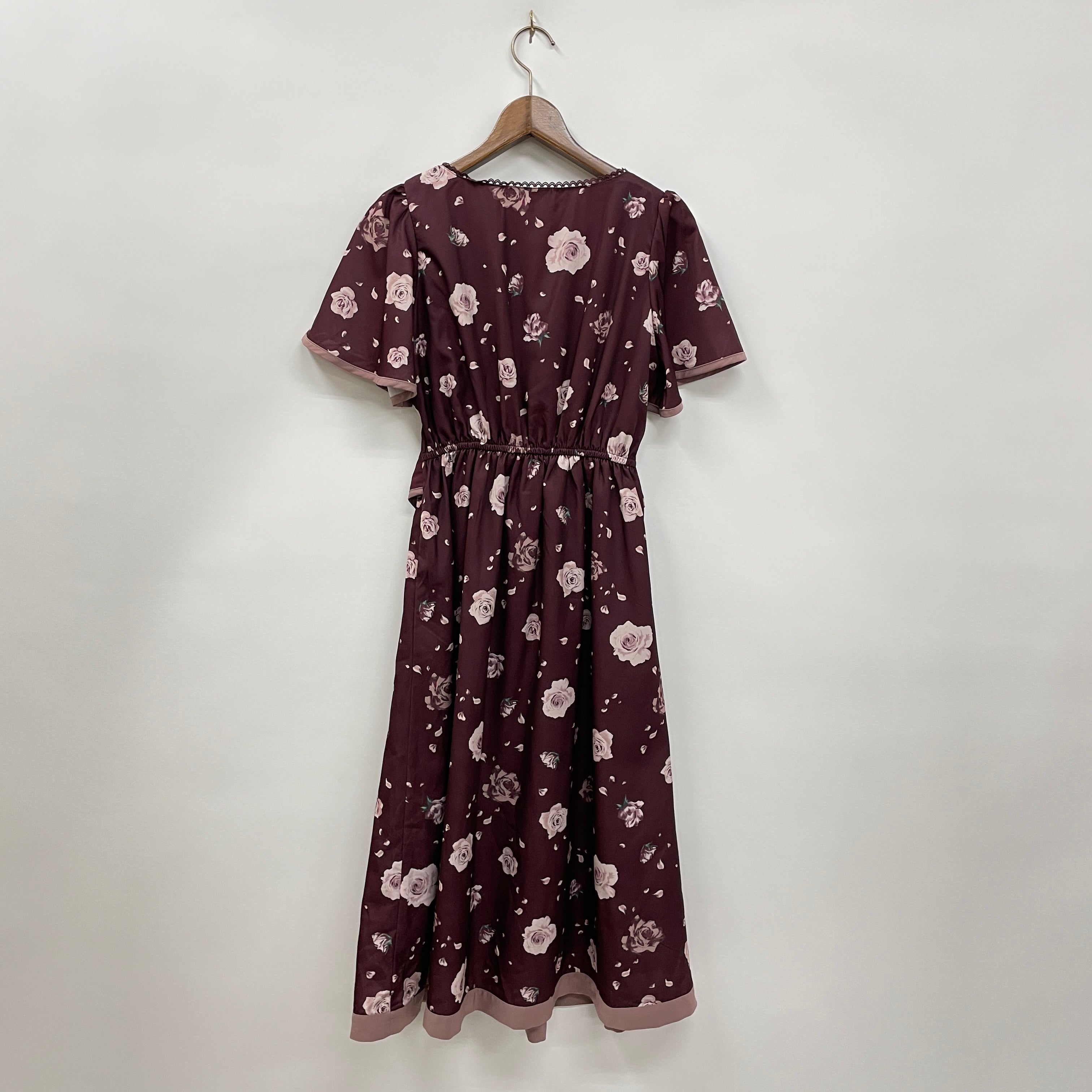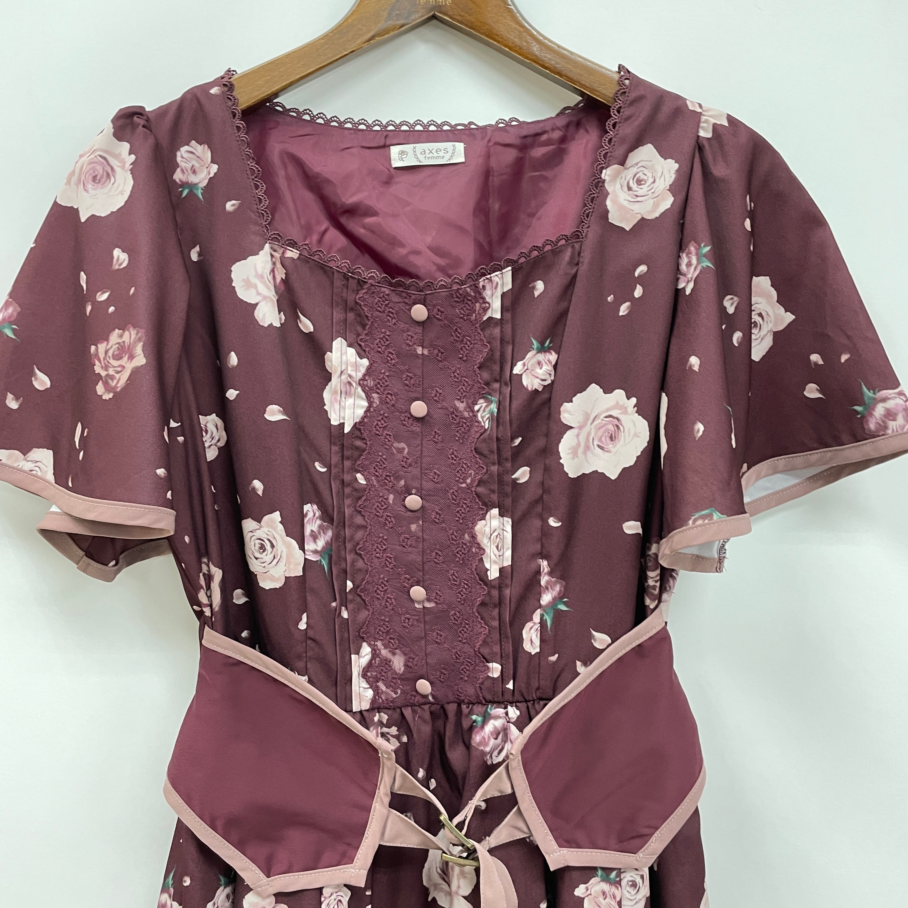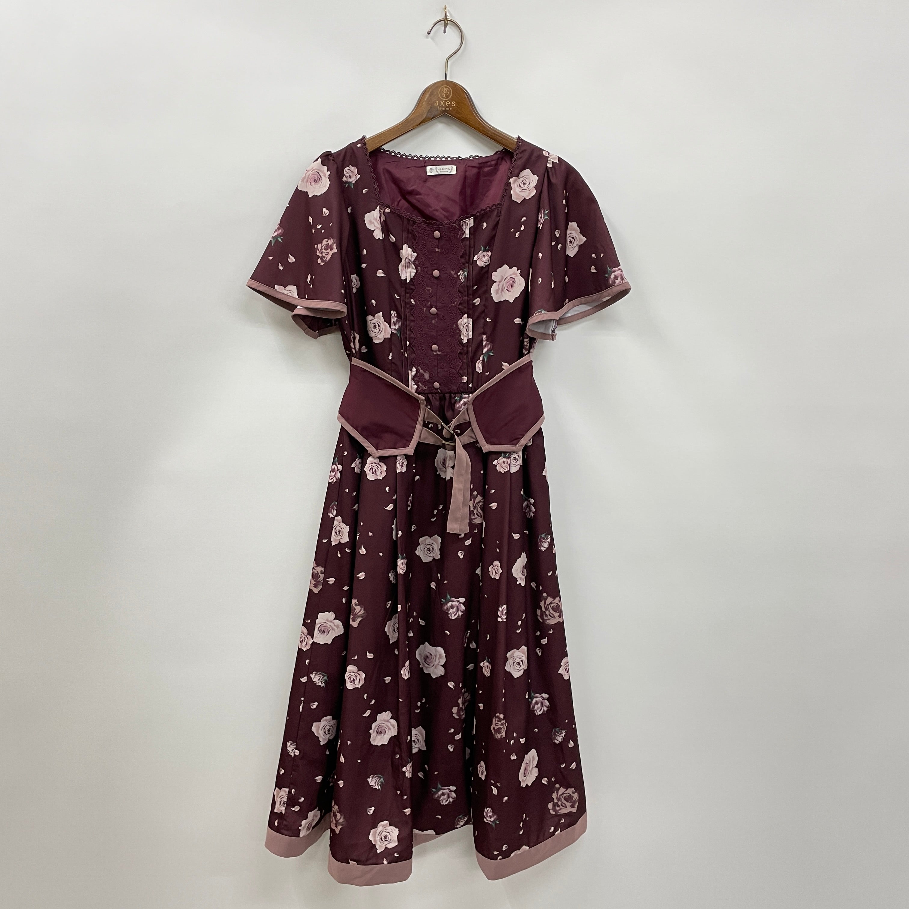 大きな花柄と、配色パイピングがポイントのワンピースです。ウエストのベルトで、多少のサイズ調整が可能です。たっぷりとフレア分量をとっているので、落ち感のある生地が揺れて上品です。