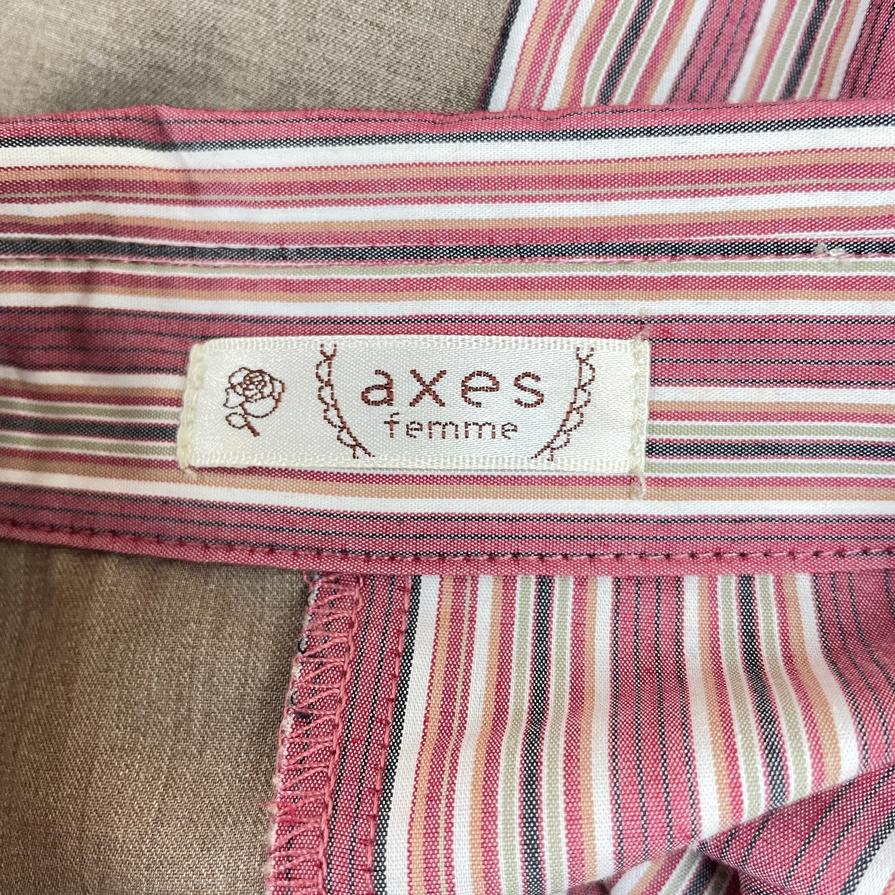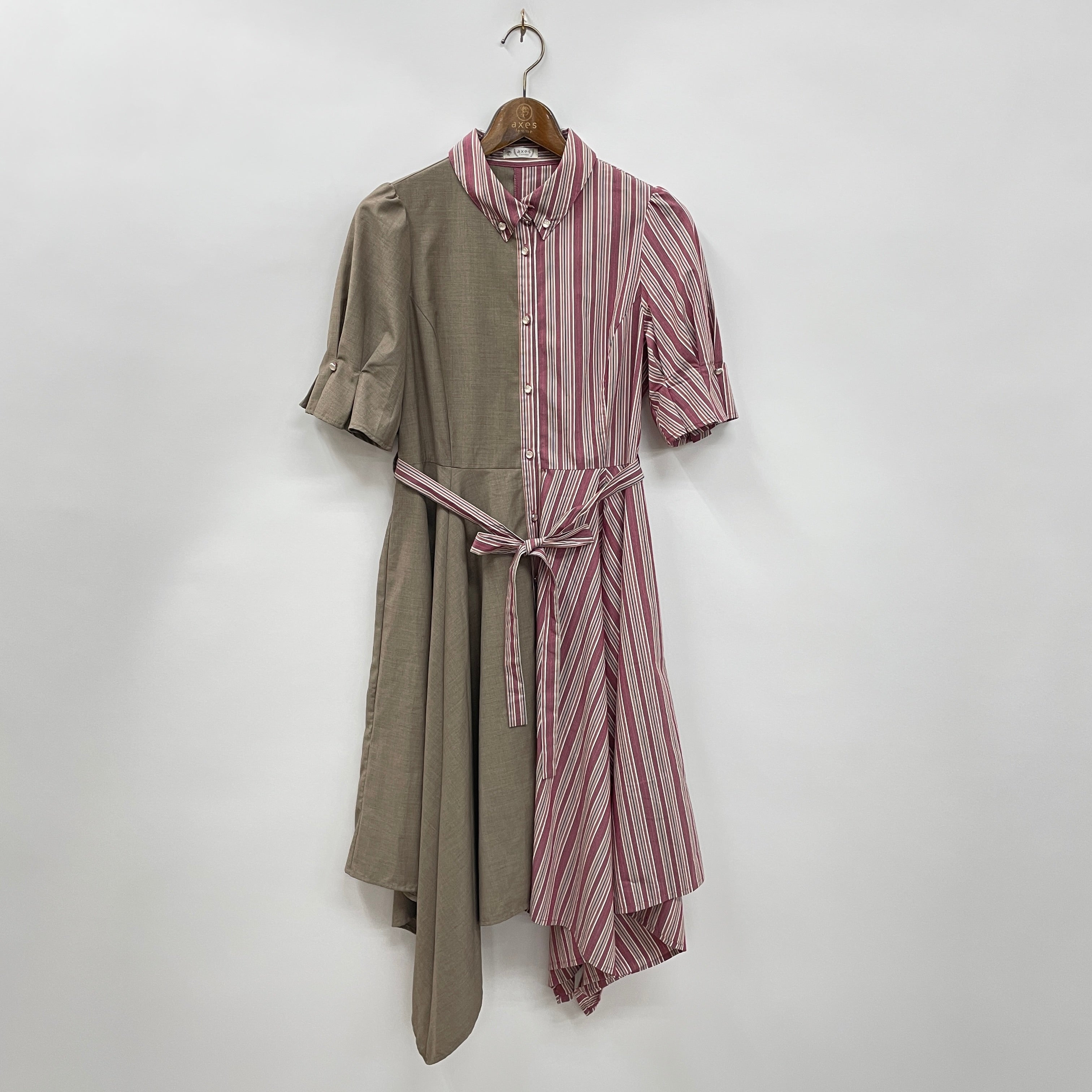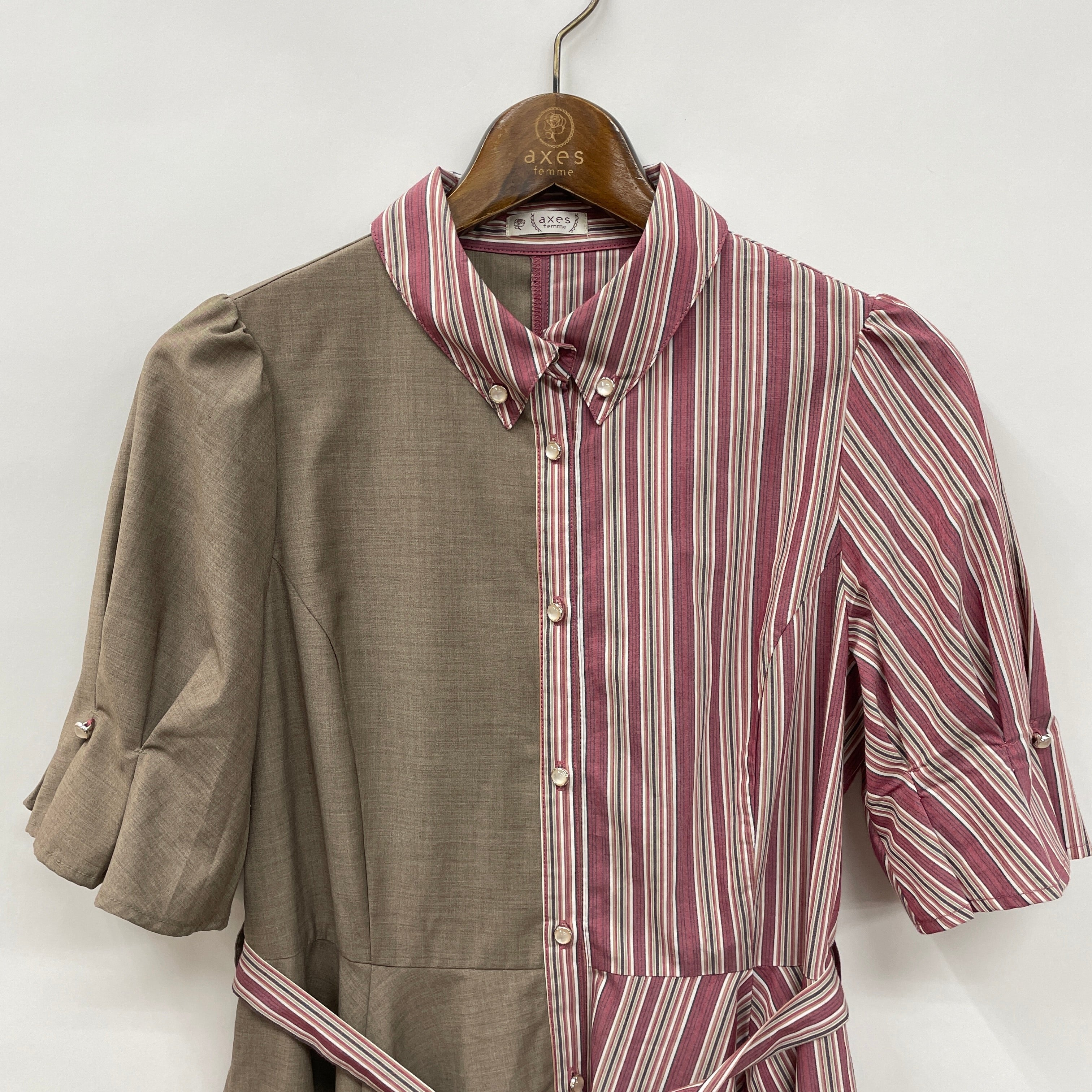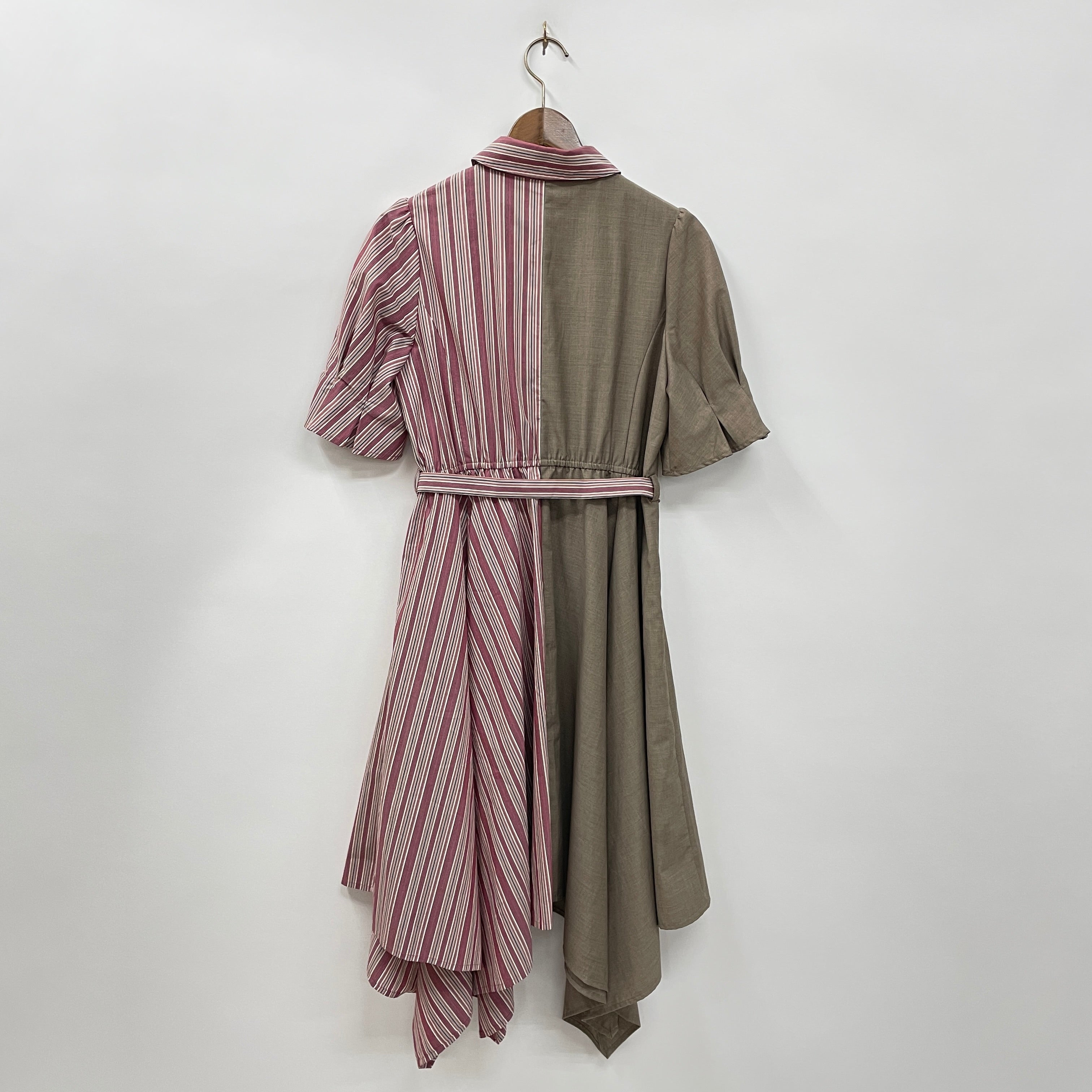 爽やかなマルチストライプと無地生地を使用したバイカラーなシャツタイプのワンピースです。イレギュラーヘムとタックデザインのお袖が他にはないアイテム♪