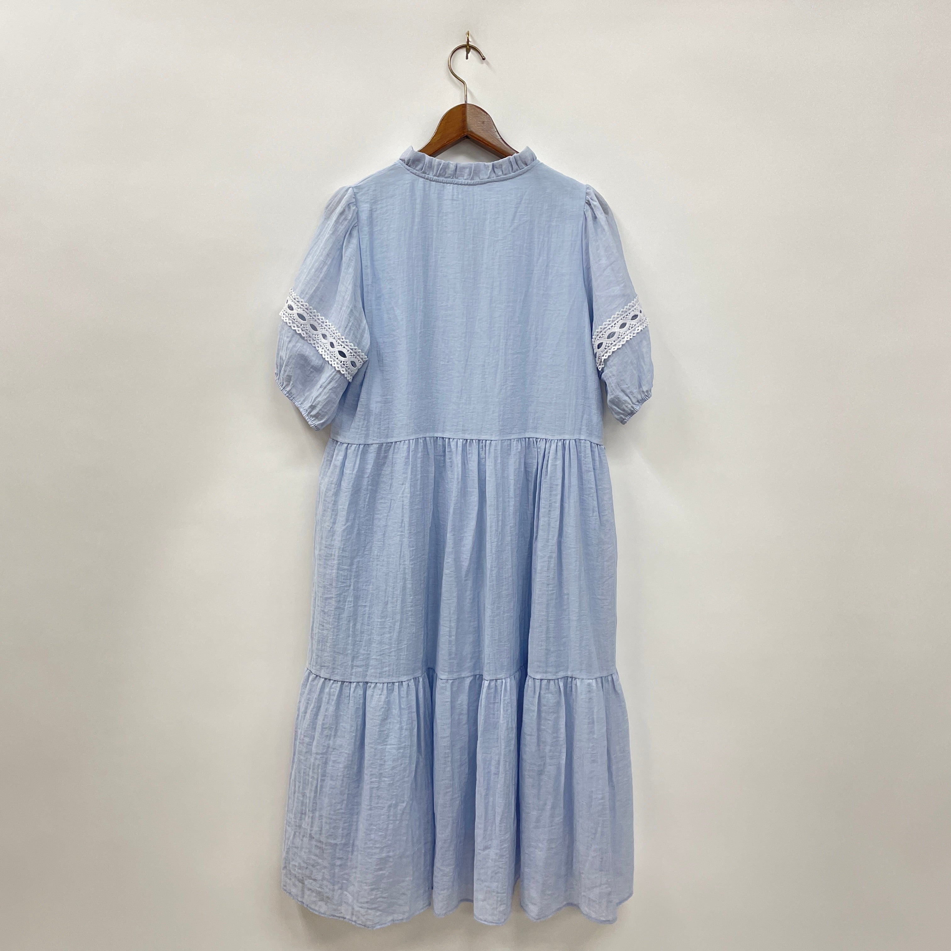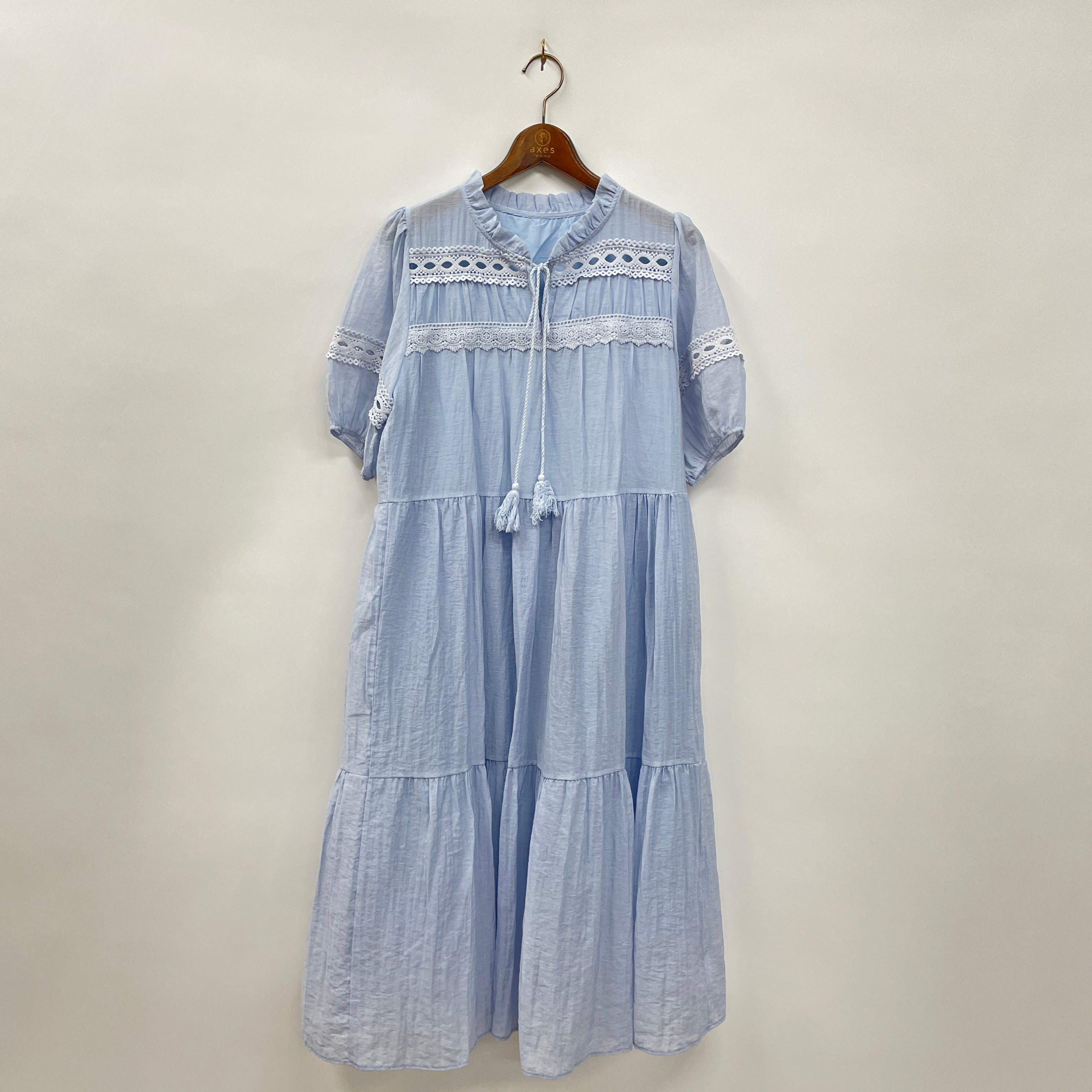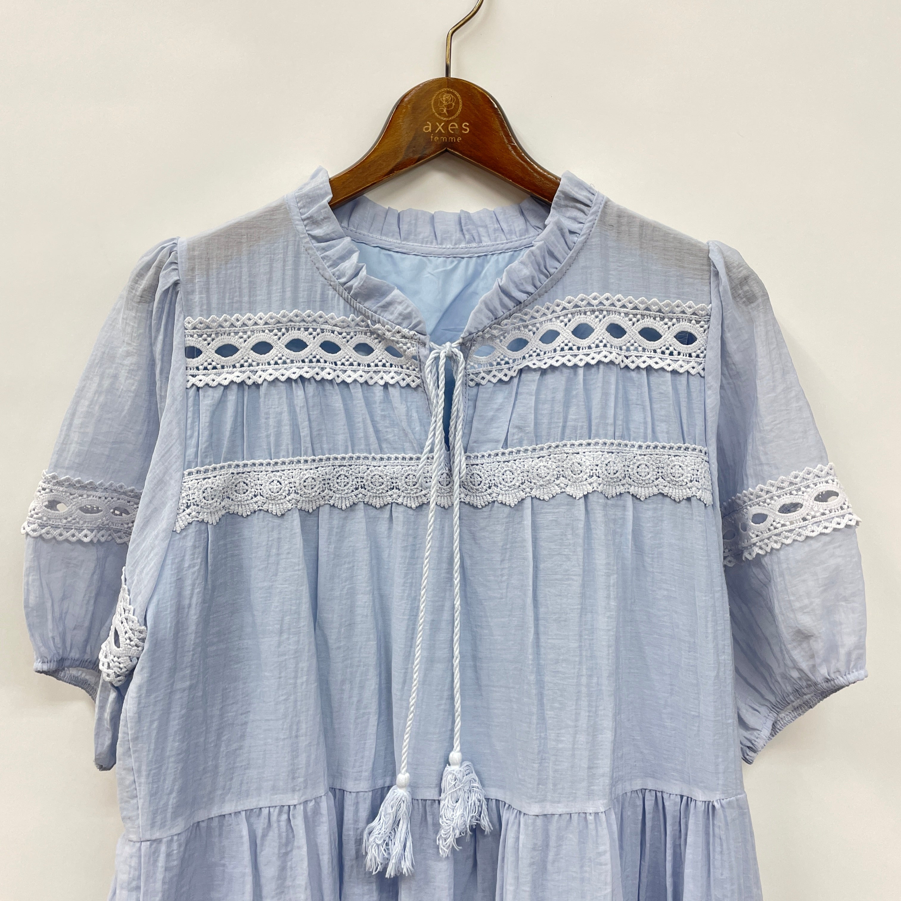 胸元や袖にあしらわれたレースやピンタックが繊細で、ディテールまで抜かりないこだわりのデザイン。ティアード切り替えによる立体感のあるシルエットで、ボディラインを拾わずナチュラルに着られます。