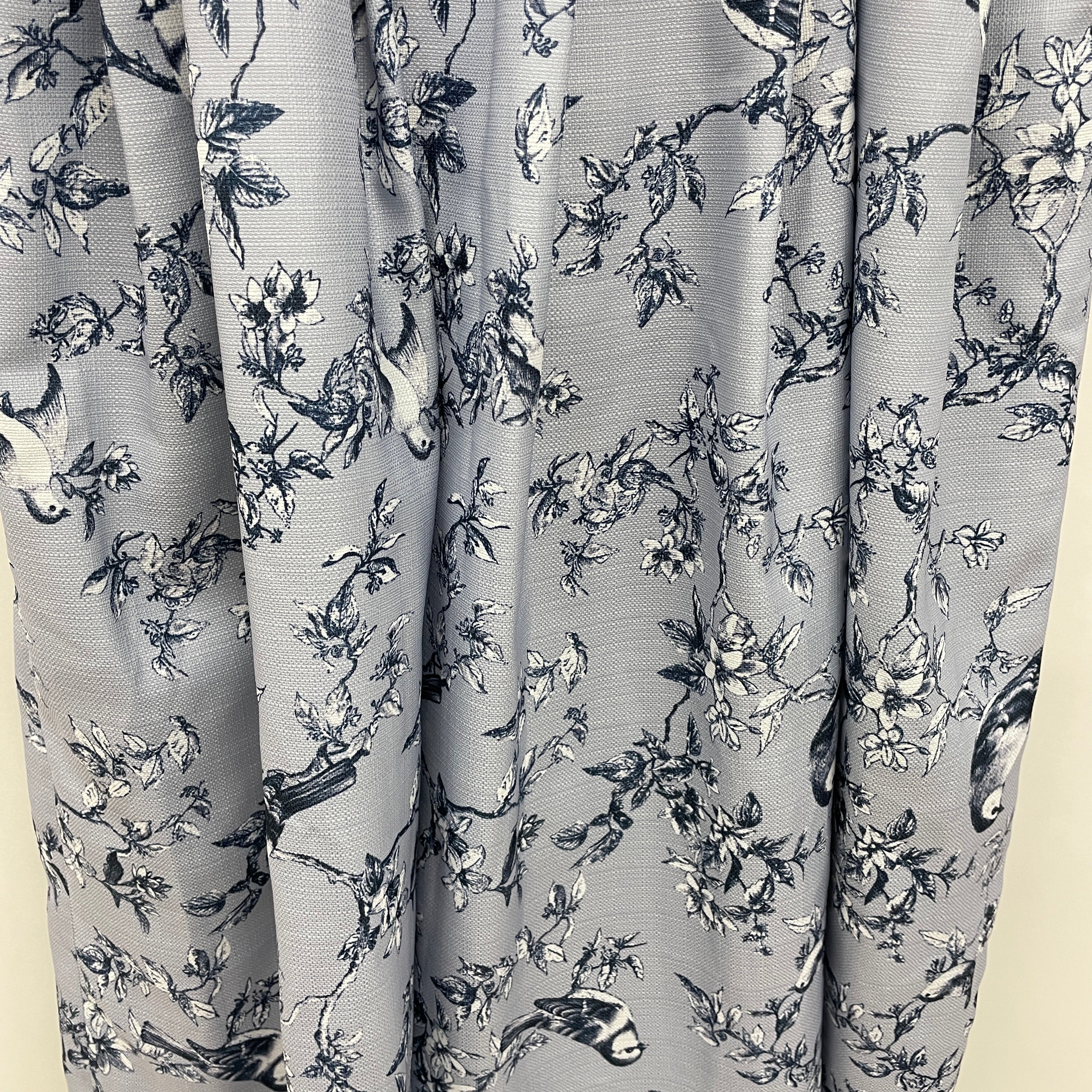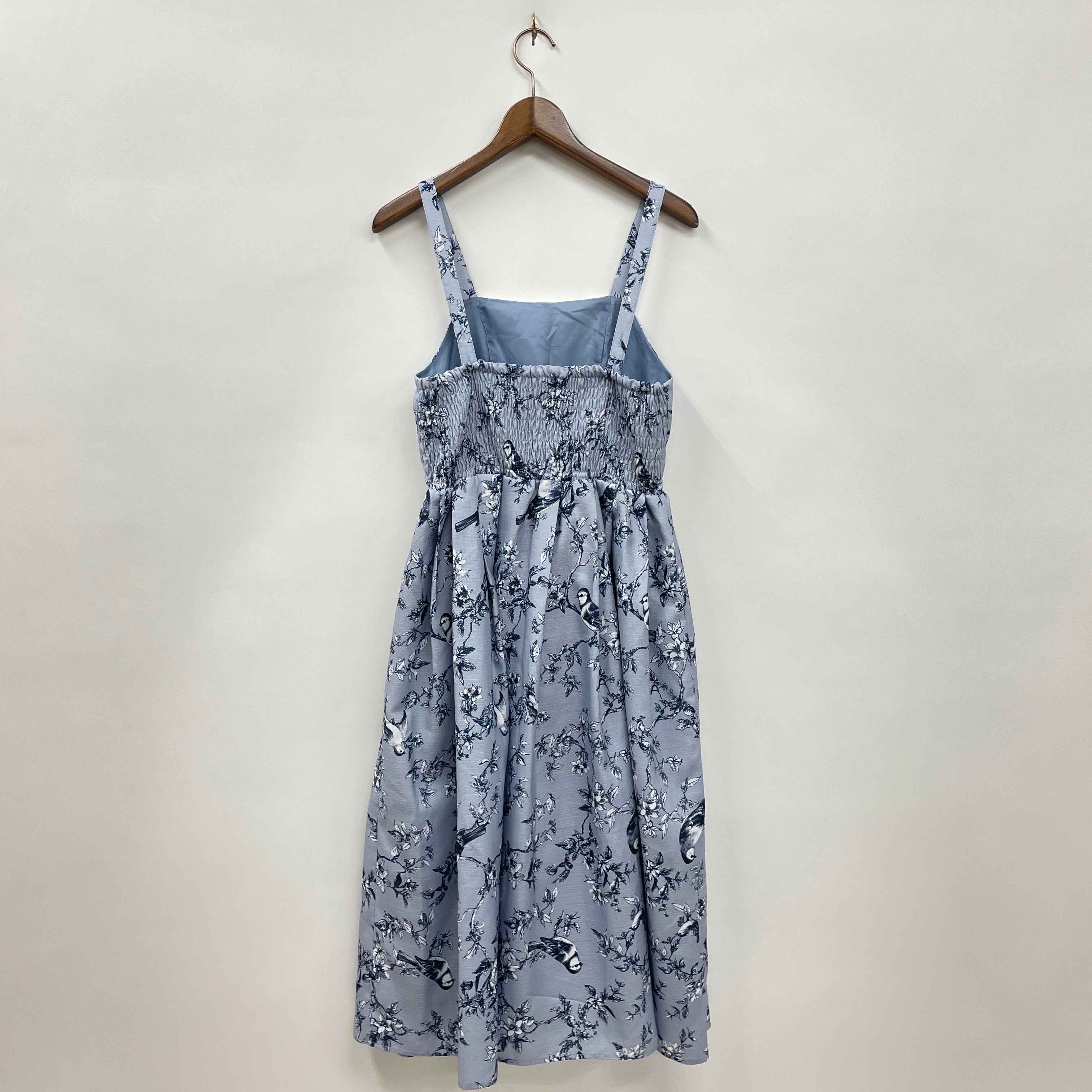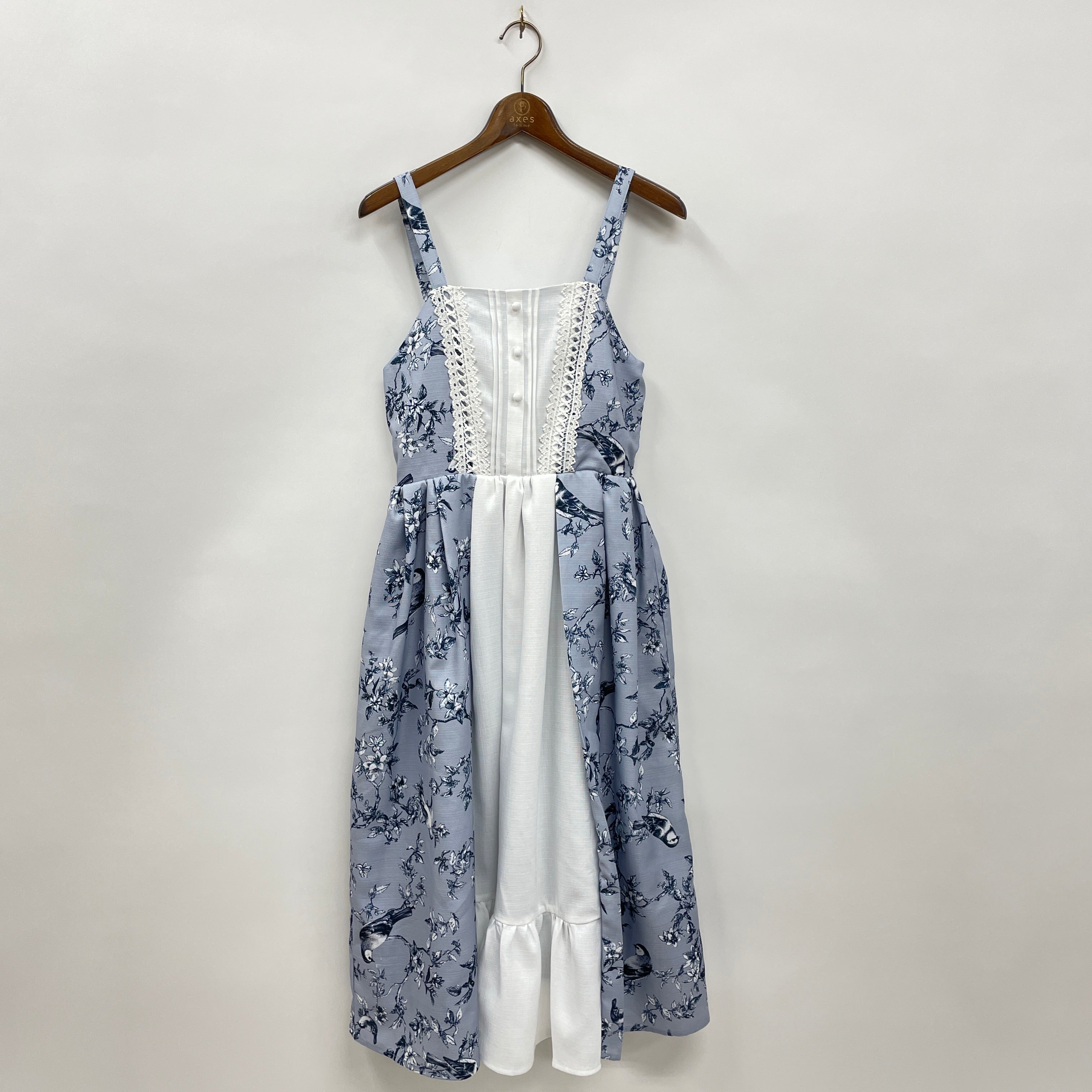 "Quatre Oisillons"(カトルオワジヨン)はフランス語で4羽の小鳥という意味です。トワルドジュイ風の柄の中には4羽の小鳥が描かれています。真ん中が無地の切り替えになったジャンパースカートは夏にぴったりの麻調の生地になっています。麦わら帽子や籠バッグと合わせてコーデしたい一着です。