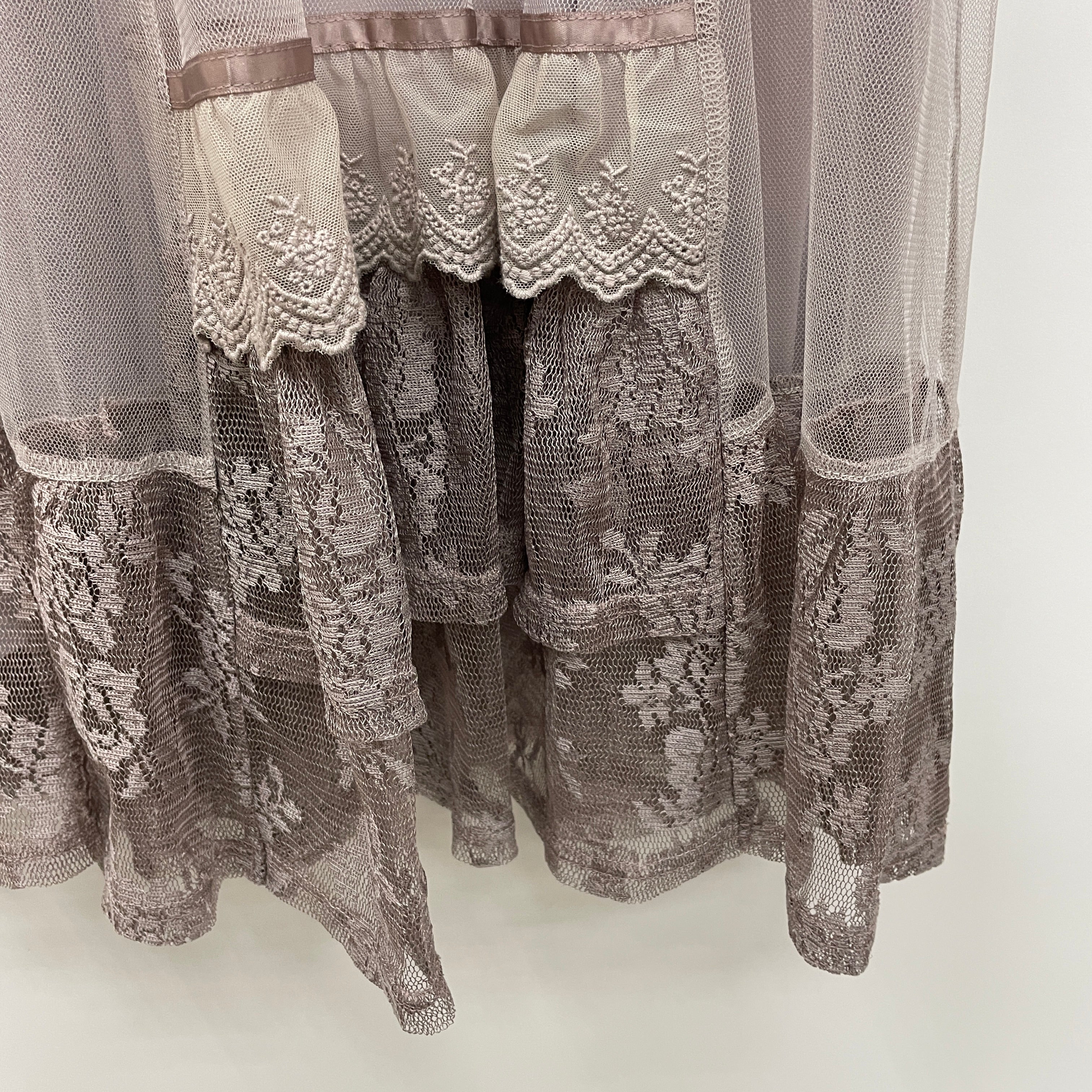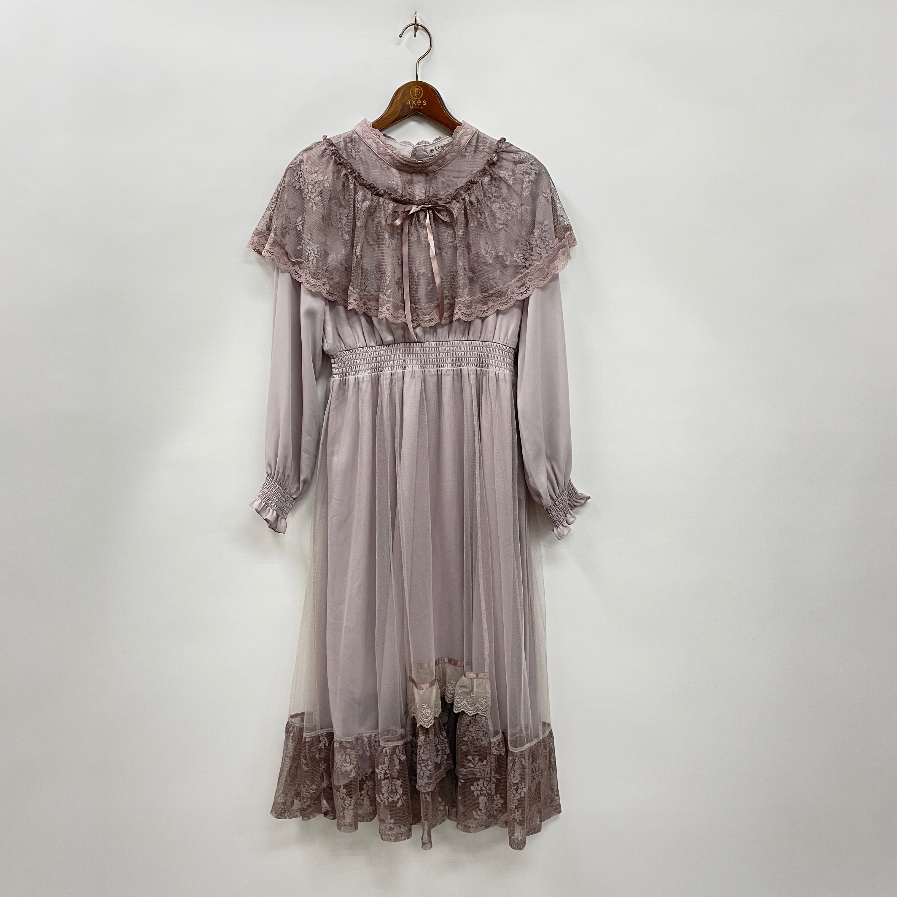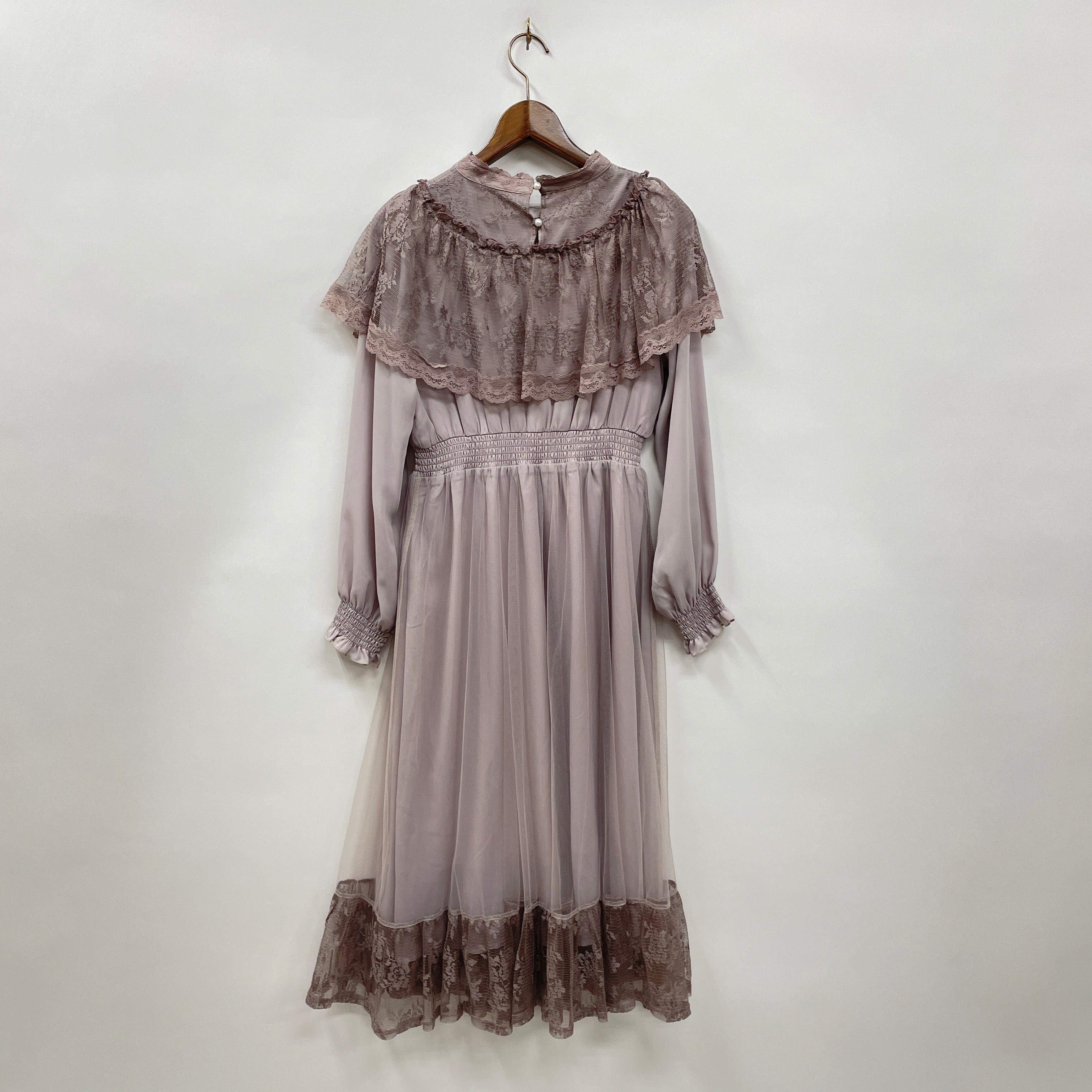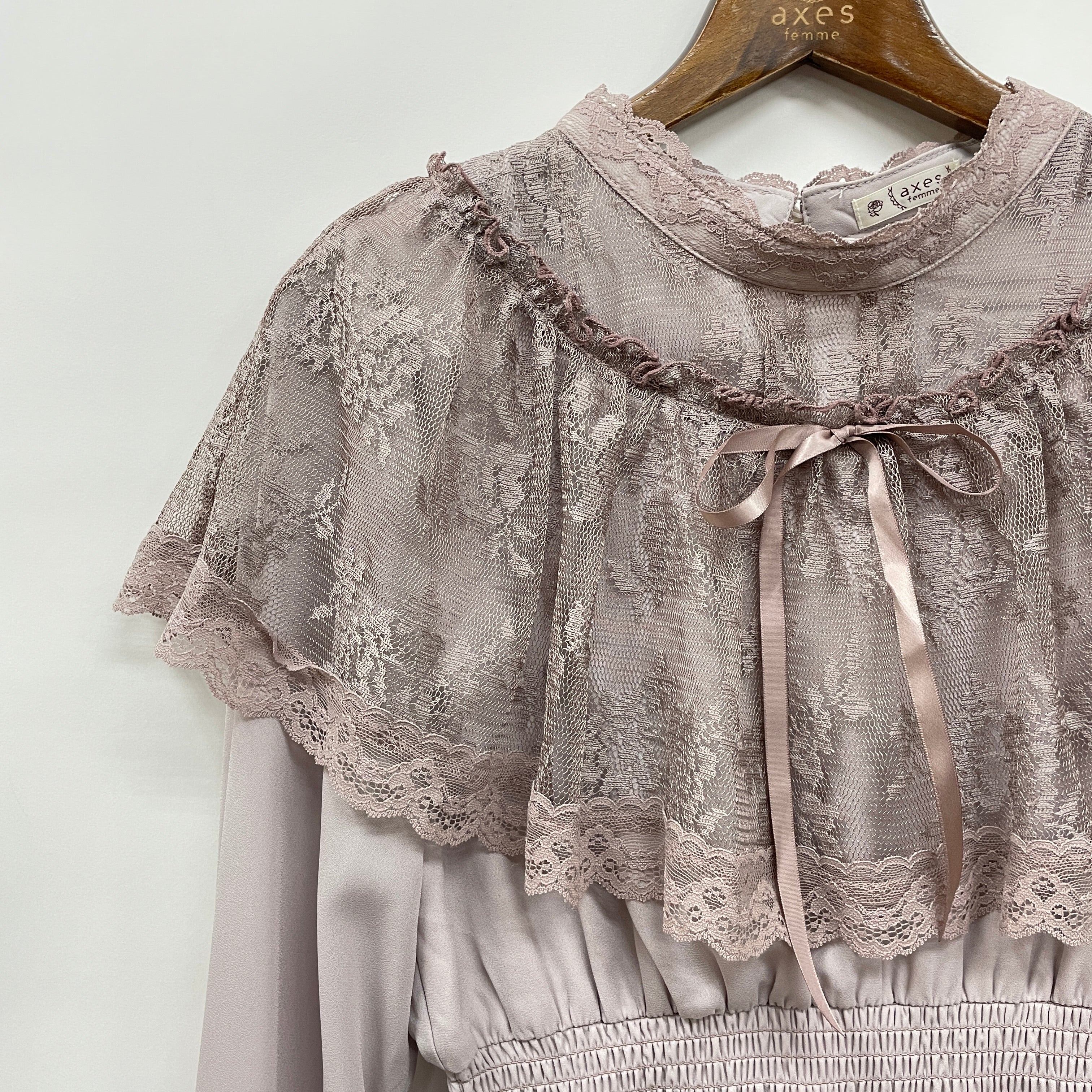 ケープ風のレースデザインが上品な印象に、ウエストはシャーリングゴムで自然ときゅっと絞ったシルエットを作り上げます。お好みでラグジュアリーなベルトやコルセットを合わせたスタイリングもおすすめです。