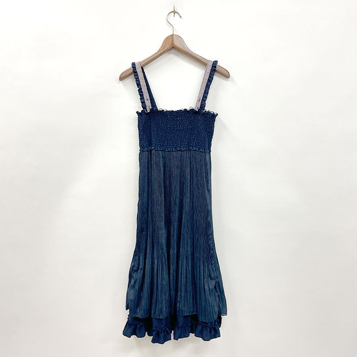 胸元はシャーリングゴム仕様です。適度なフィット感、着心地のよさが◎。肩ひもはボタンで調整可能です。ひもを外しロングスカートとしての着用もおすすめです。小柄な方から高身長の方まで着やすいしデザインに◎。