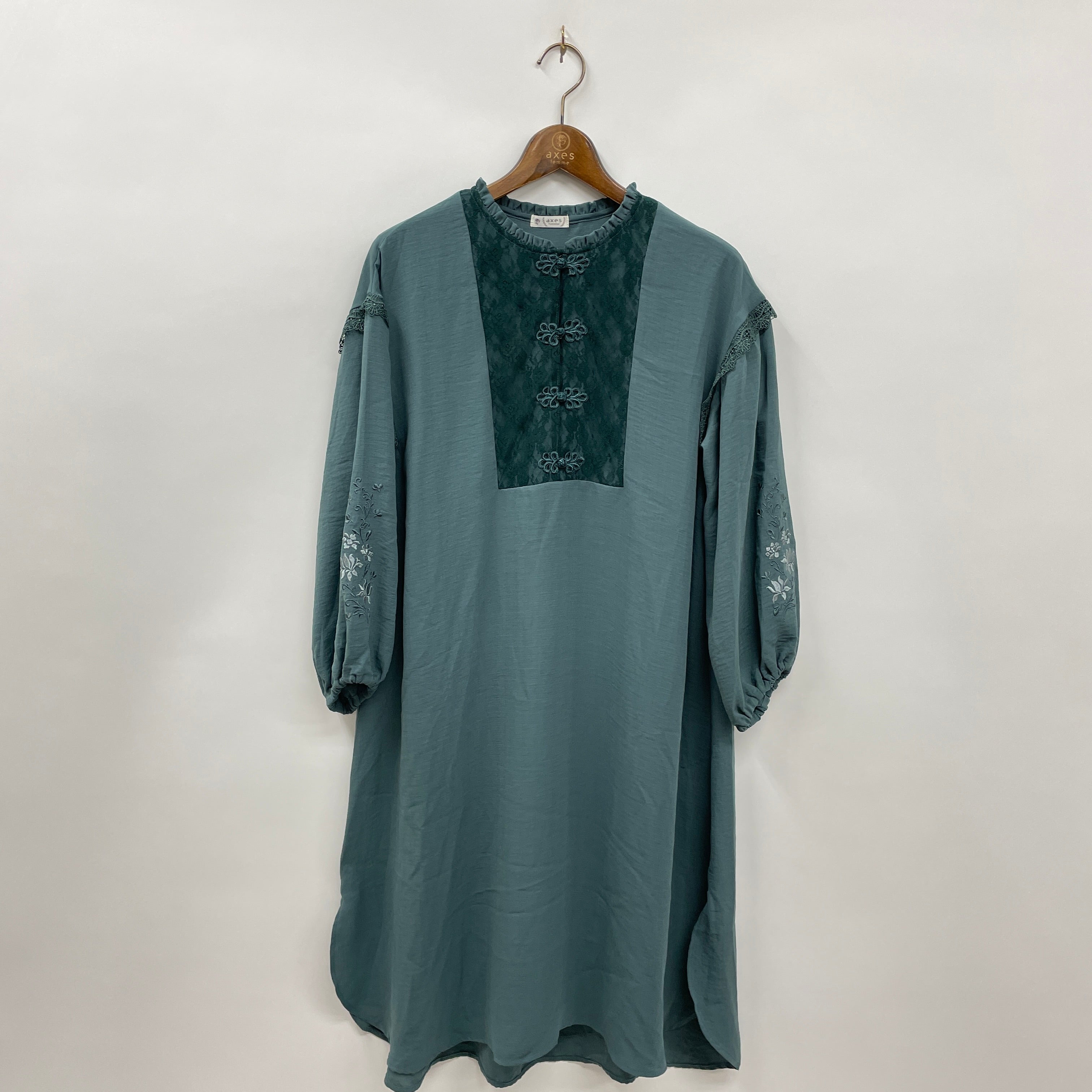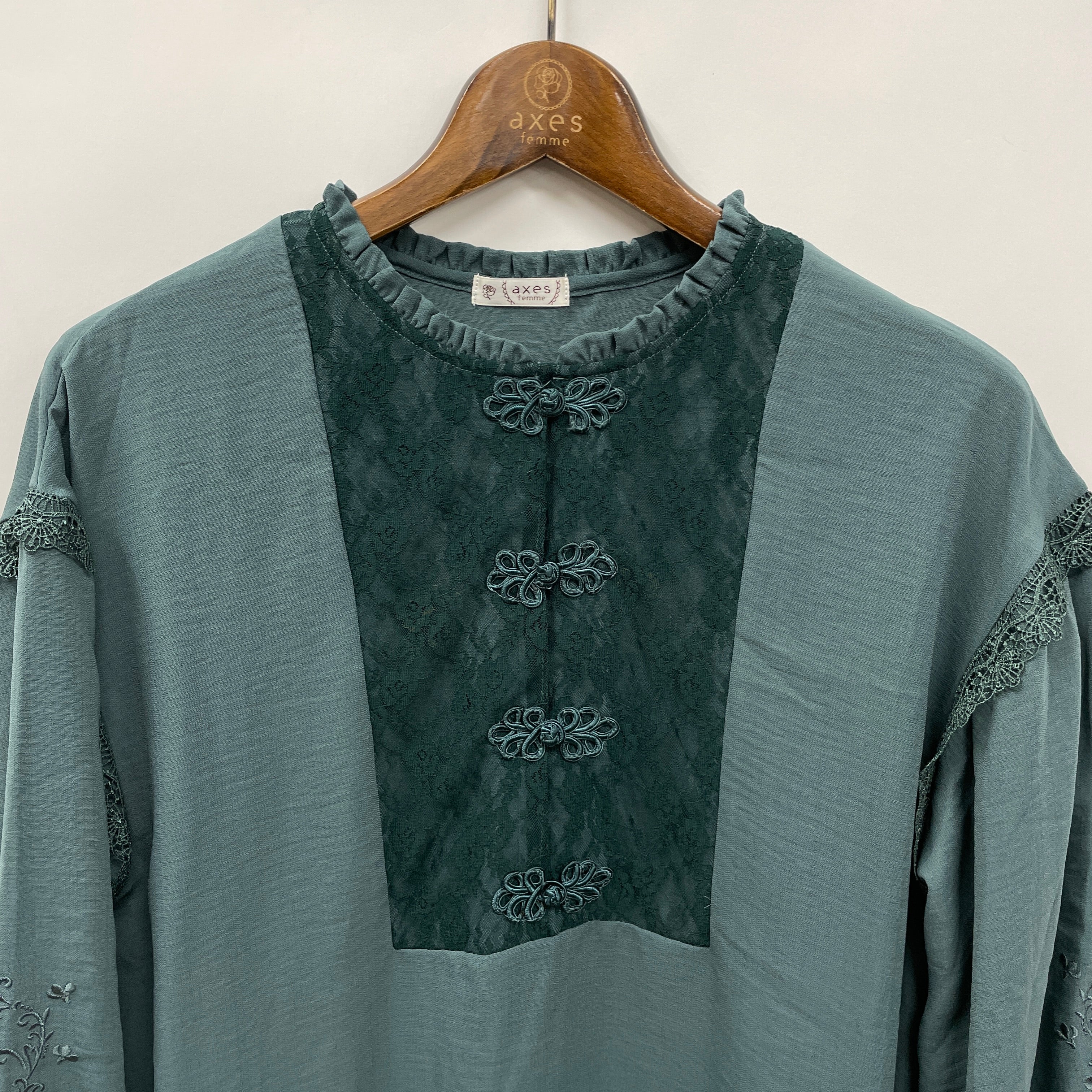 チャイナ釦の周りのヨークにはレースを重ねており、華やかな印象に。