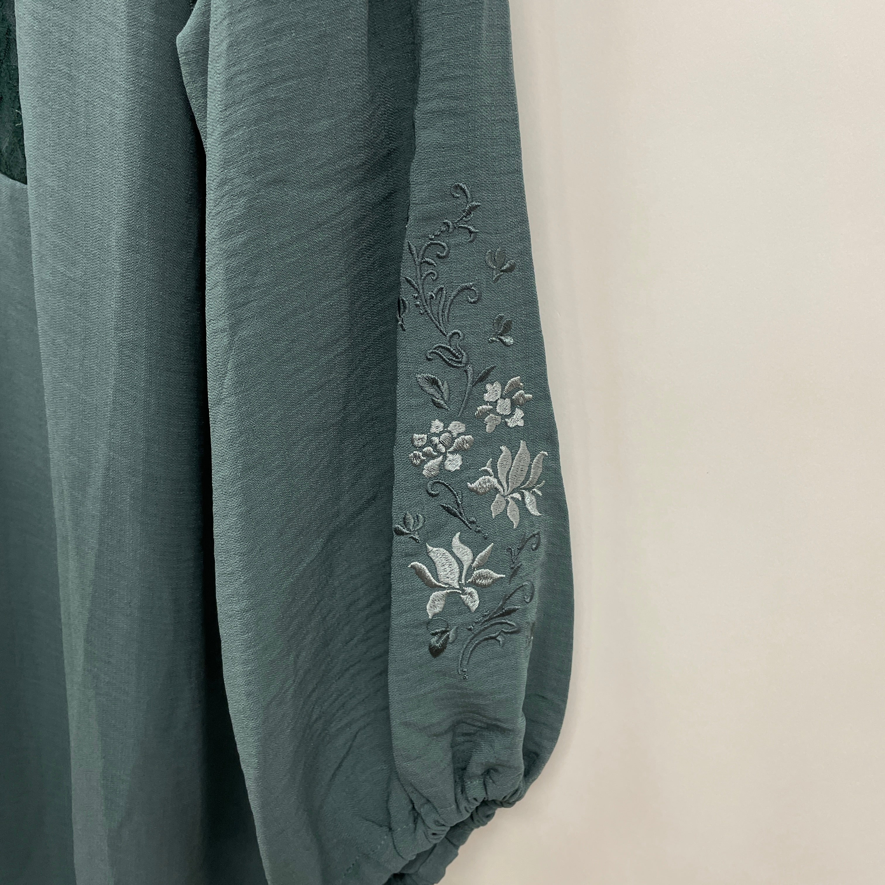 袖にはチャイナ感を彷彿とさせる花刺繍をあしらい、より華やかなデザインになっています。