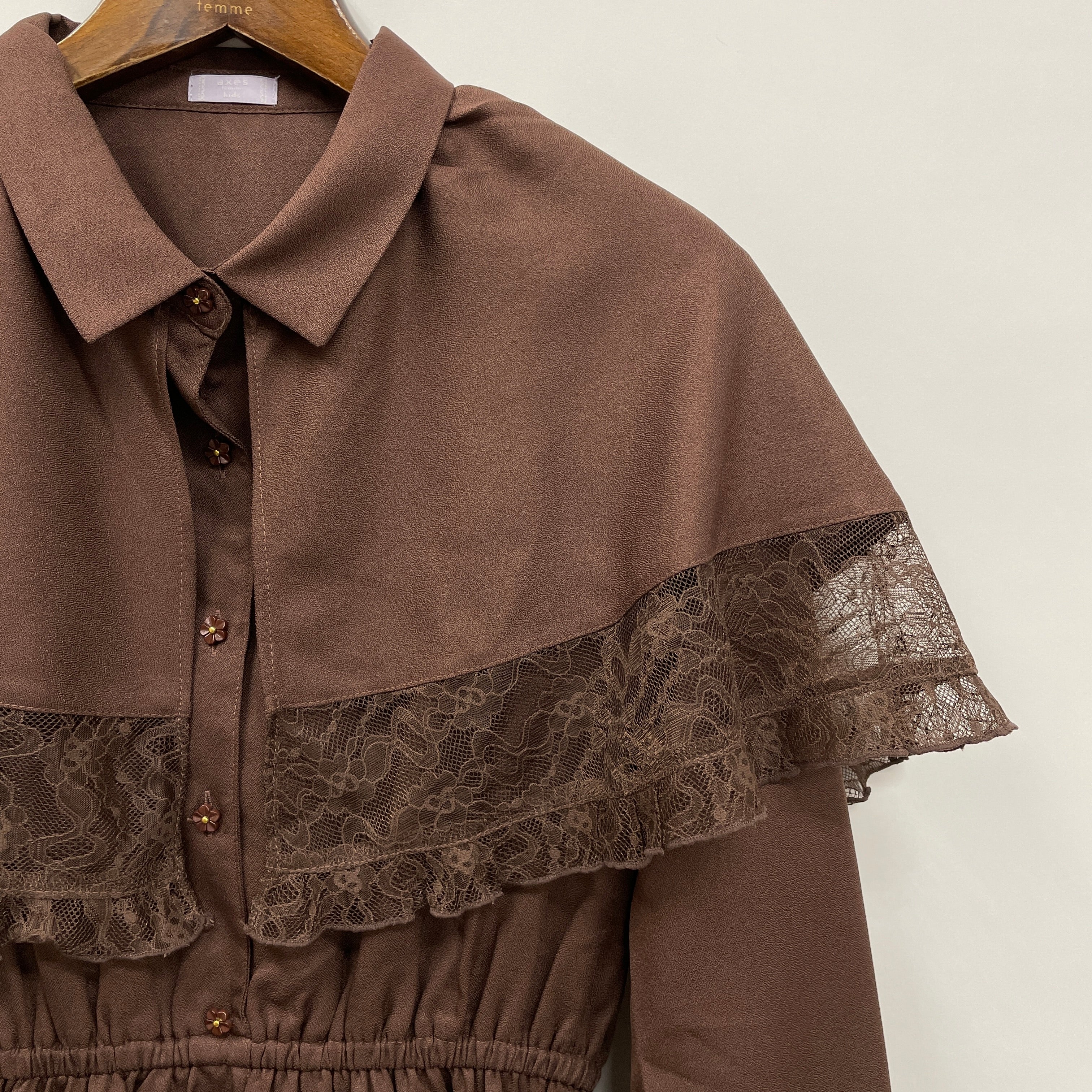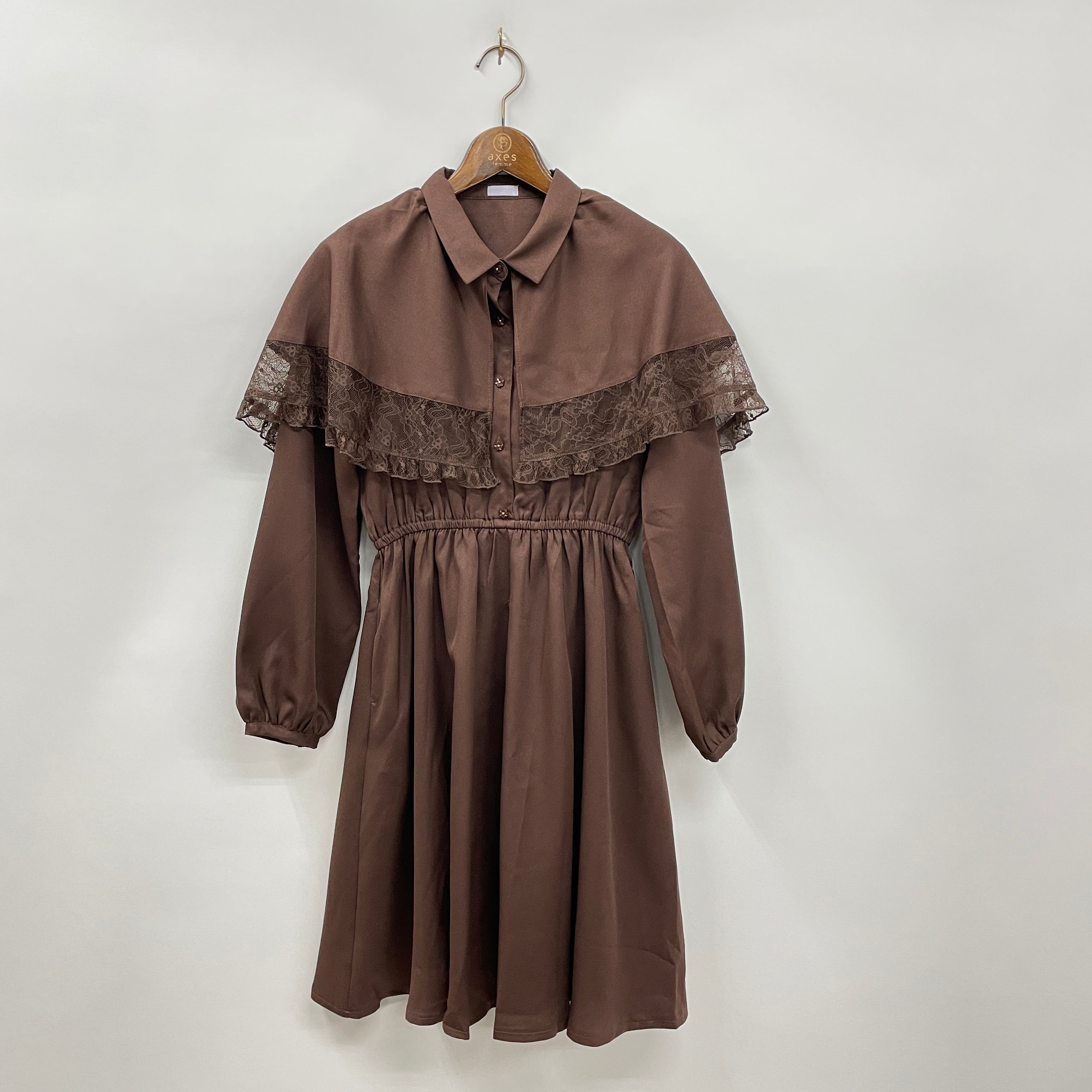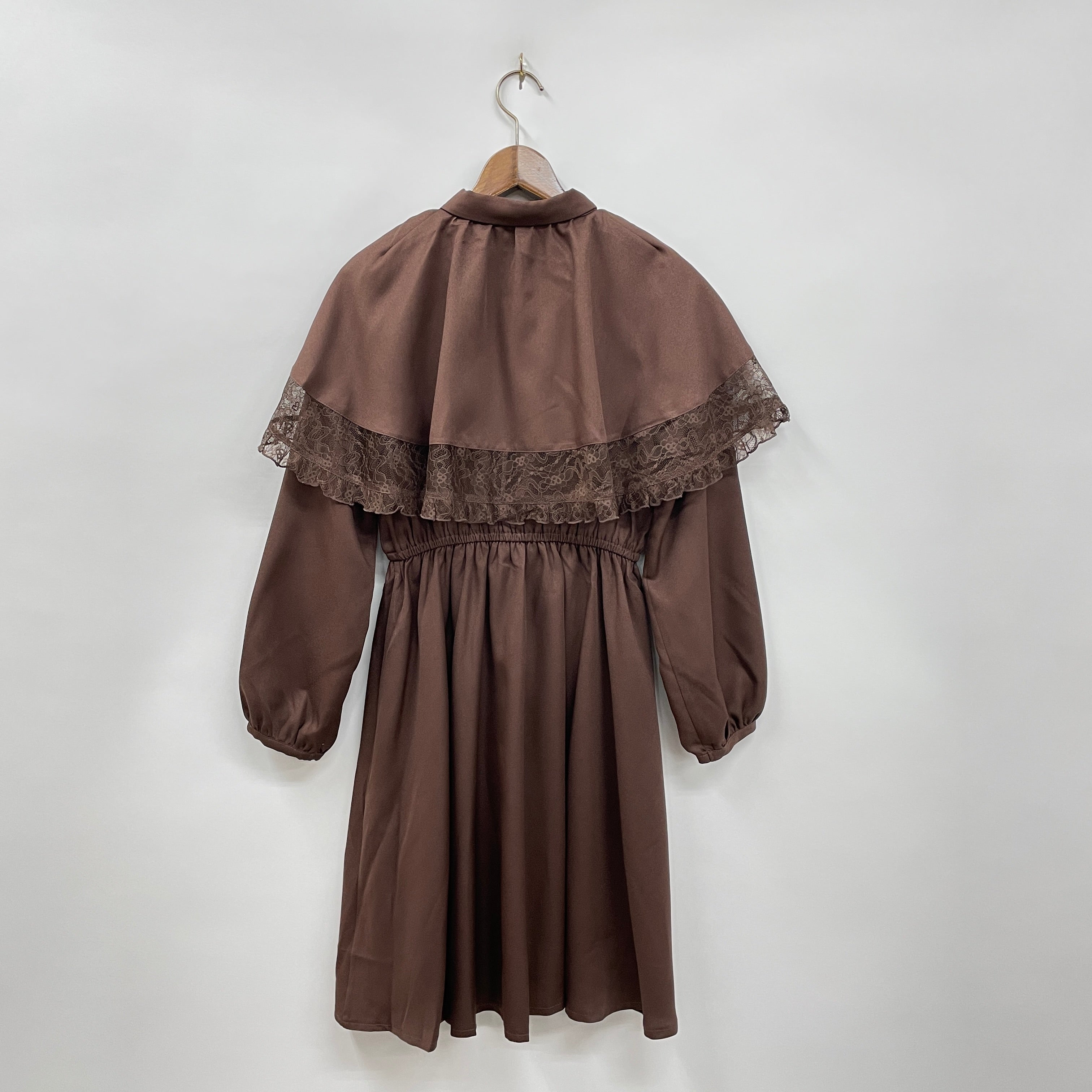 柔らかなジョーゼット生地を使用したケープが軽やかで、レース切替でフェミニンさをプラス。