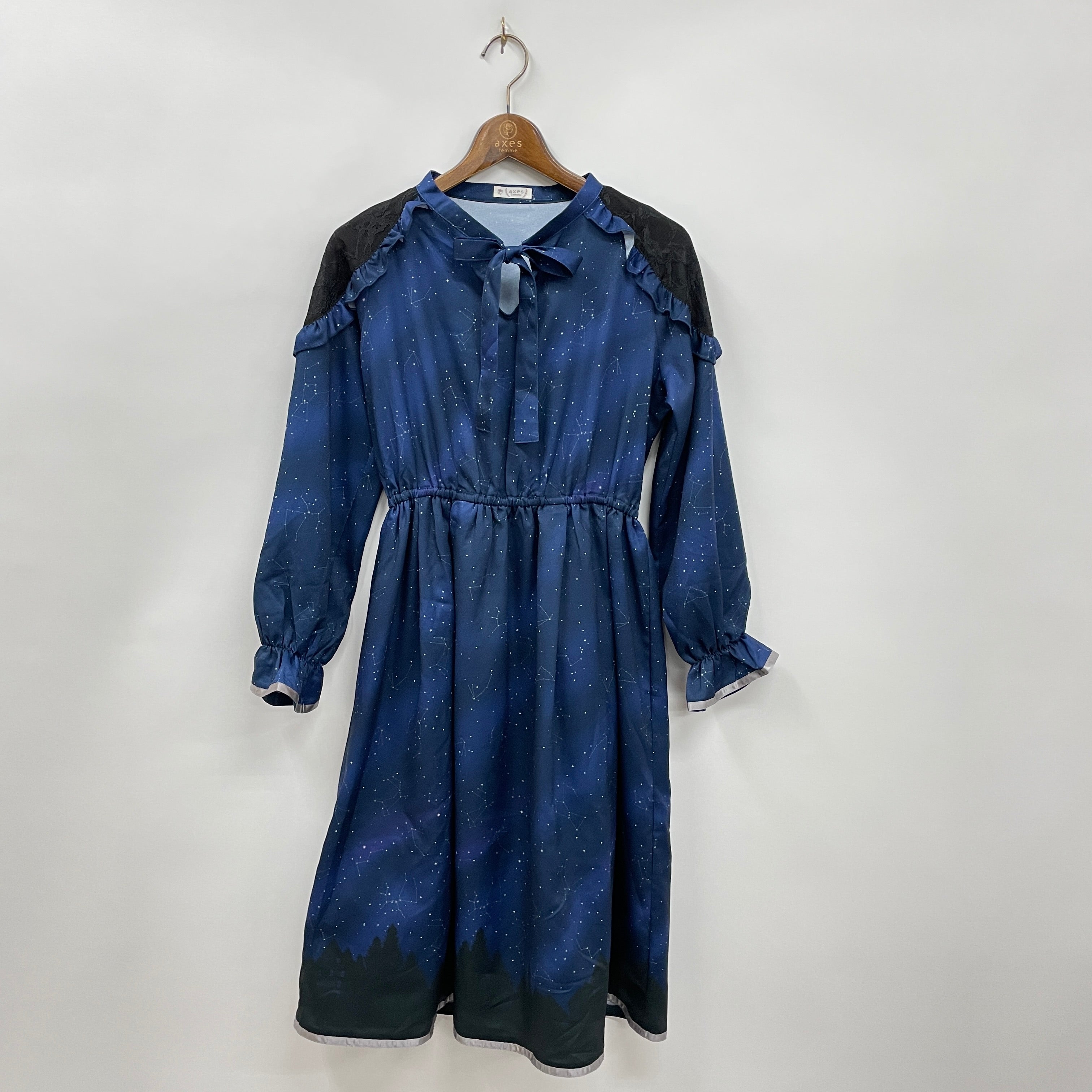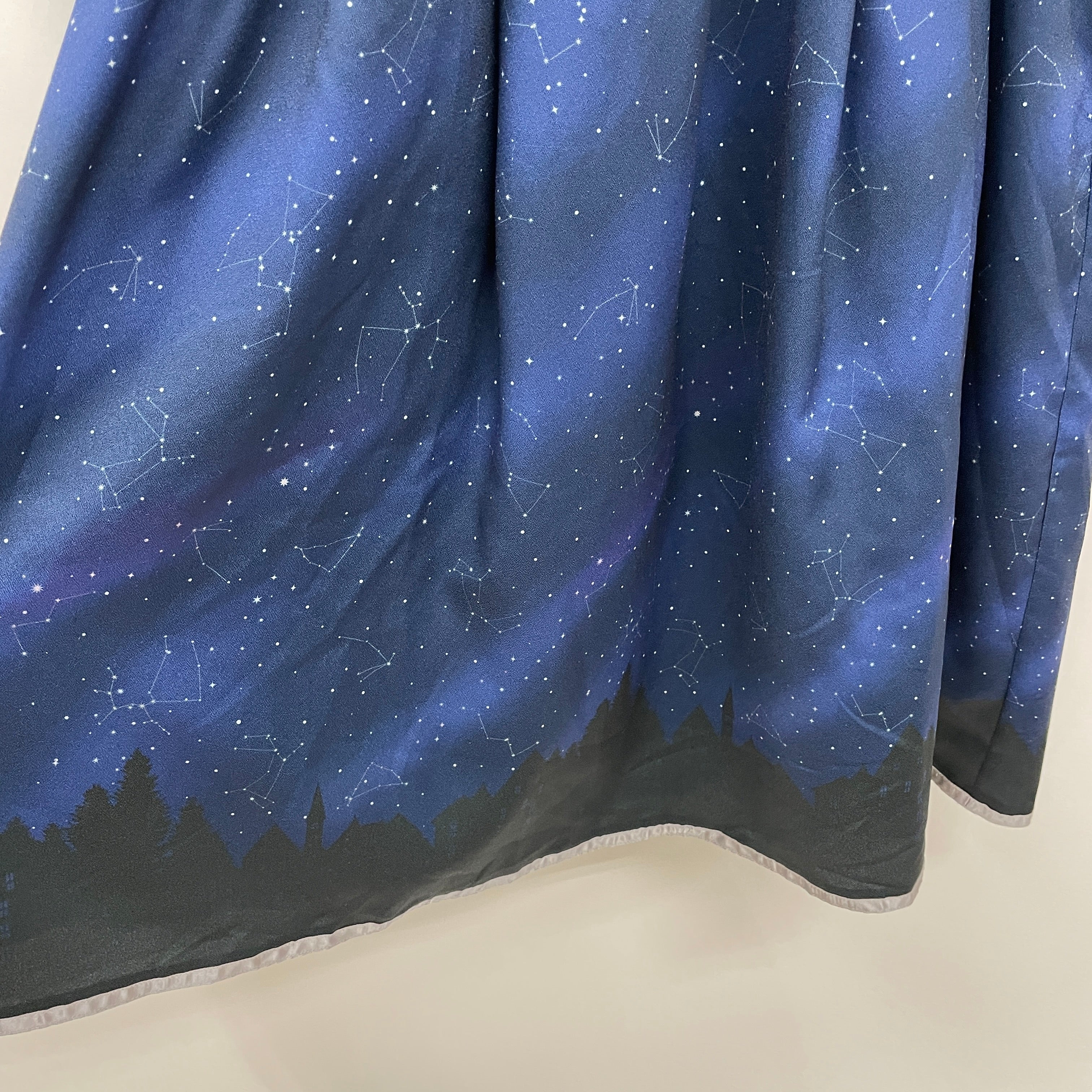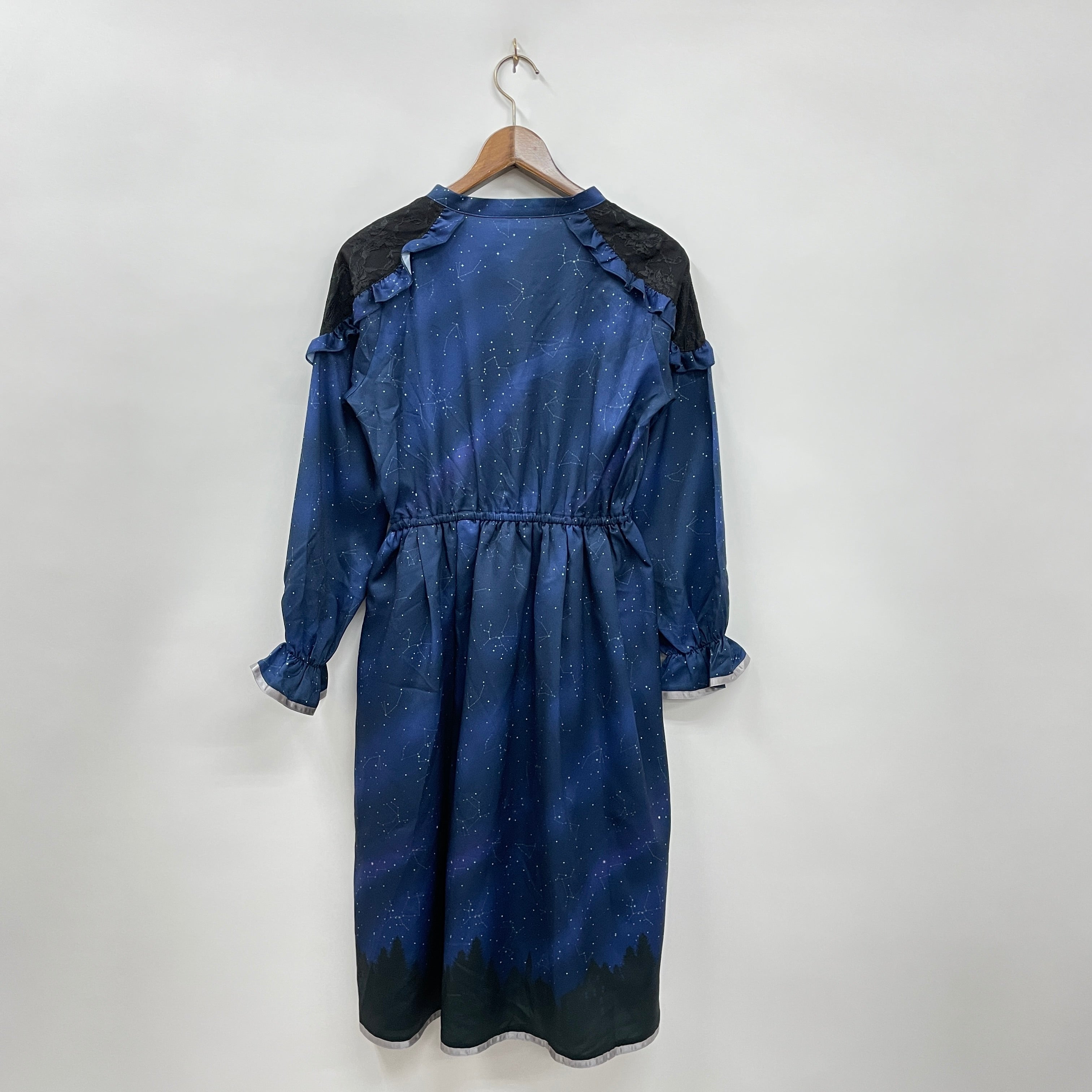 キラキラ光る星座やオーロラなどが、空気の澄んだ冬の夜空を華やかに彩った風景を柄に落とし込んだワンピースです。