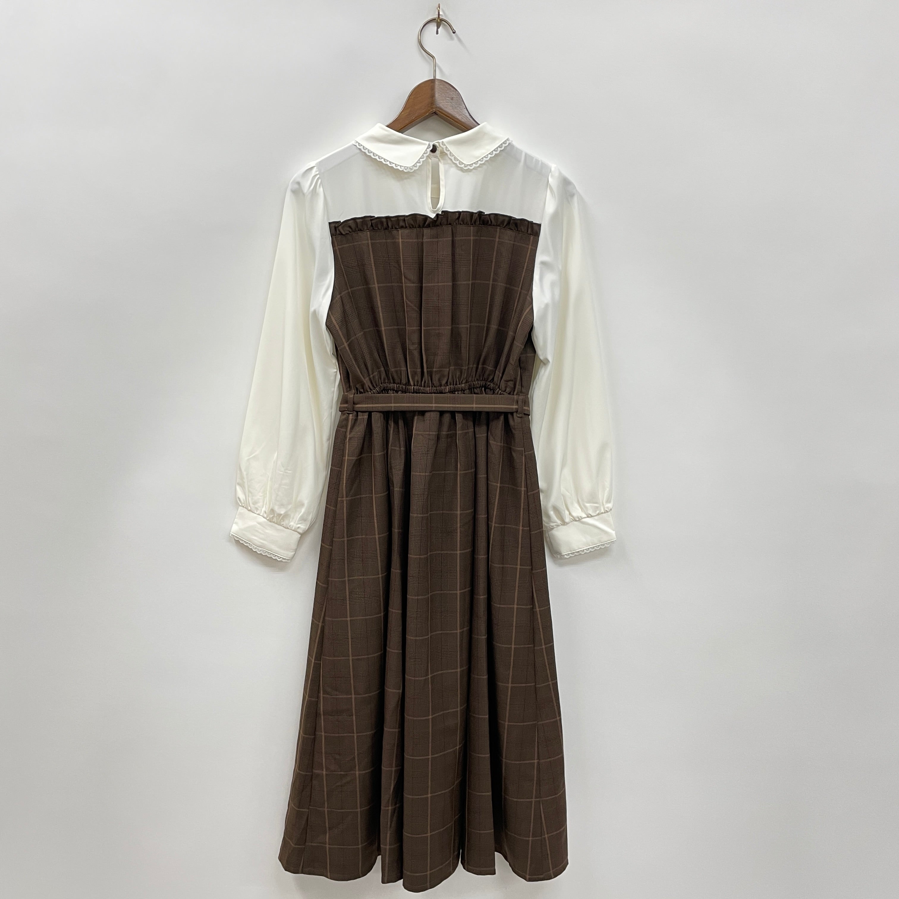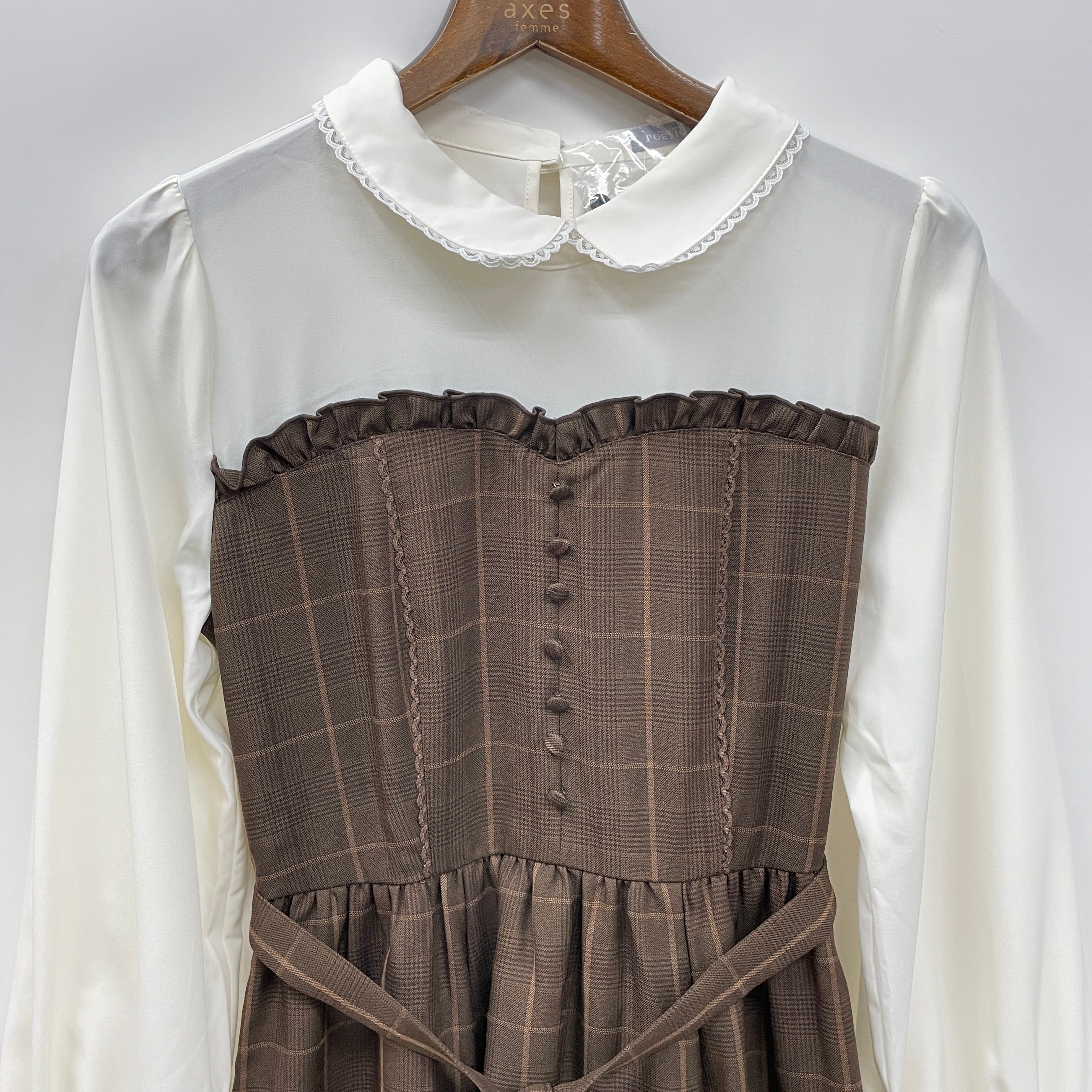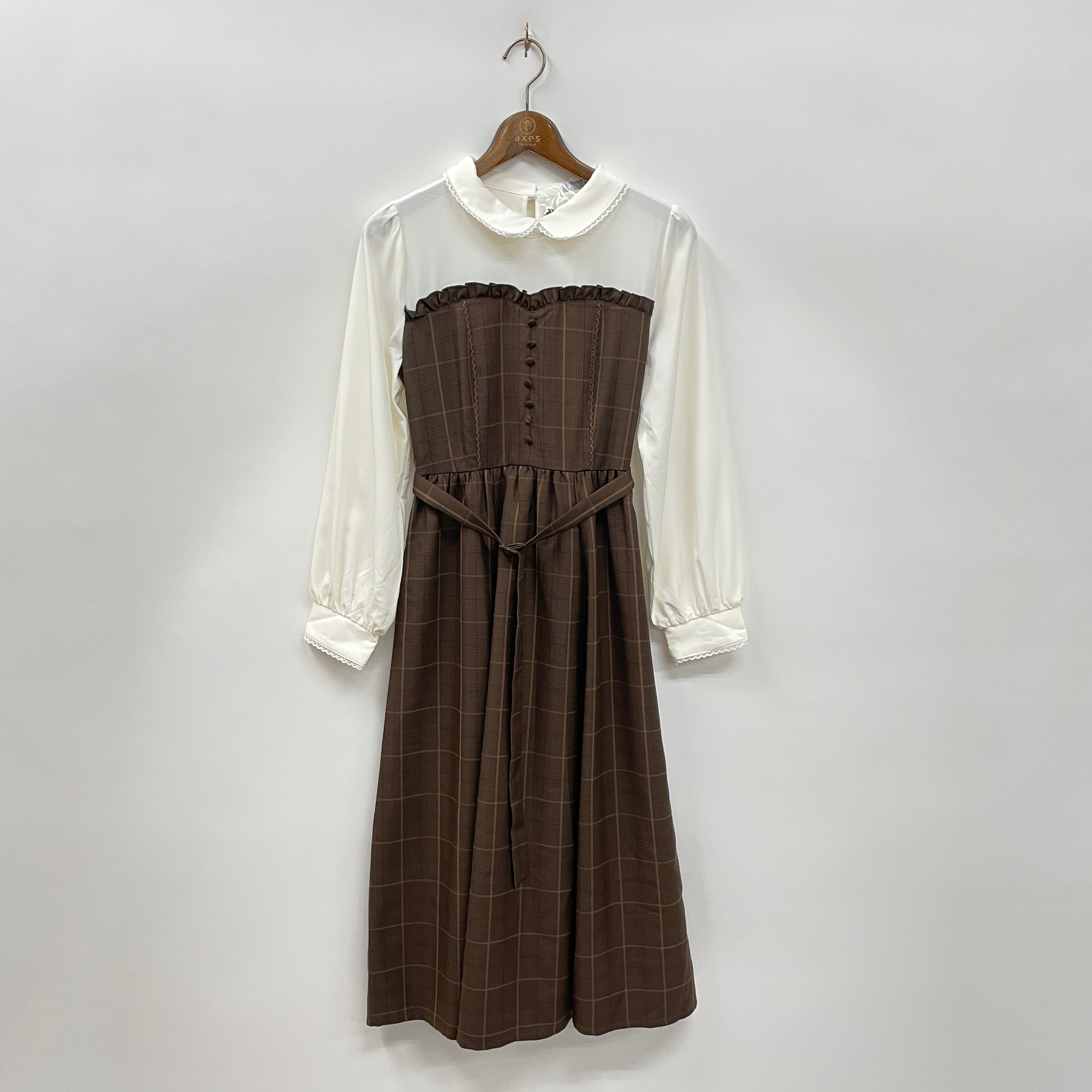 ビスチェ切り替えになったデザインで1枚で着ることができるワンピースです。首元は丸襟でガーリーな印象に。