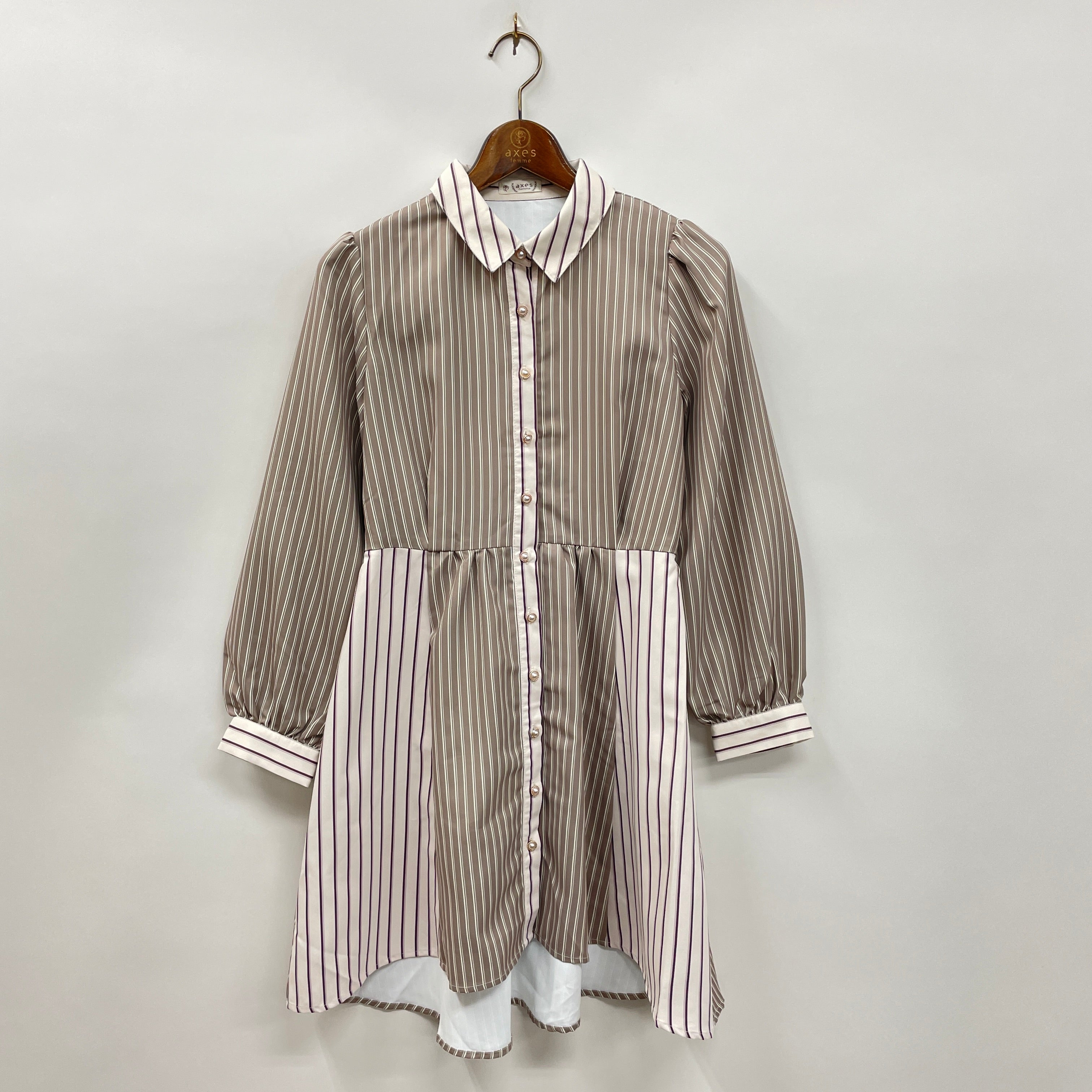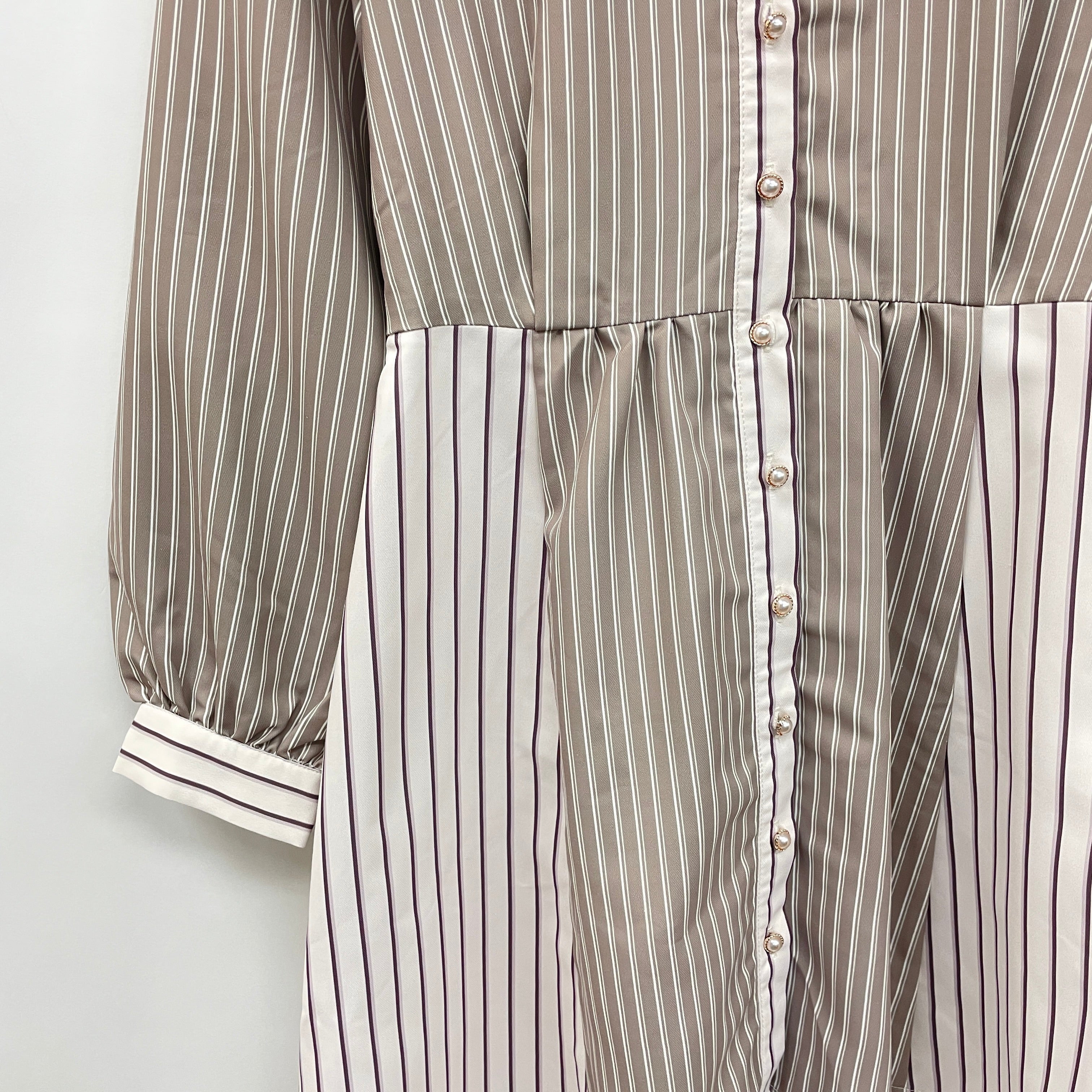 2種類のストライプ生地を切り替えたカジュアルなチュニックです。お色によって印象が変わり、定番のパンツスタイル、スカートを合わせてワンピース風、ボタンを開けて羽織としてなど、様々な着こなしが楽しめます。