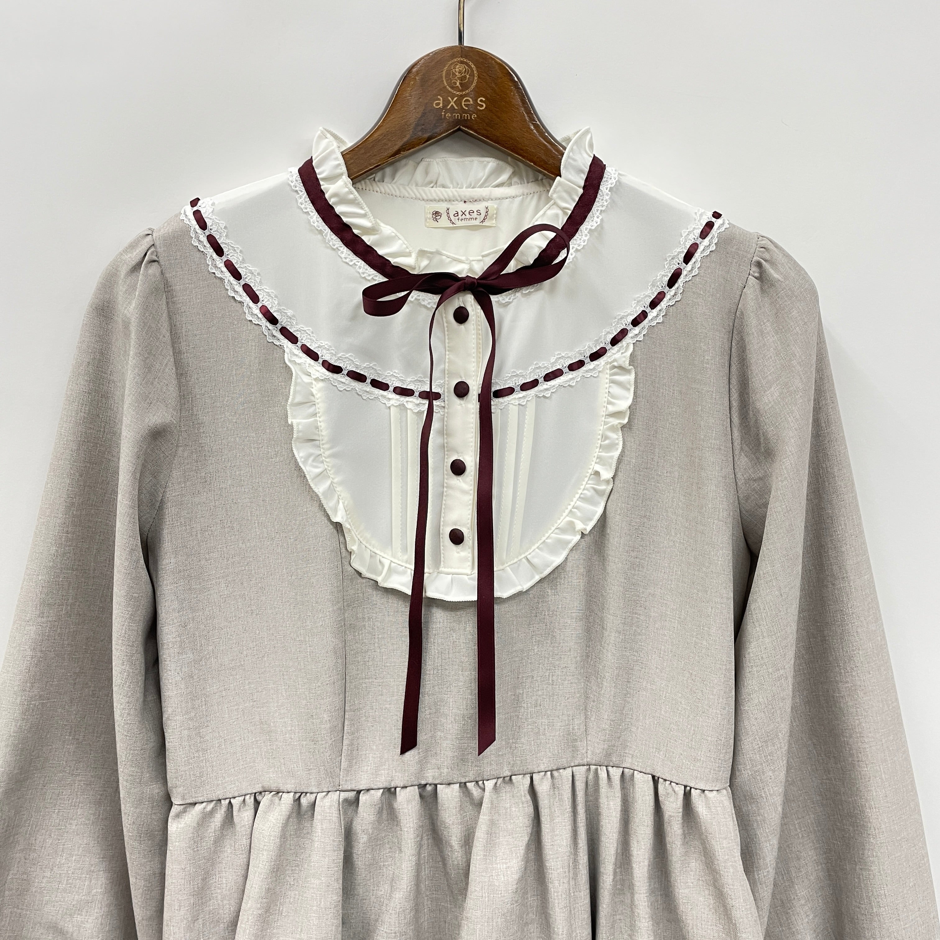 ヨークにあしらわれた梯子レースやリボン使いがポイント。
