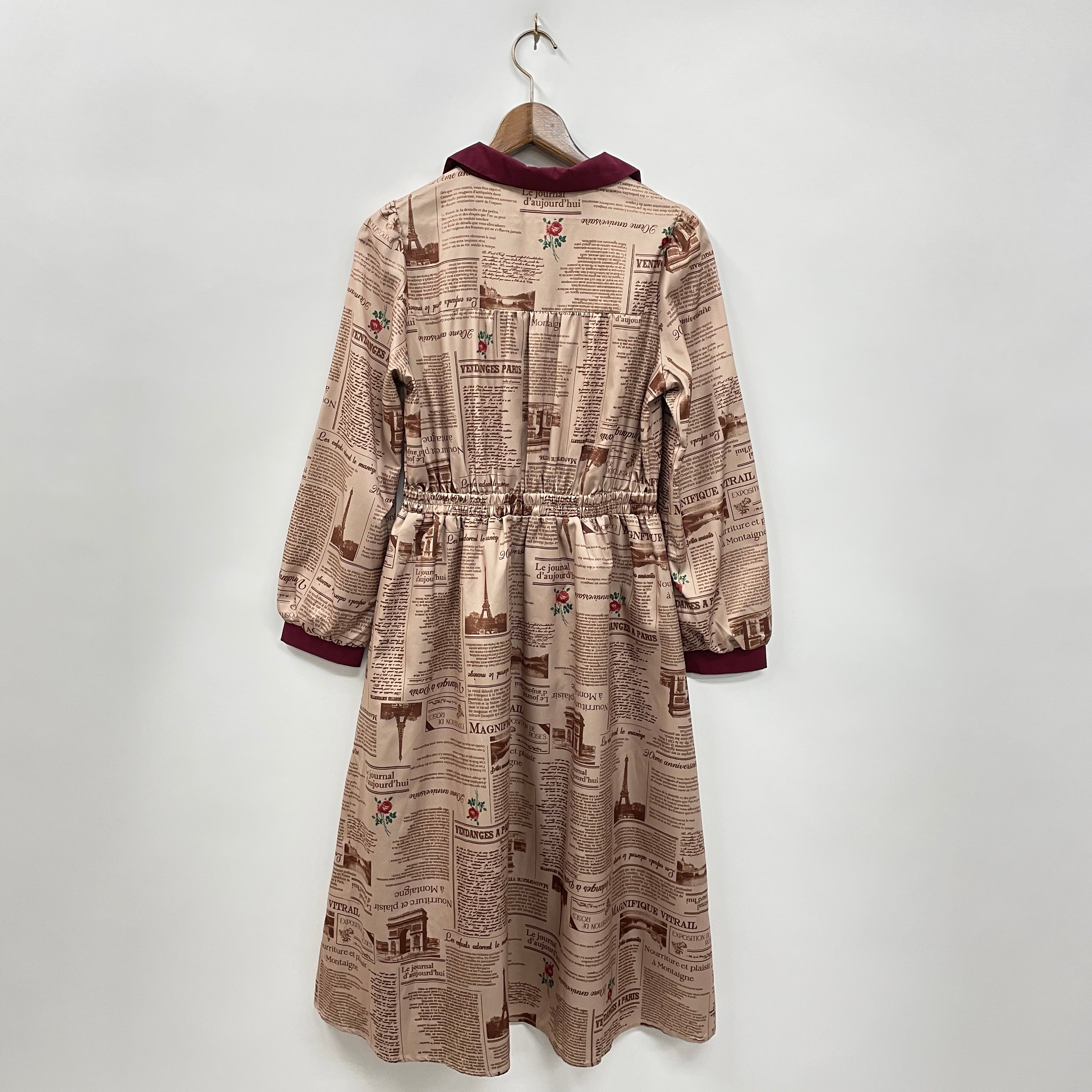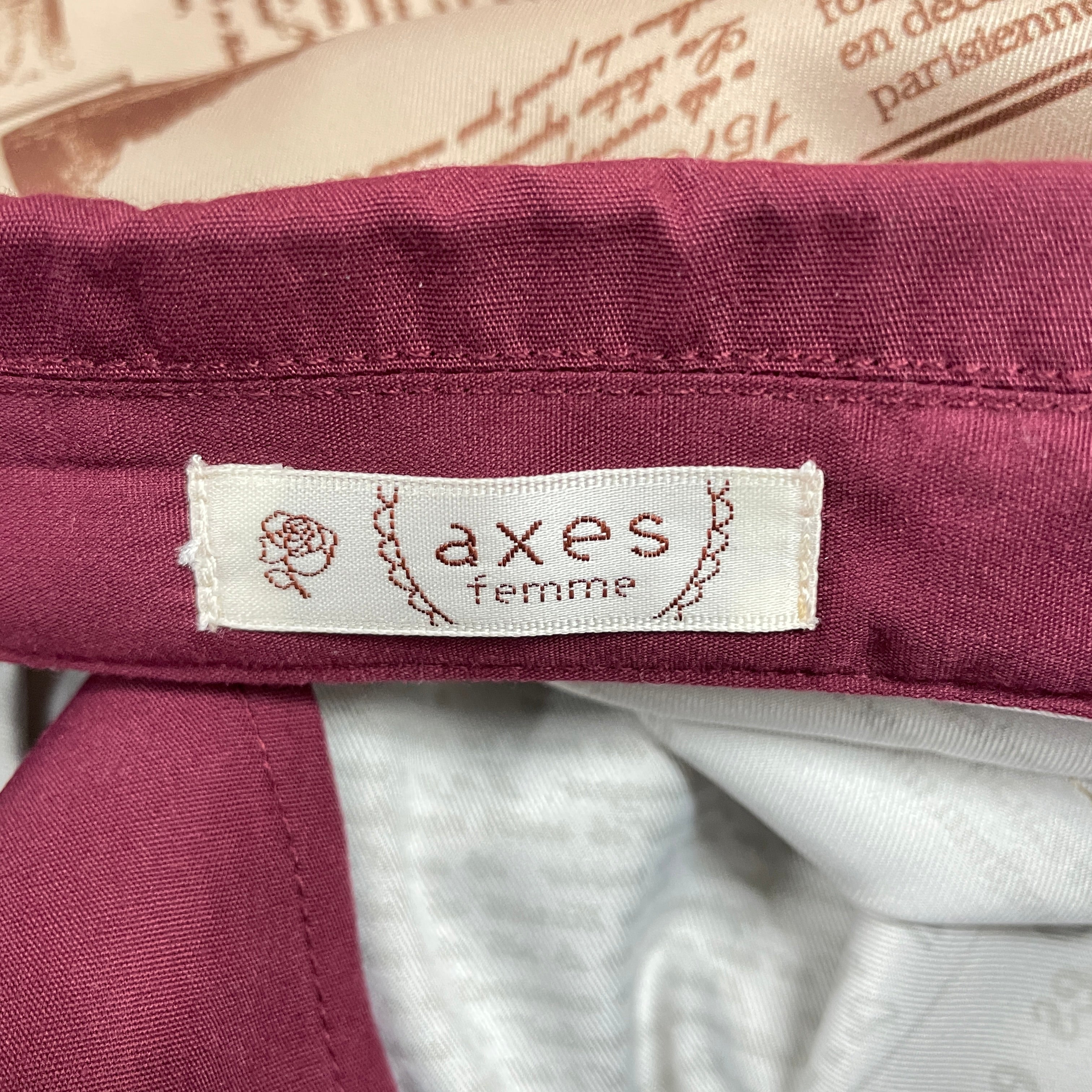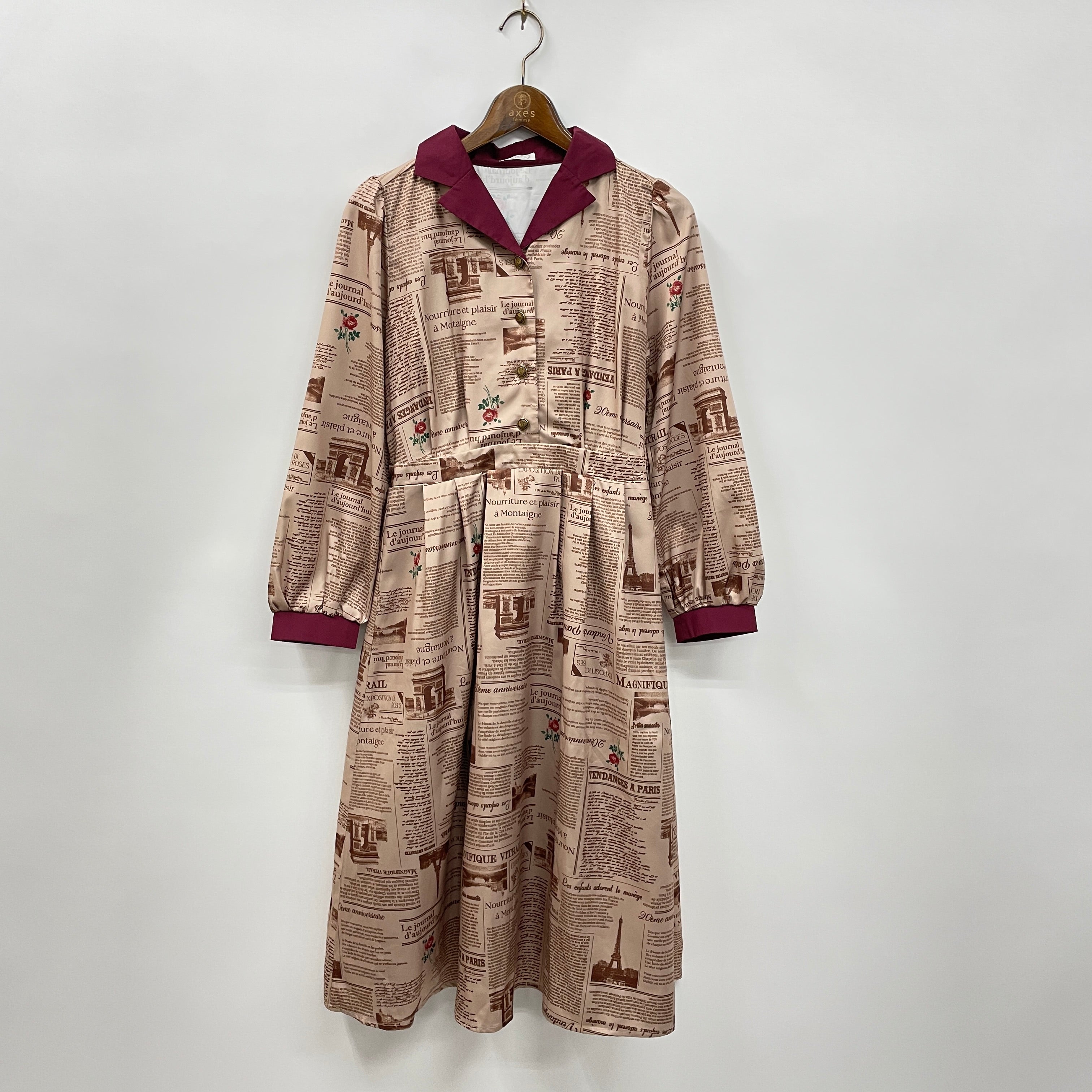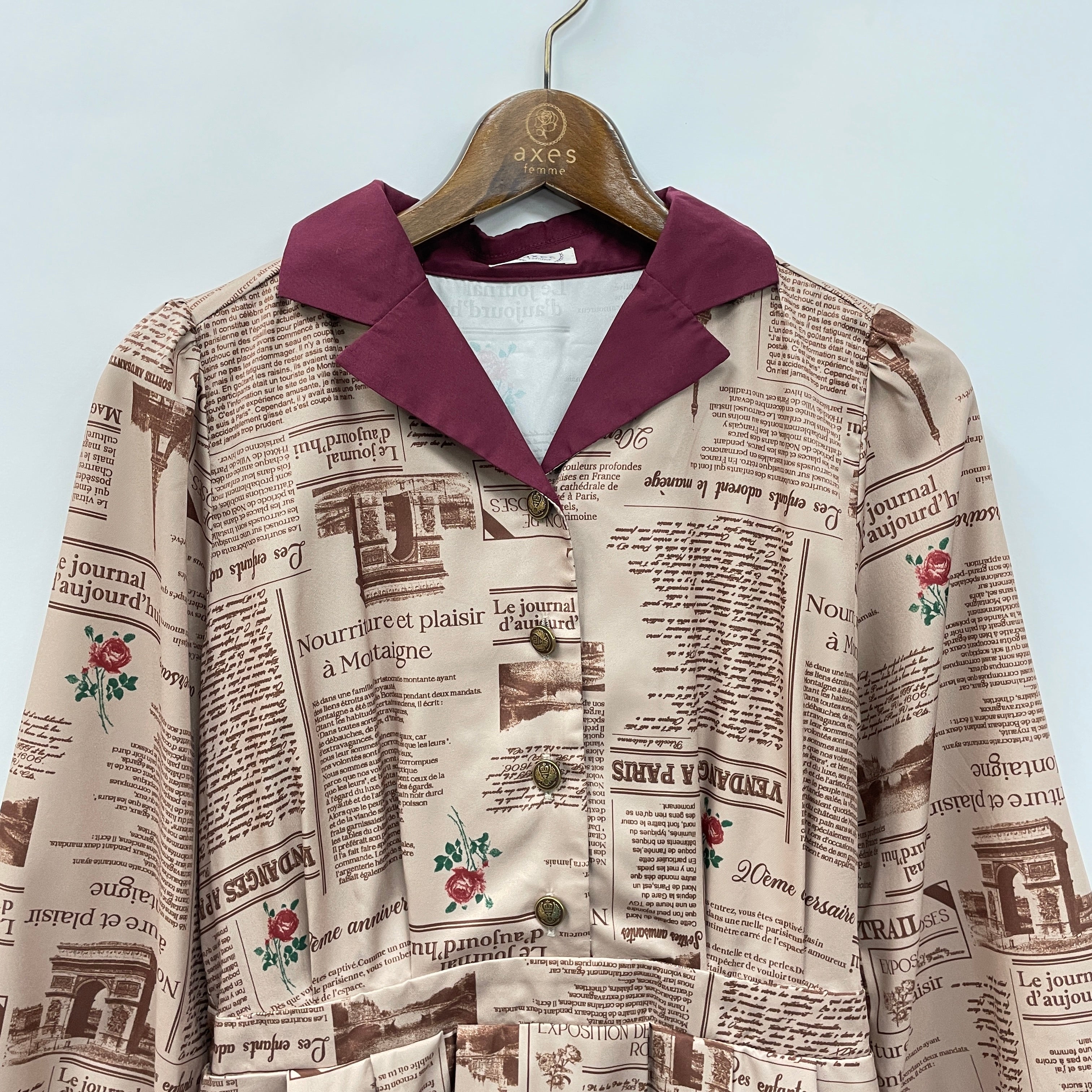 プリント柄は過去のフランスの新聞をモチーフにして落とし込みました。axes femmeに関する言葉や薔薇など様々な事柄がさりげなく記されています。