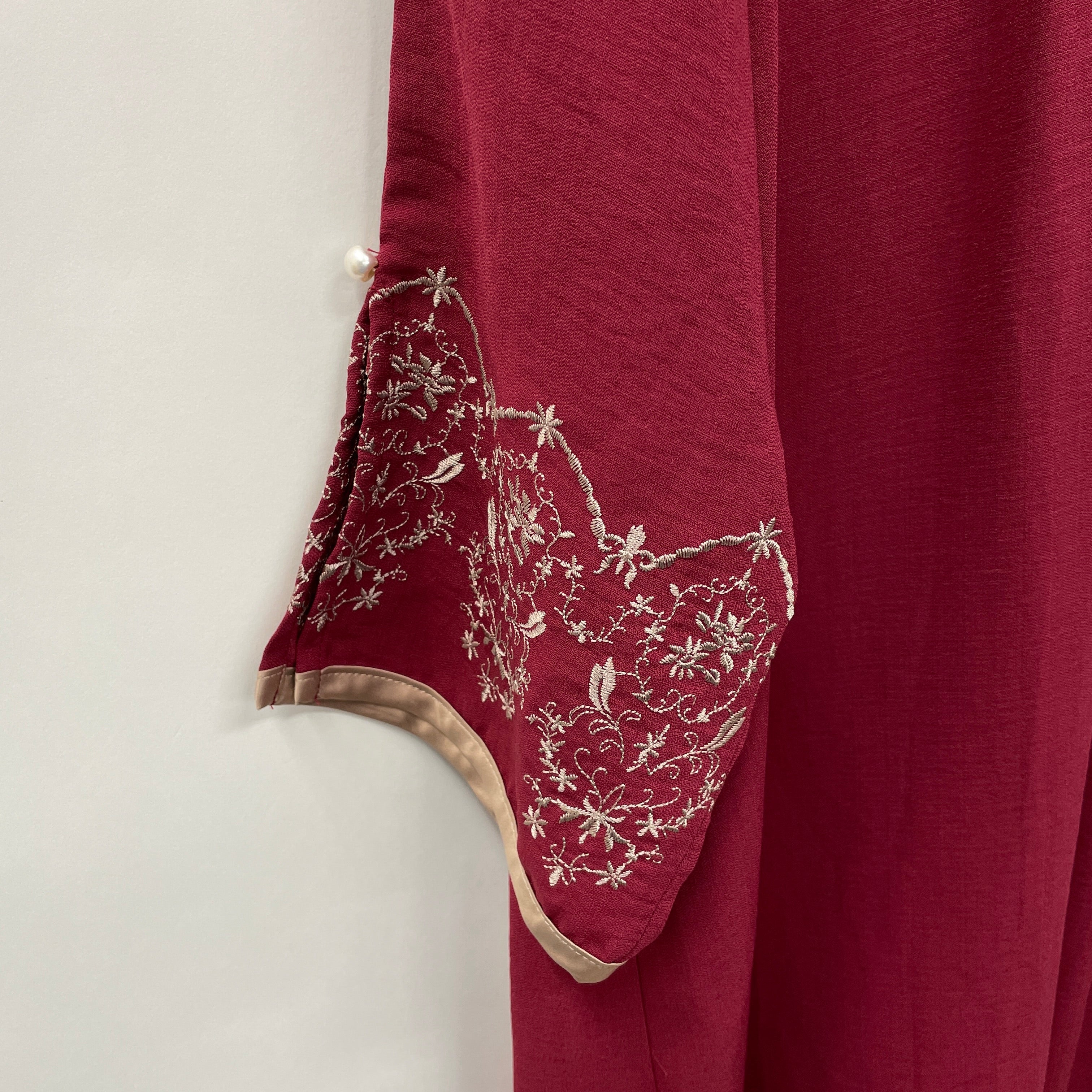 飾りパール釦のついた、スリットの入りの七分袖はチャイナっぽさを感じるデザインです。