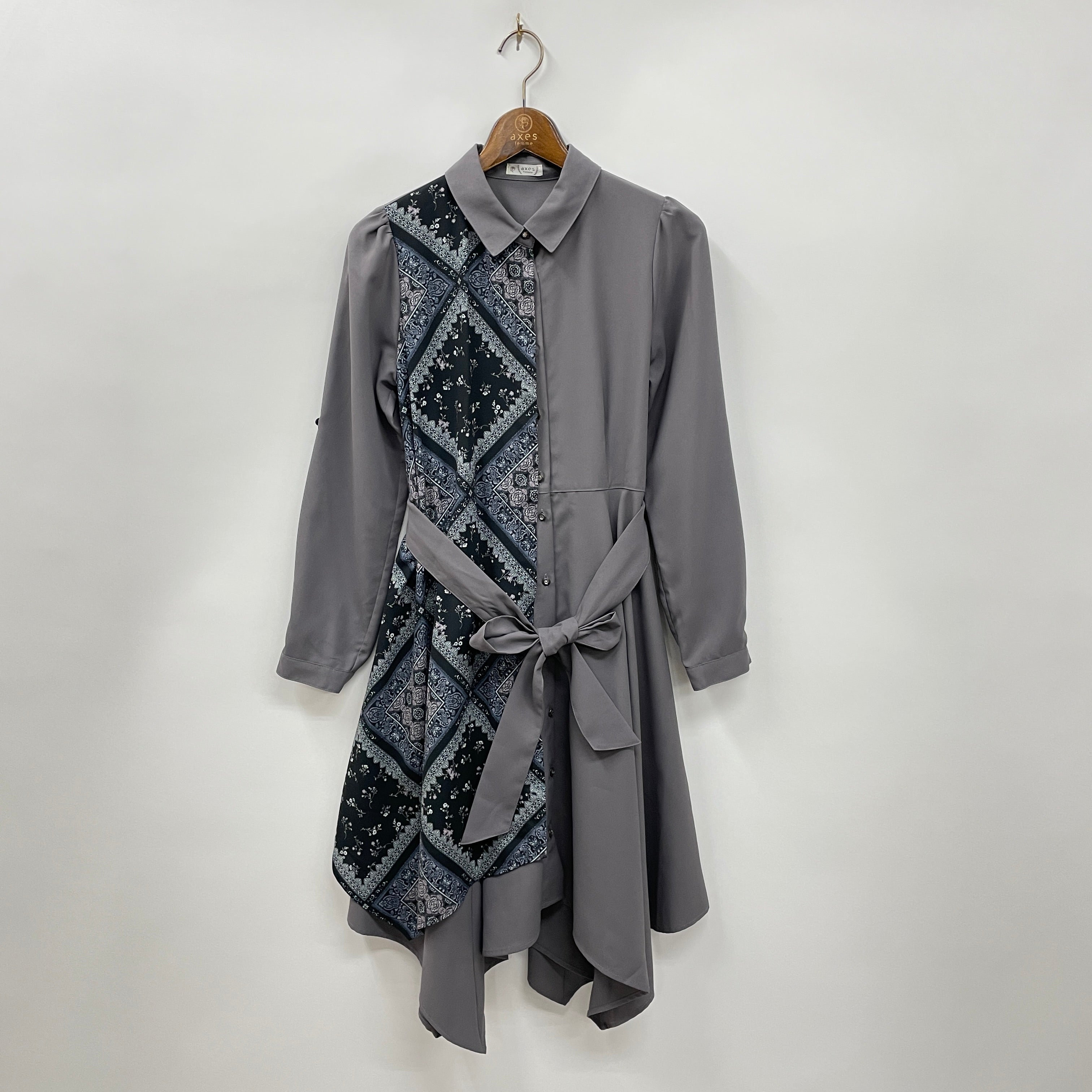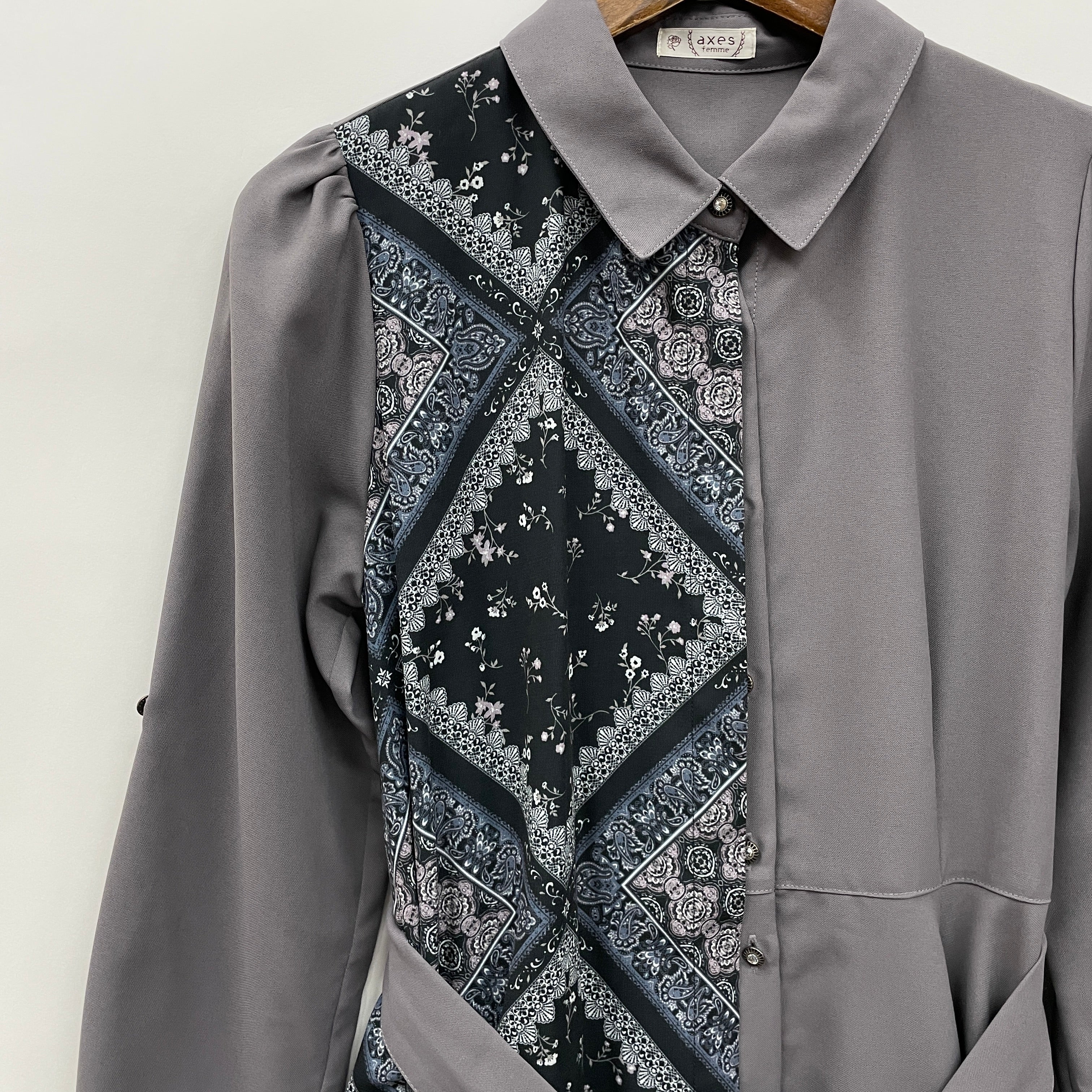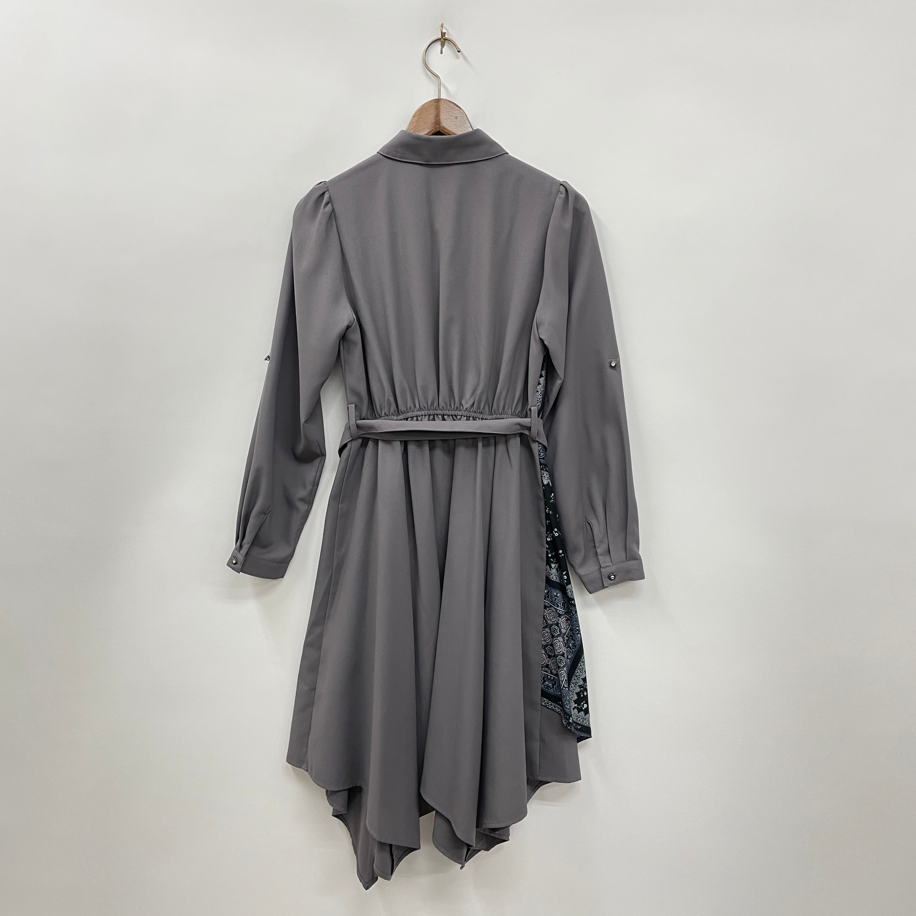 オリジナルスカーフ柄をバイカラーデザインに落とし込んだシャツワンピースです。イレギュラーヘムデザインでシルエットが華やかなアイテム。人気デザインを大人カラーに落とし込みました。肌寒い季節はニットベストやニットチュニを重ねてのコーデがおすすめ。