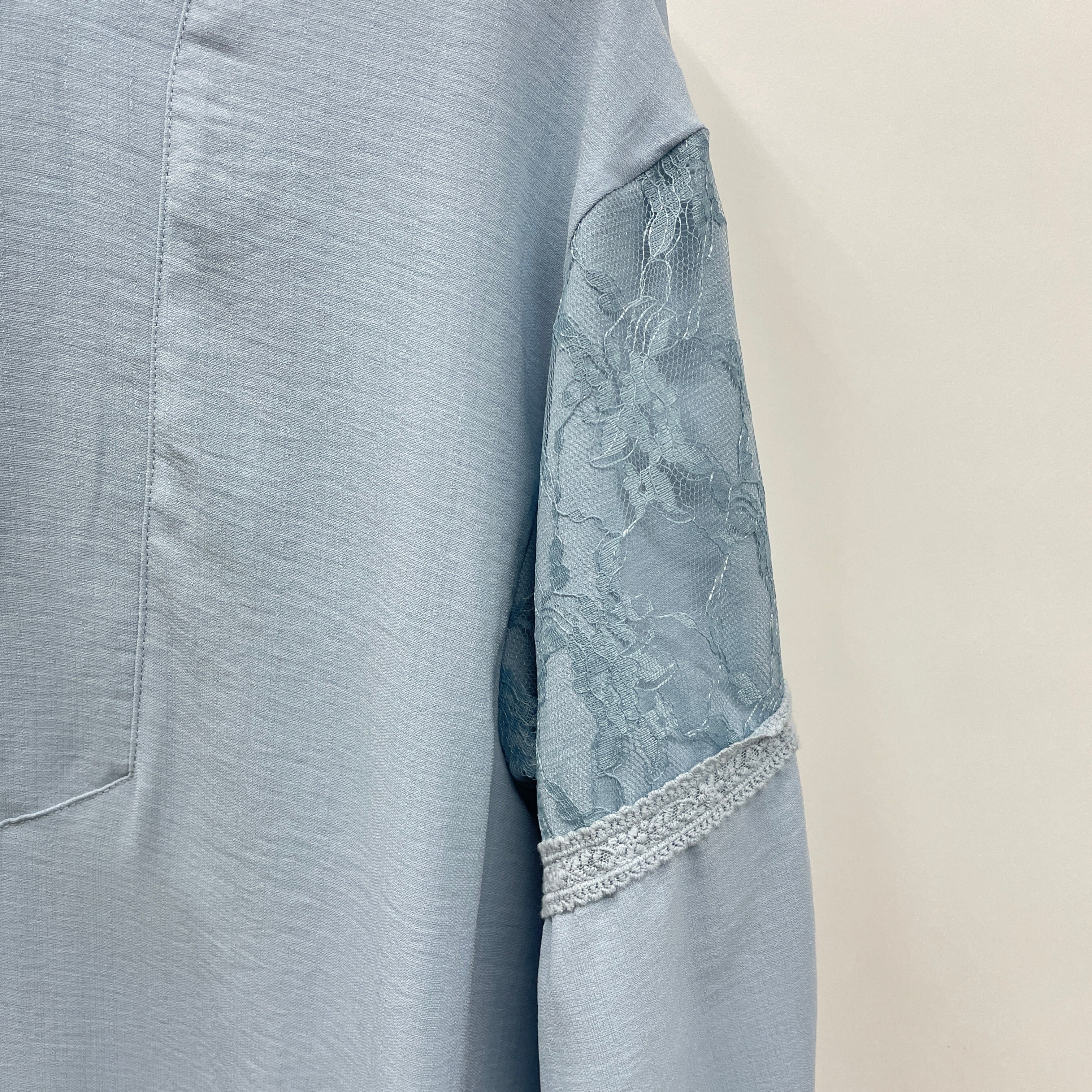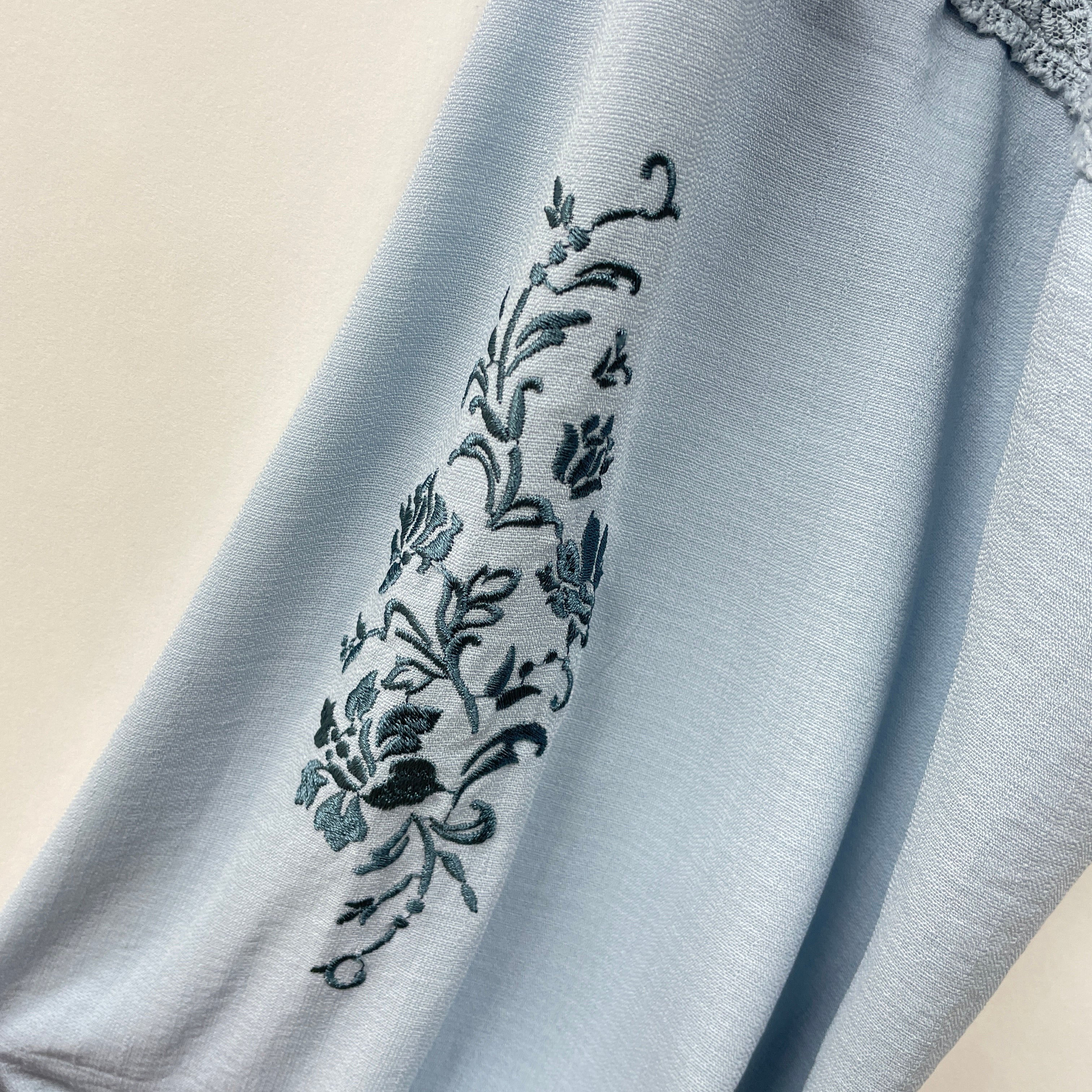 袖刺繍はチャイナ風の花デザインで、単色なのでより着やすく、コーディネートのアクセントに。