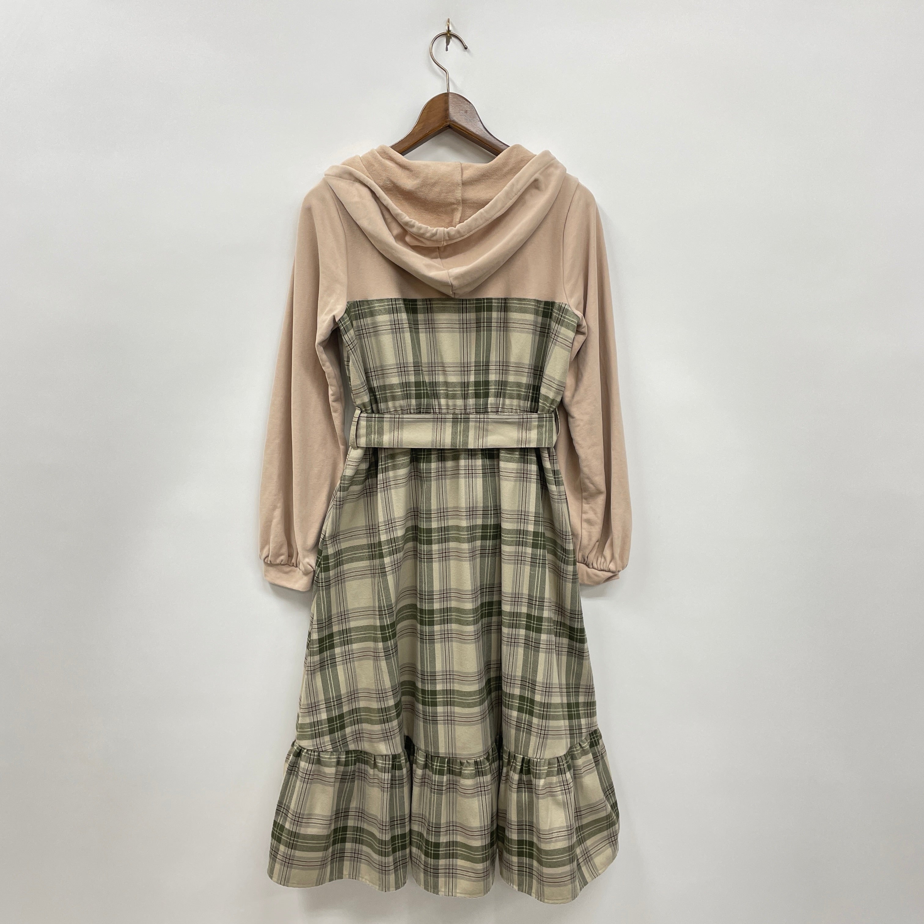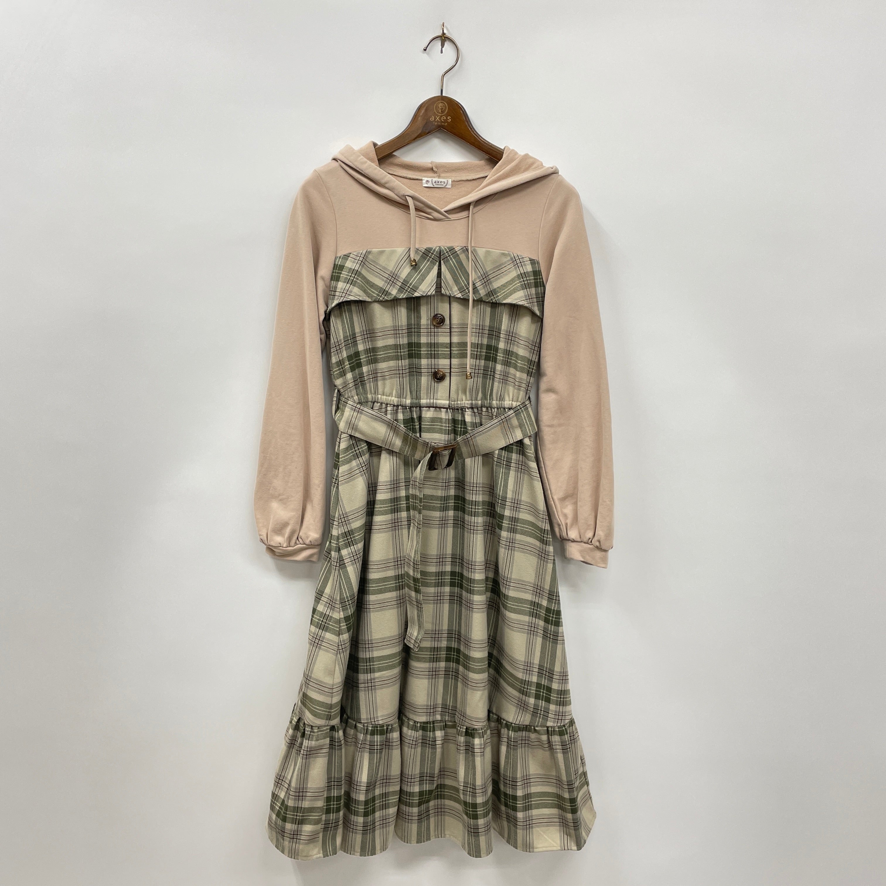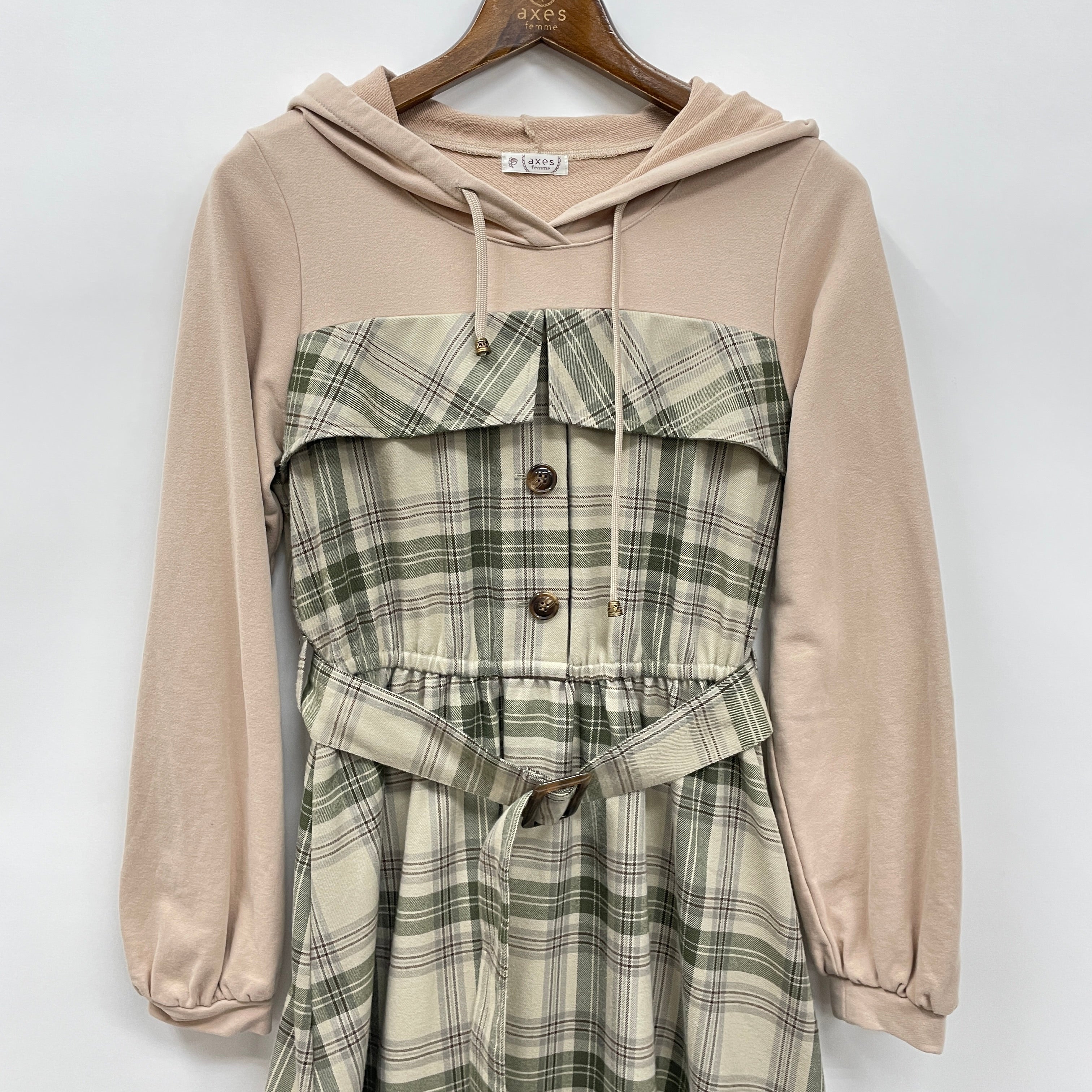 フード付きパーカーとチェック柄ワンピースがドッキングしたデザインがチャーミングなワンピースです。