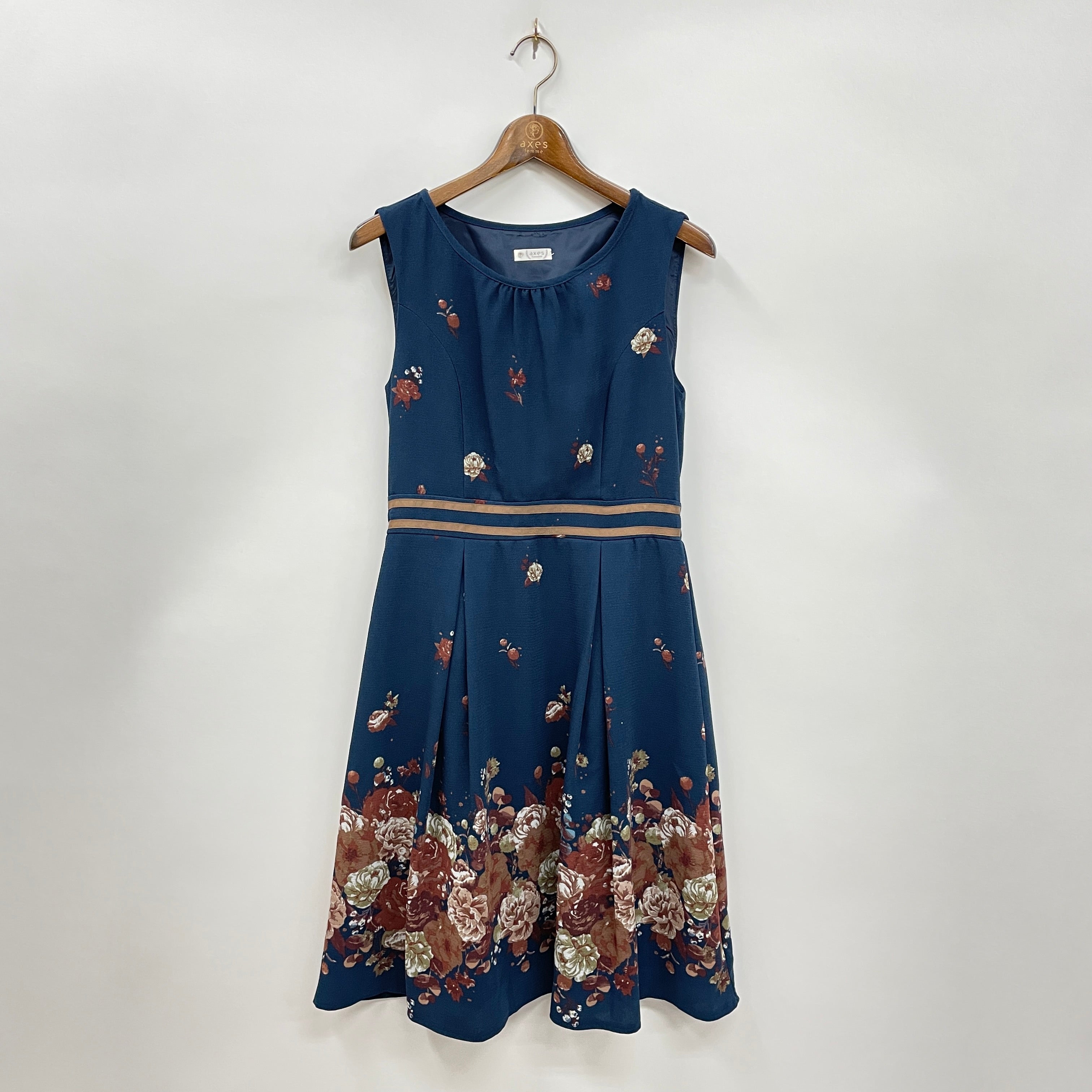 ドライフラワーをモチーフにした大人っぽいカラーリングがかわいいノースリーブワンピース。スカート部分はタックデザインで広がりすぎずすっきりとしたシルエットに。ブラウスでガーリーに、インナープルを合わせエレガンスにも着こなせるアイテム。