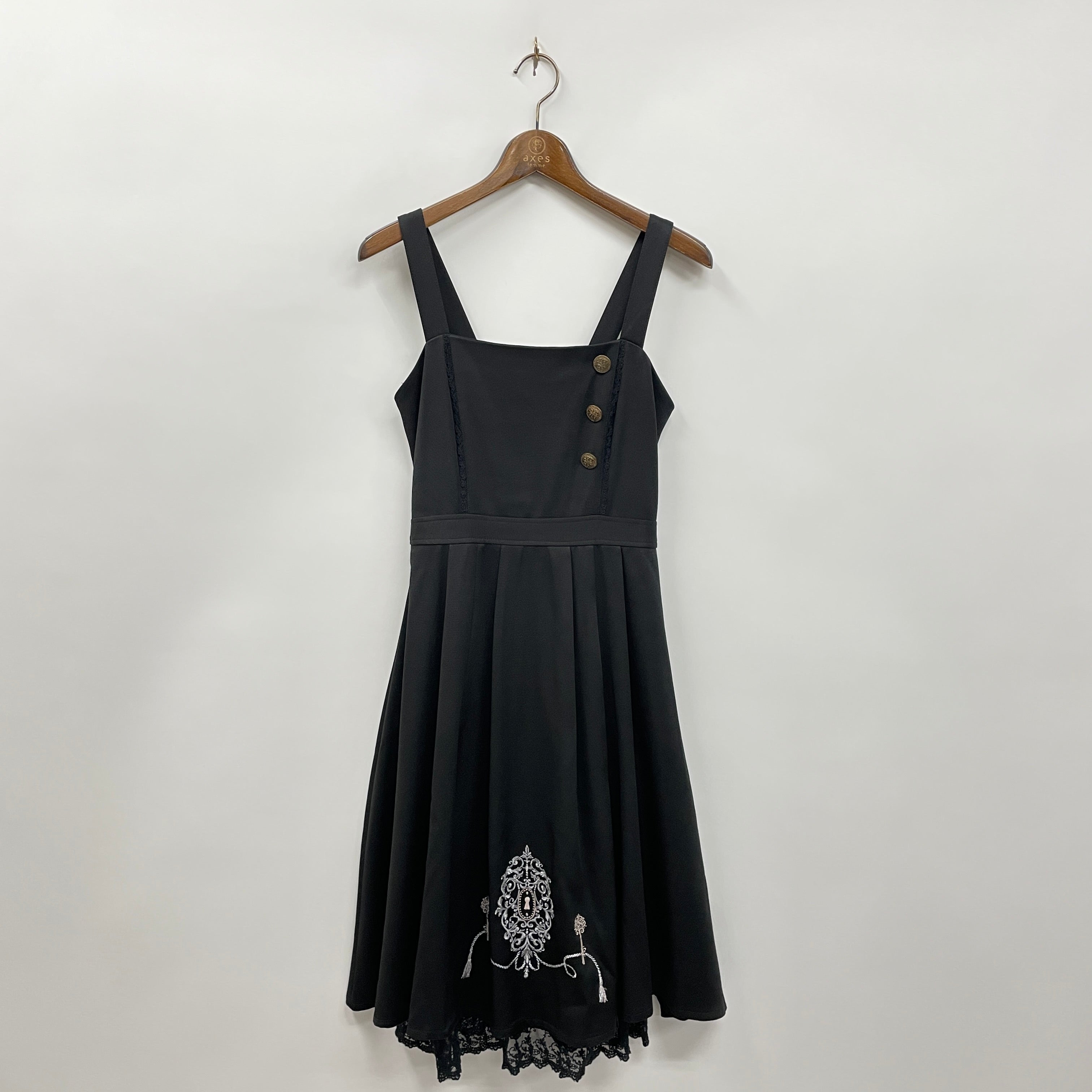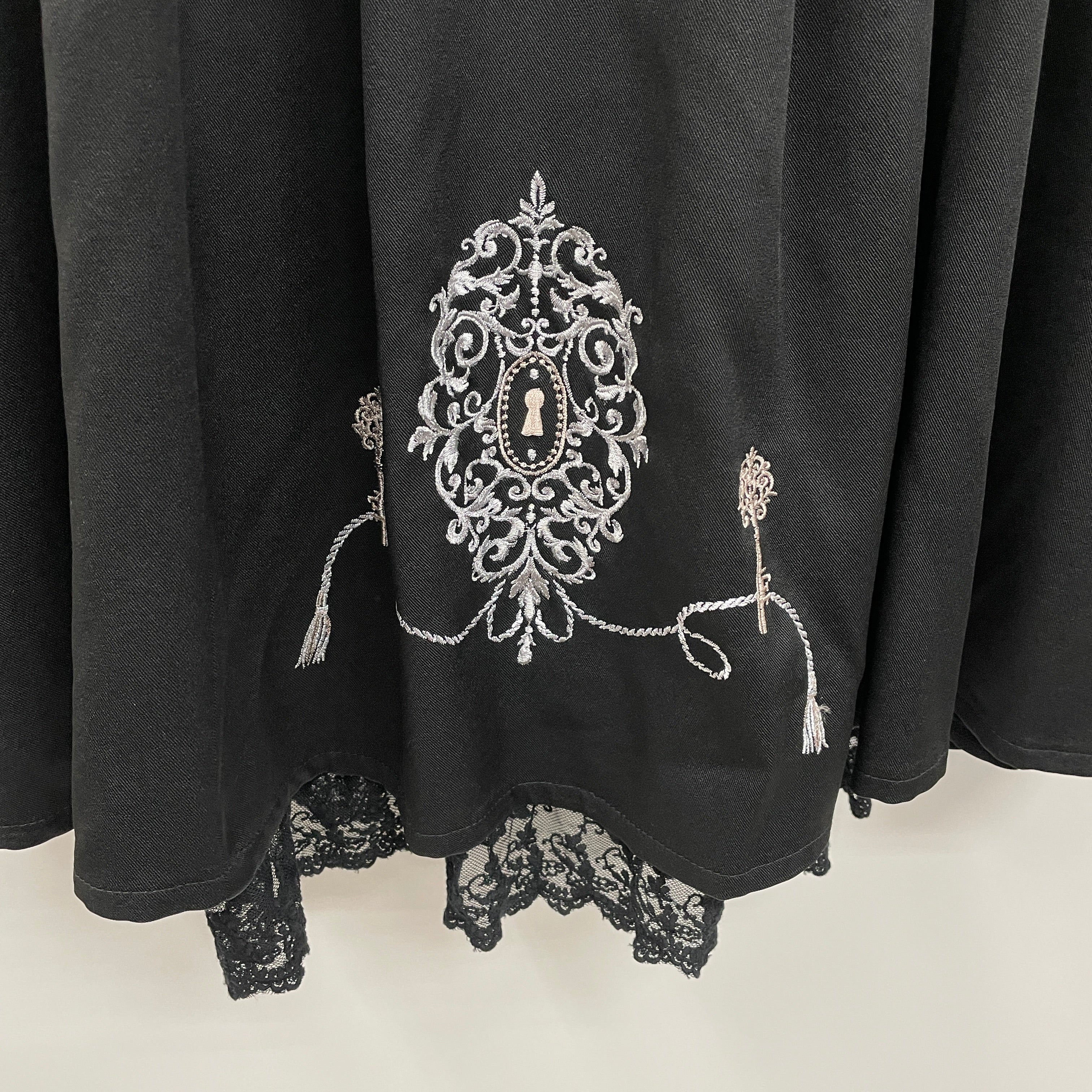 裾にほどこした鍵モチーフやタッセルモチーフ刺繍がアクセントになったジャンスカです。