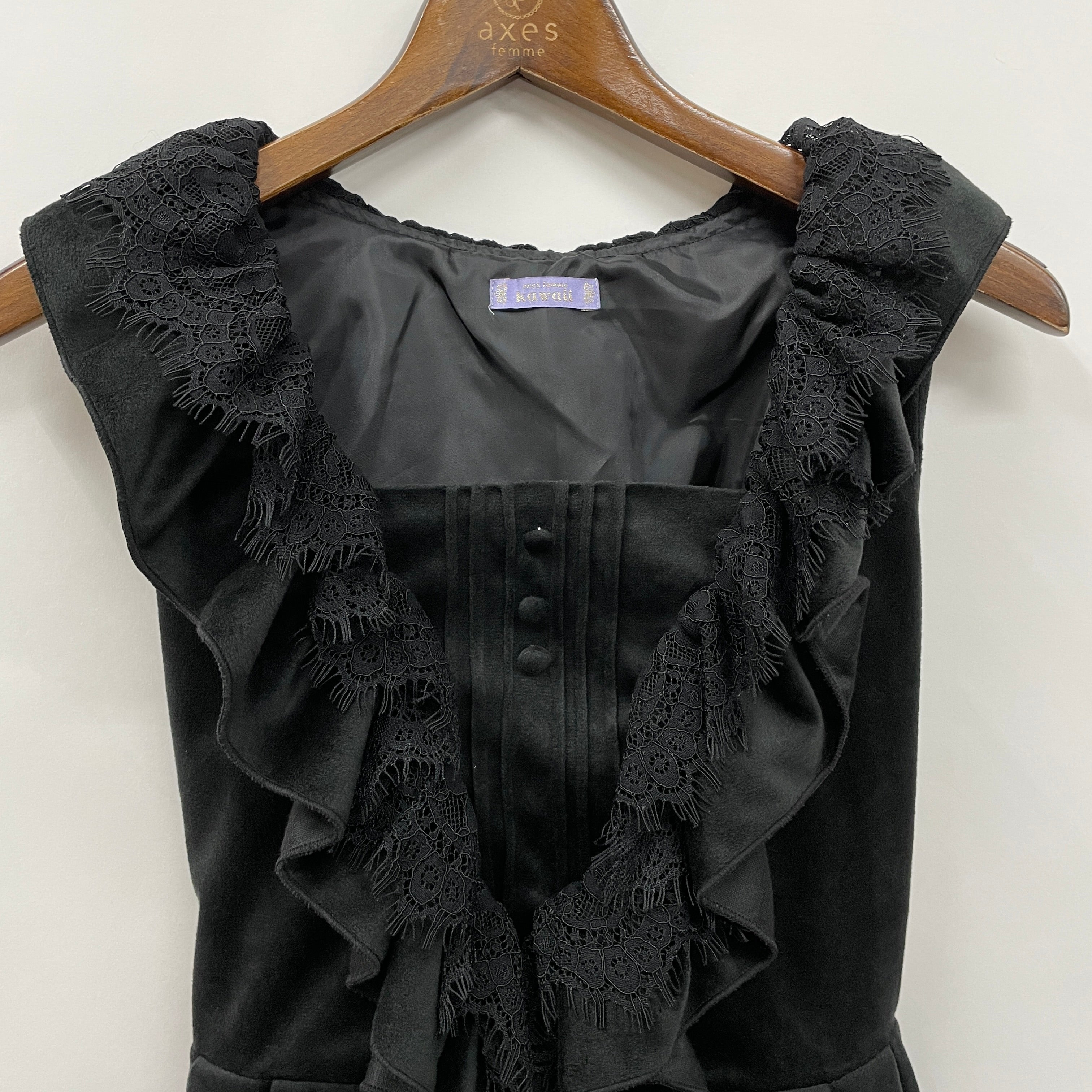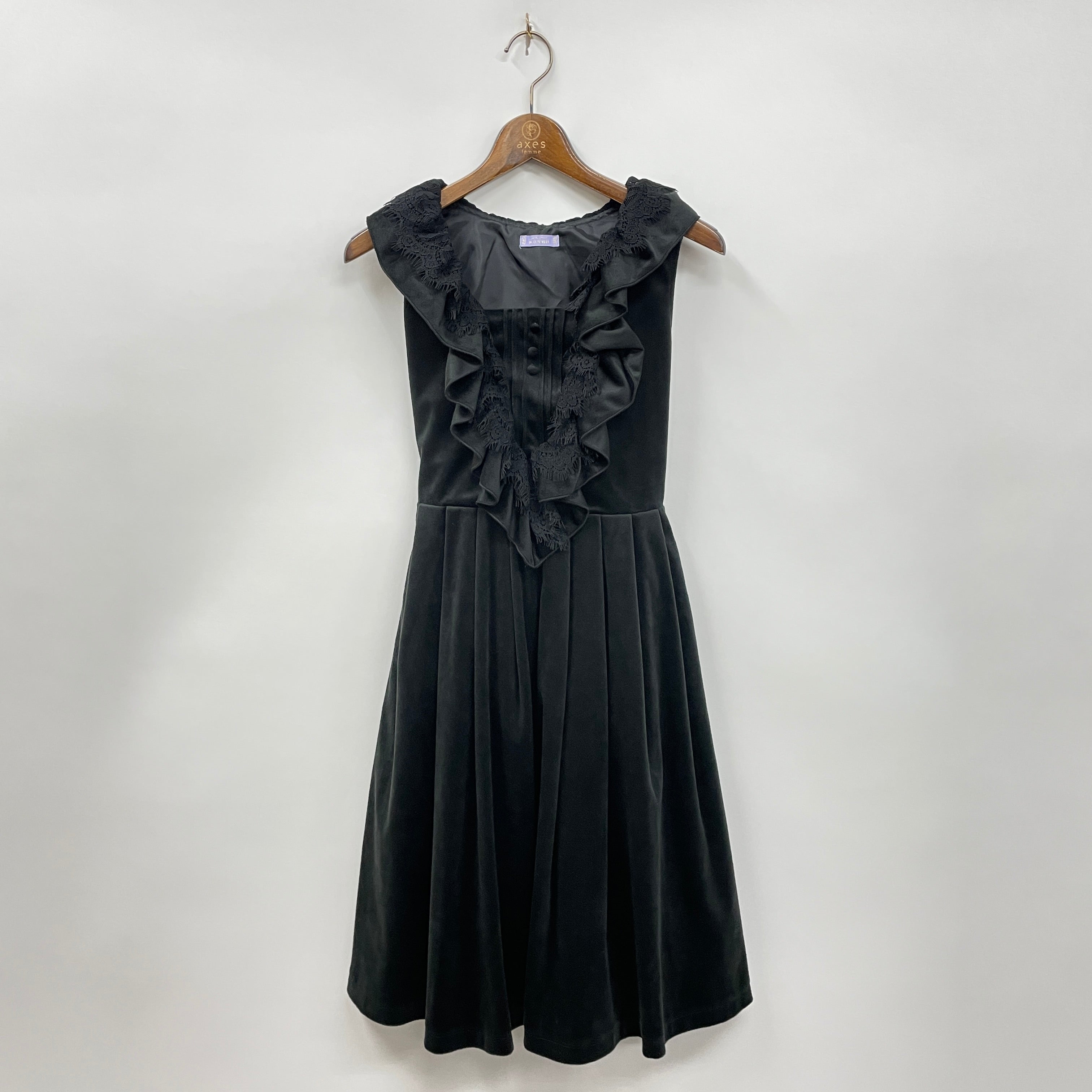 高級感があるクラシカルなベロア生地のジャンパースカート。V字切り替えにはフリルとレースがあしらわれた豪華なデザインです。サイドファスナーはウエストまで下がる仕様です。