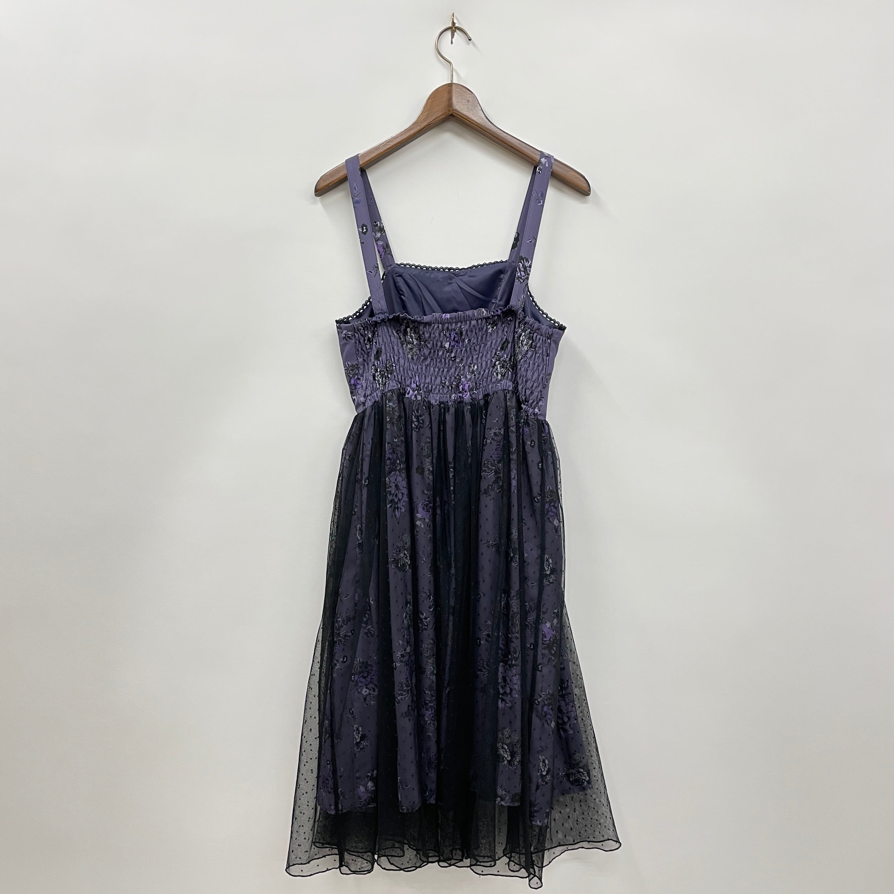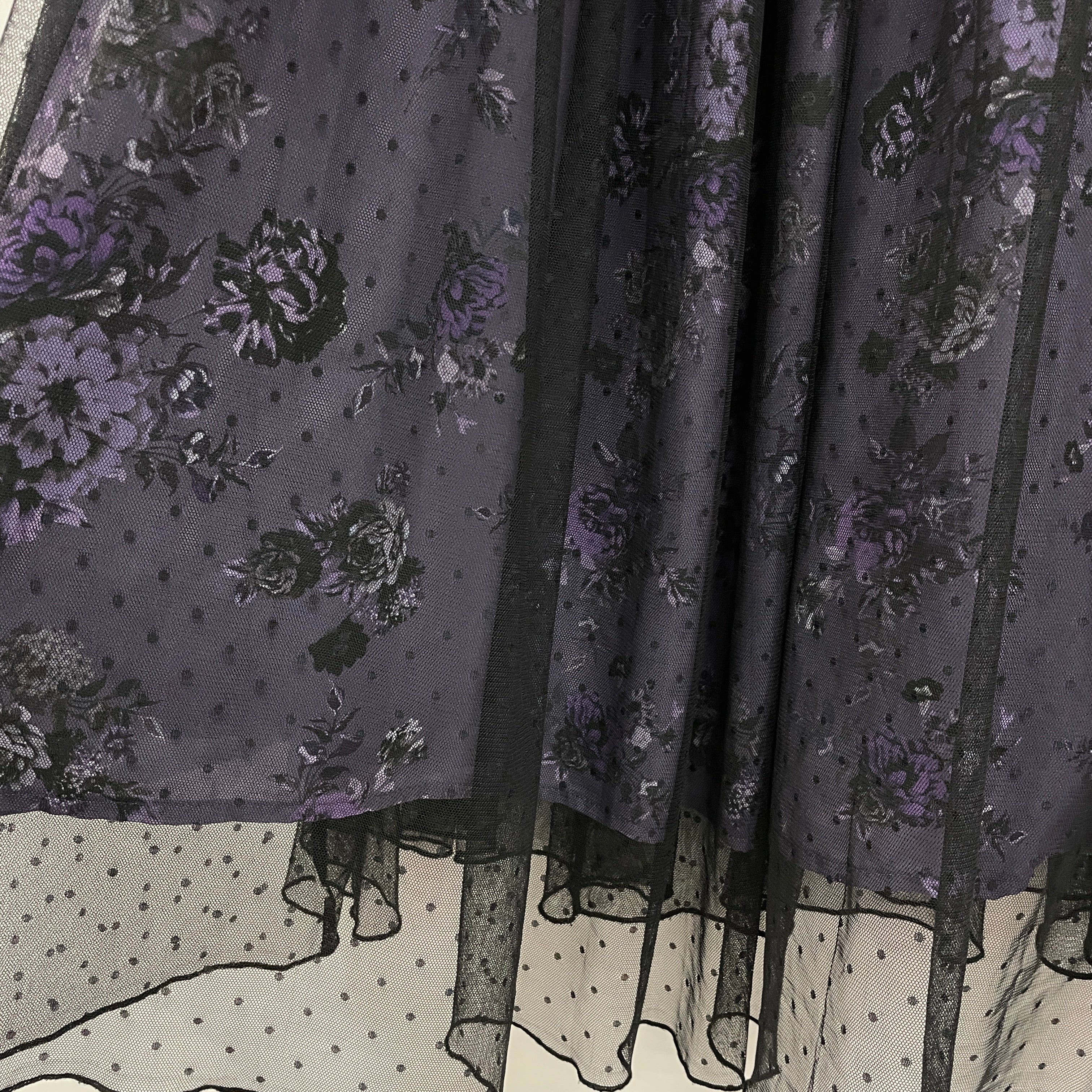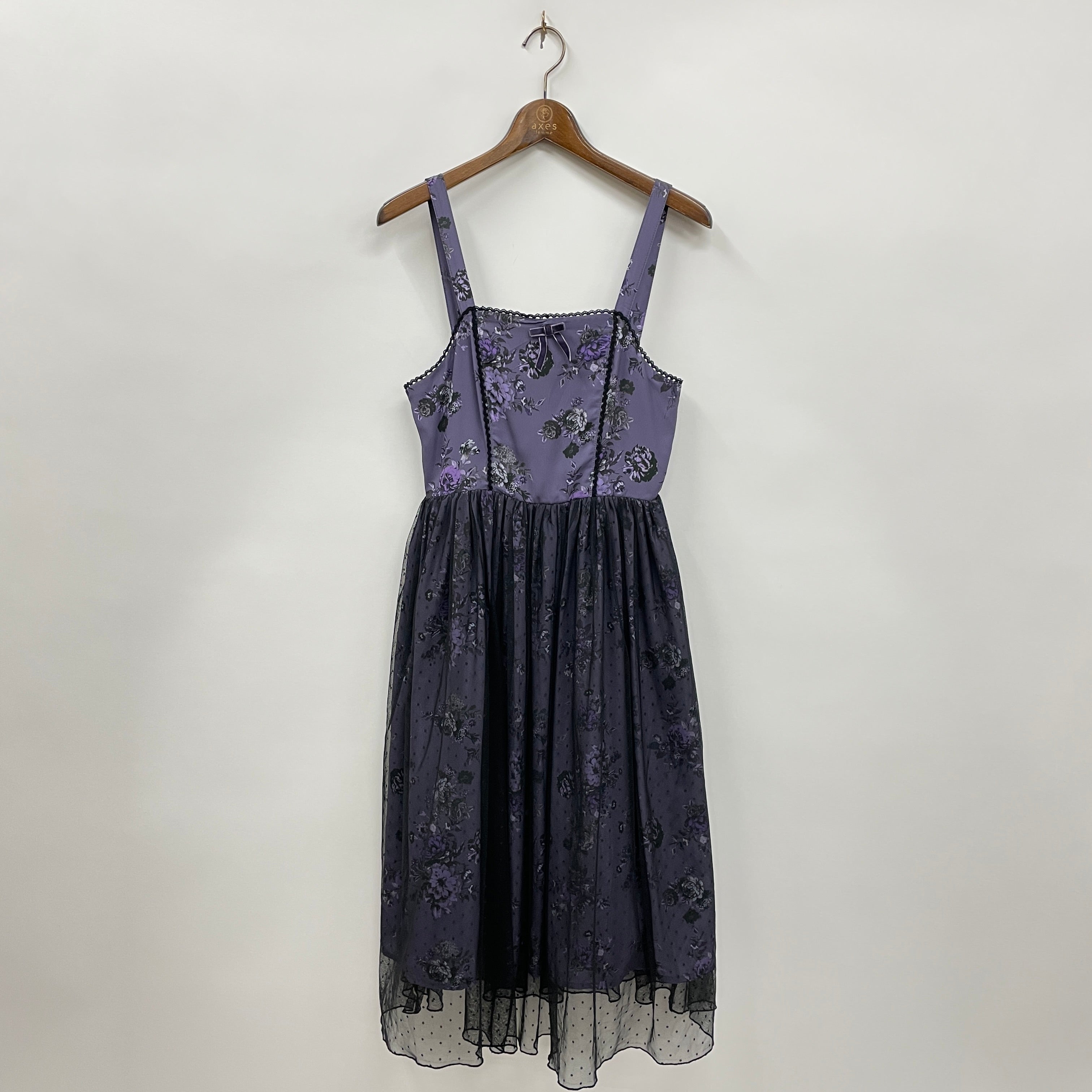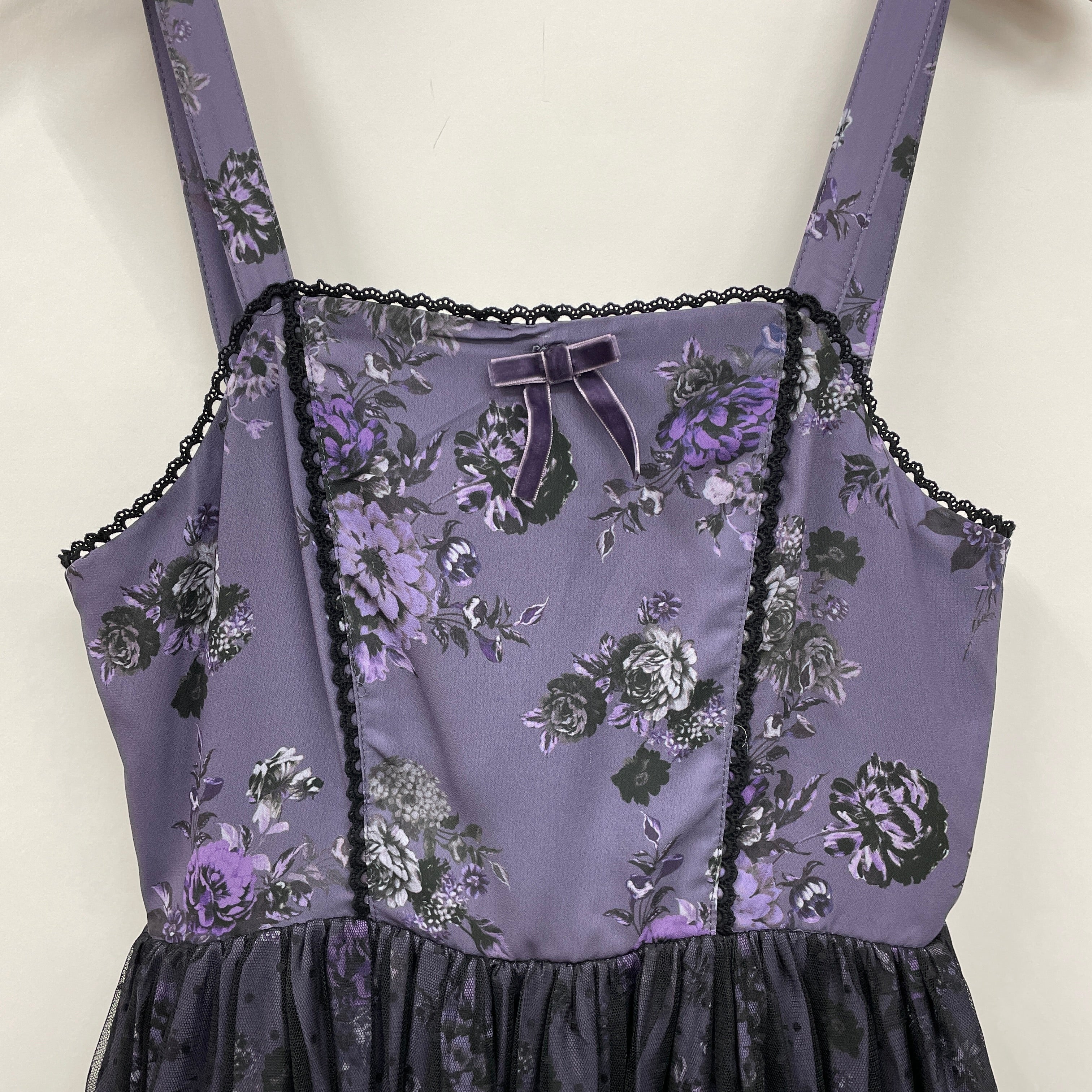 総柄のクラシカルな花柄にスカート部分だけドットチュールが重ねられたジャンパースカート。丈は長めですが、ミディオーガンジーパニエですと内側のスカートから裾が出てしまう為、ボリュームオーガンジーパニエの丈感がぴったりです。