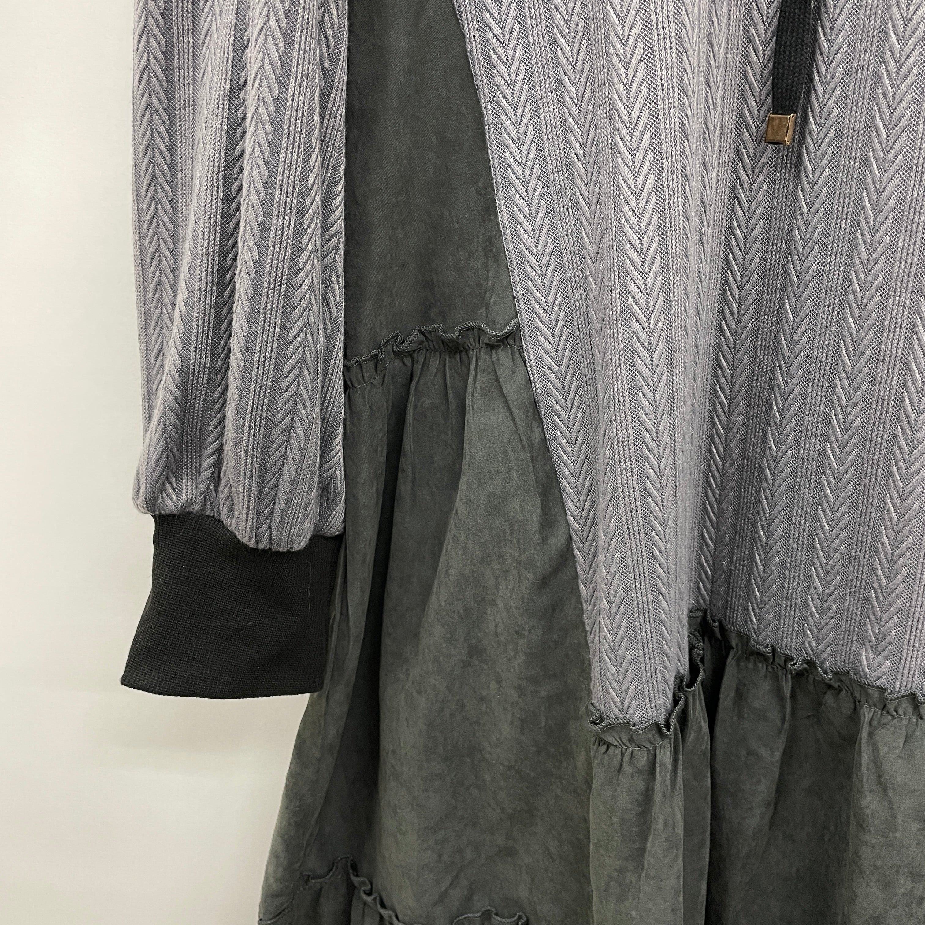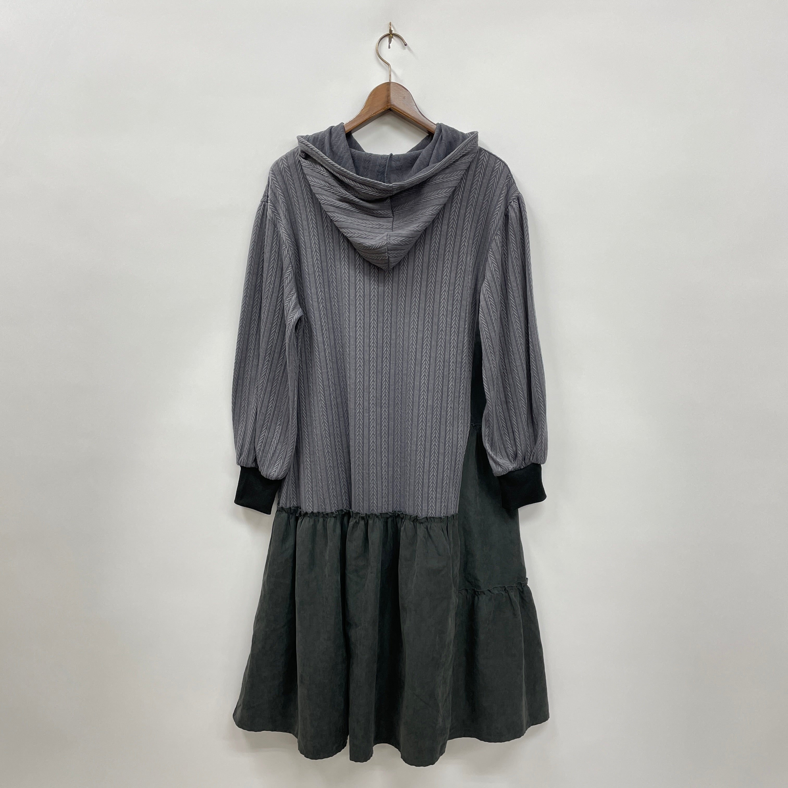 裾にかけて広がるギャザー切替が女性らしいシルエットを作り出し、動きのあるデザインに仕上がっています。フード付きのパーカーデザインがカジュアルな印象を与えつつ、ギャザー切替で柔らかな雰囲気をプラスしています。また、ゆとりのある袖デザインがトレンド感を加えています。