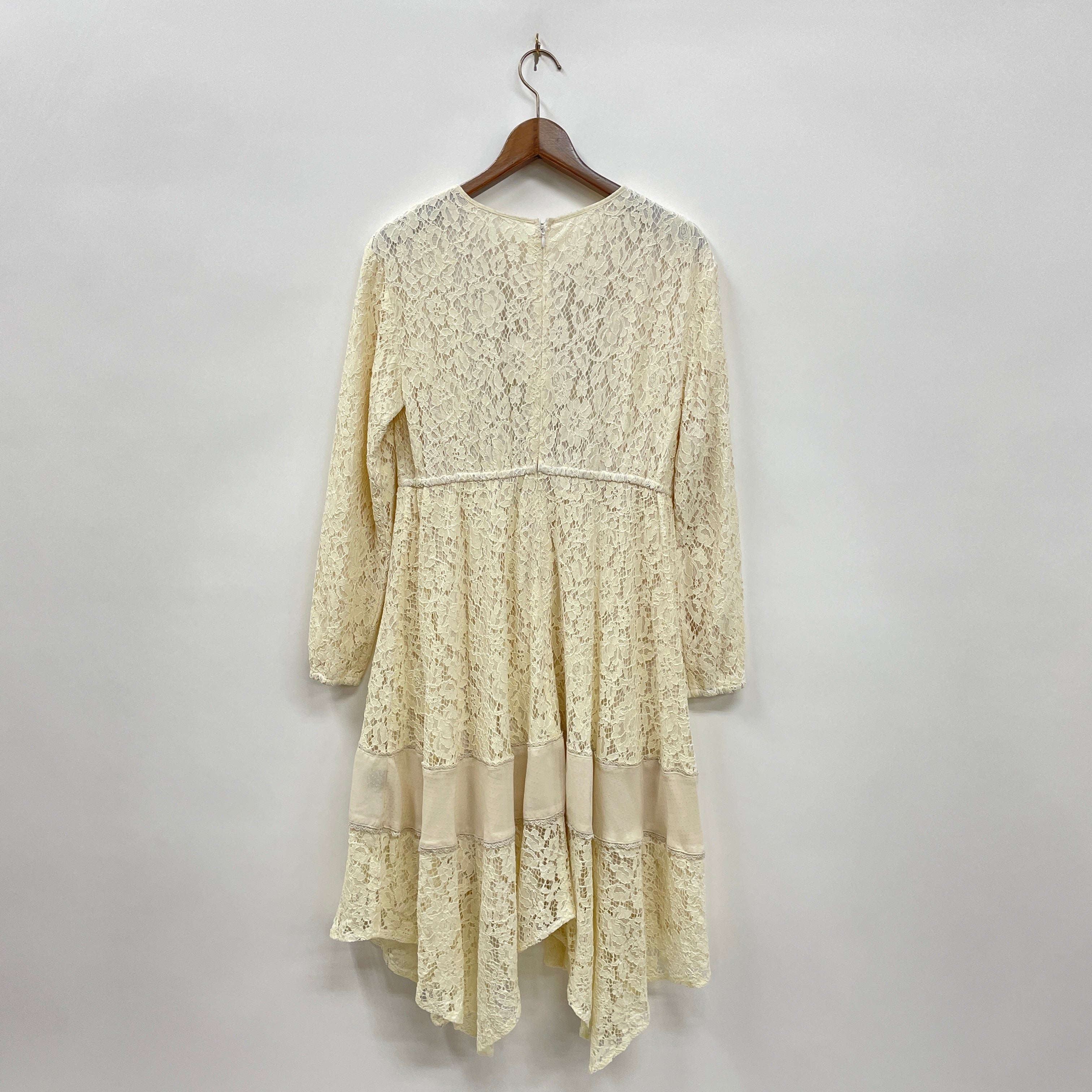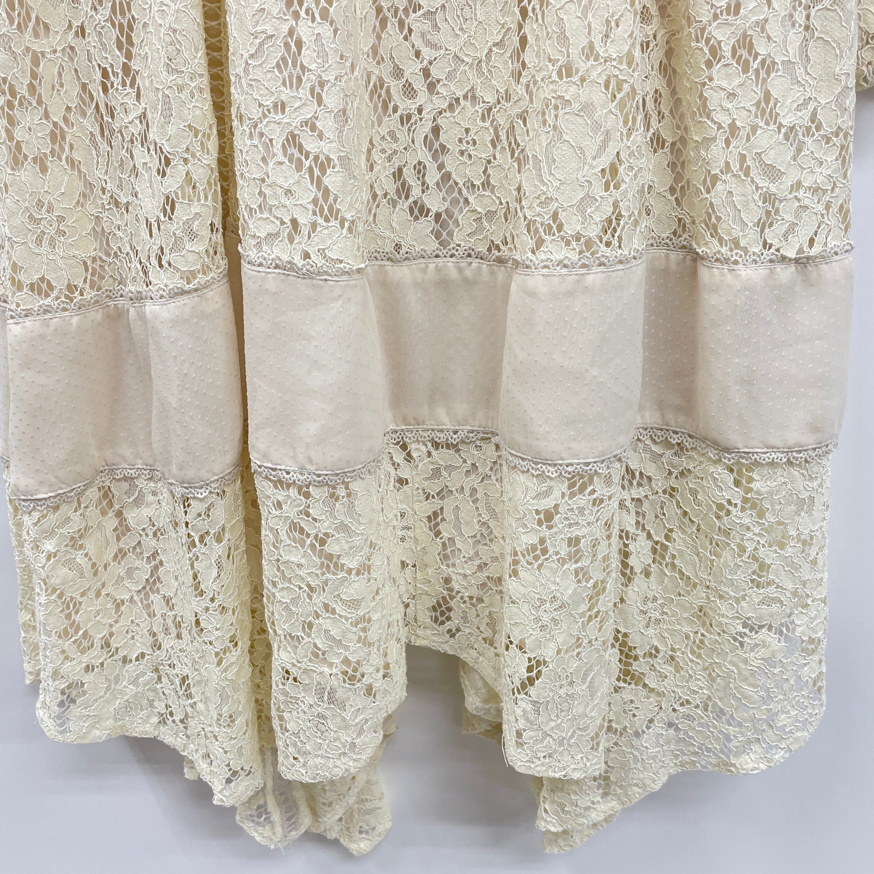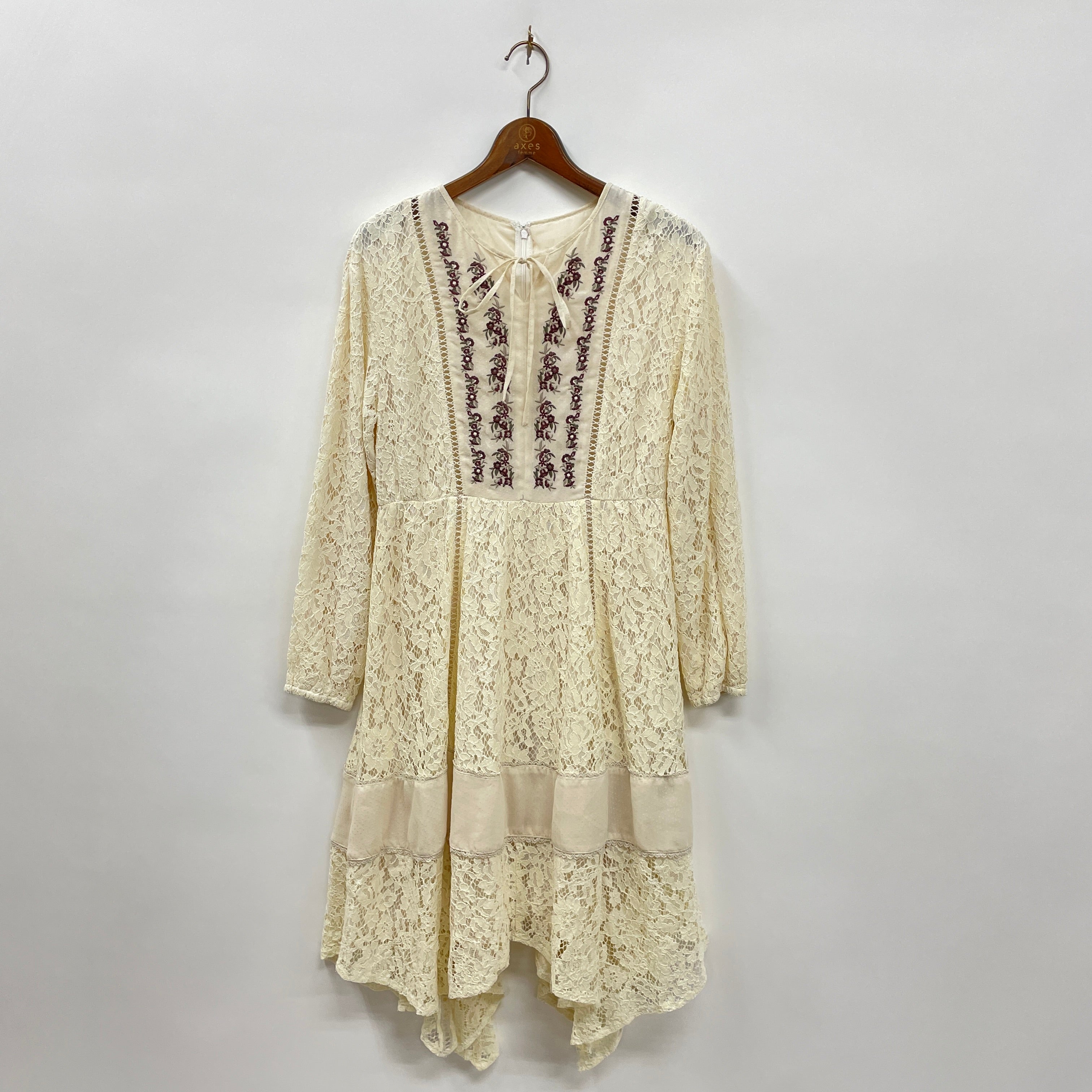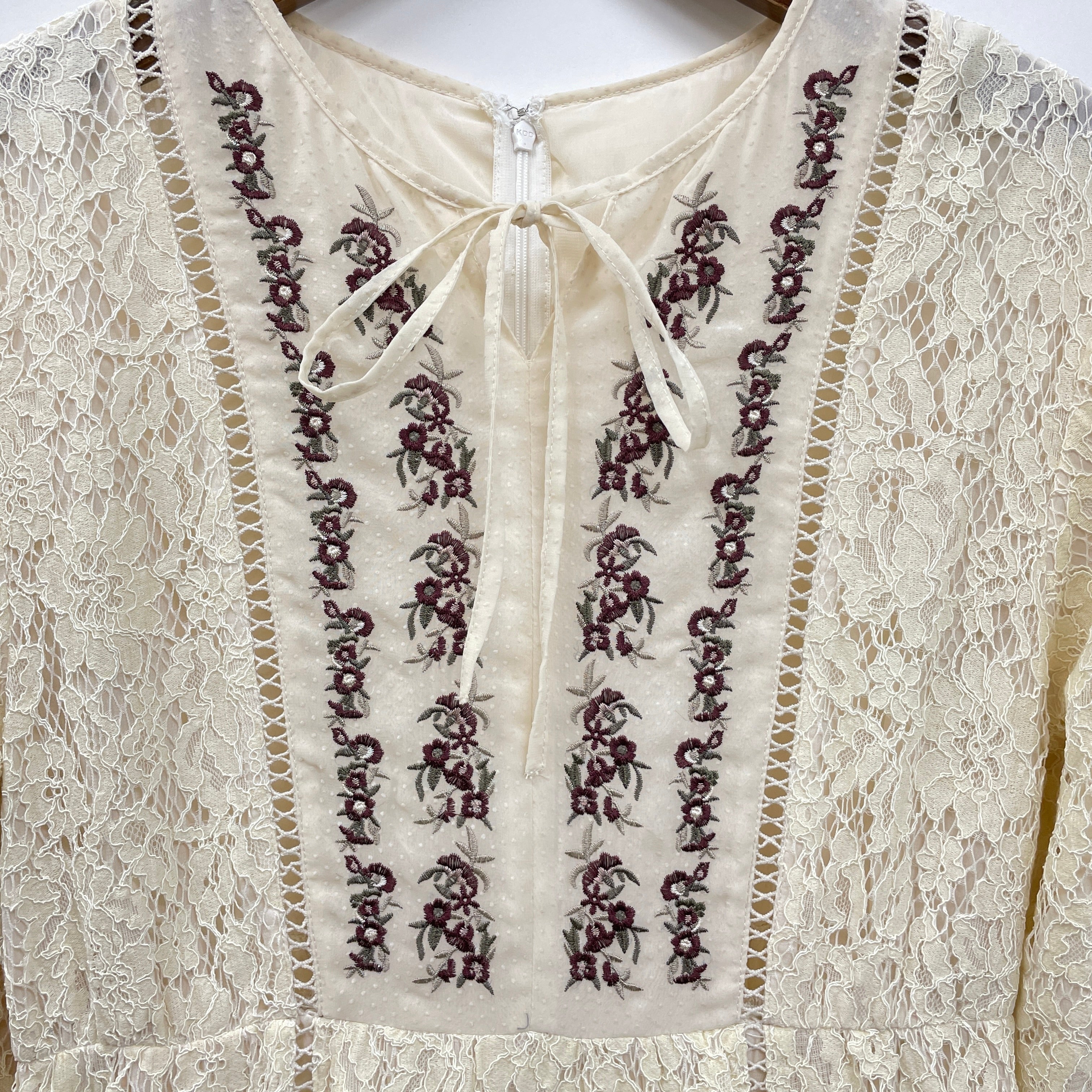 エスニック感のある刺繍が胸元に入ったワンピースです。ドットフロッキーとコードレースの異素材使いでスカートのデザインはイレギュラーヘムでゆれるシルエットがフェミニンな印象を与えてくれます。