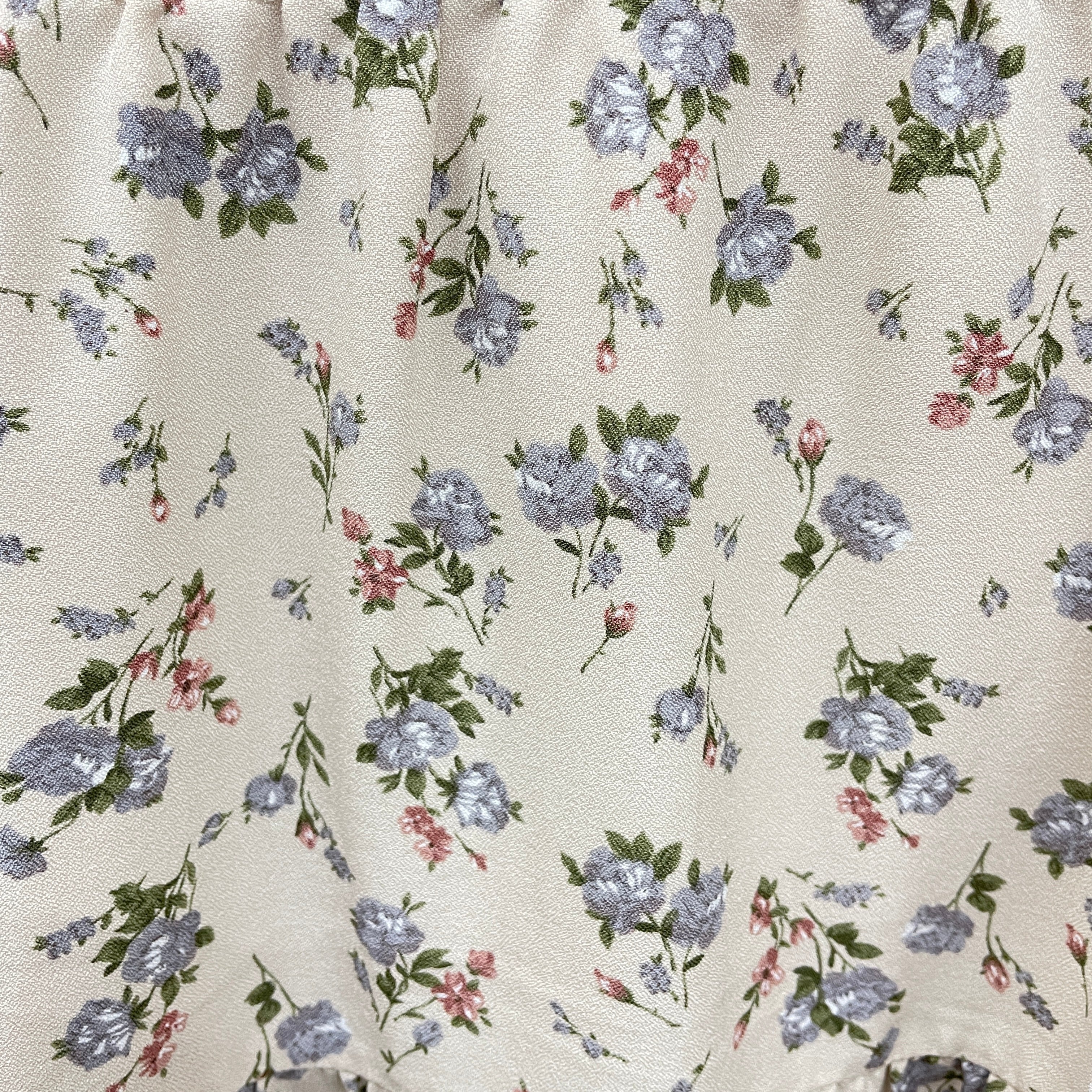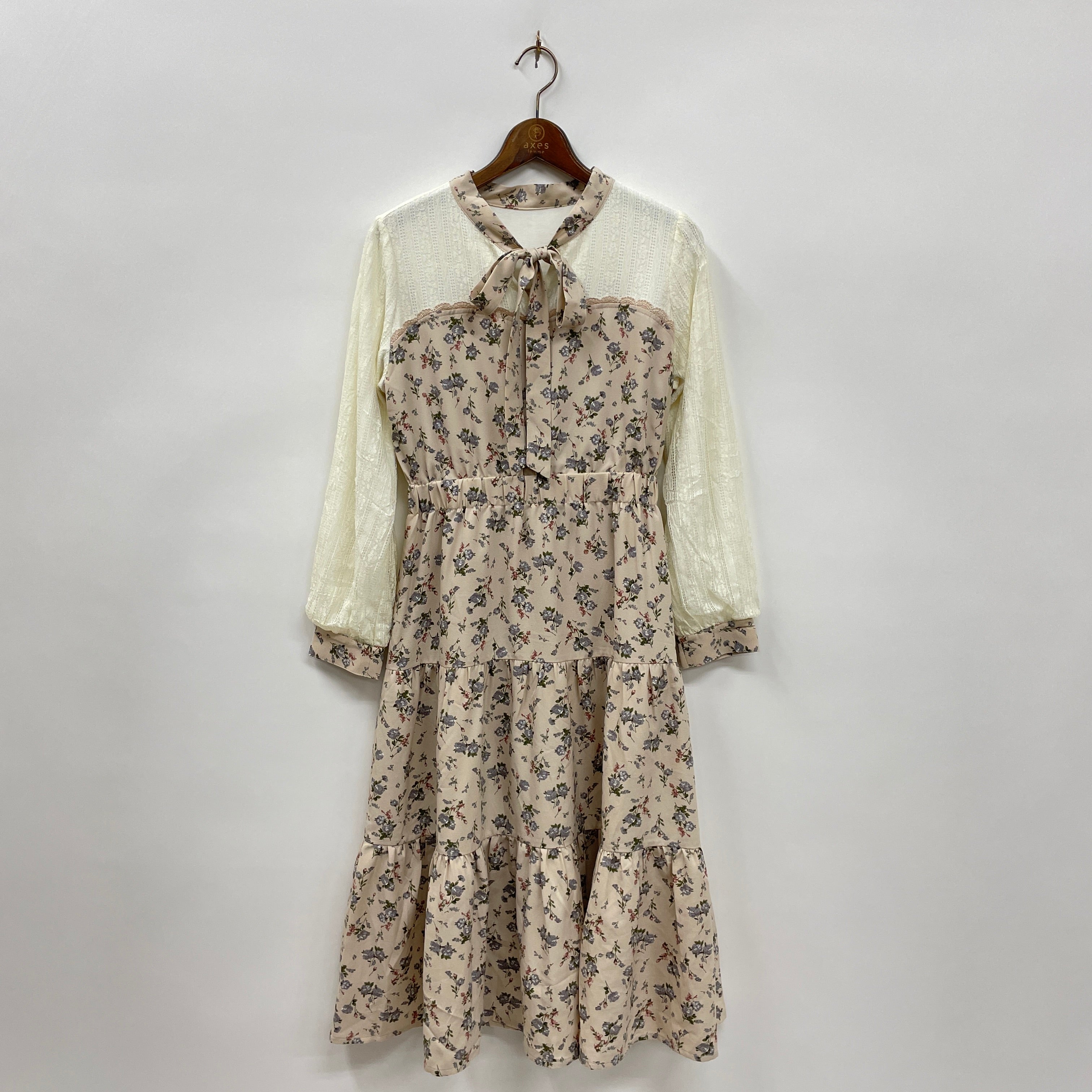 胸元と袖にはレースをあしらい、春らしい花柄生地を使用したロングワンピースです。ティアード切替とボータイデザインが今年らしいアイテムです。