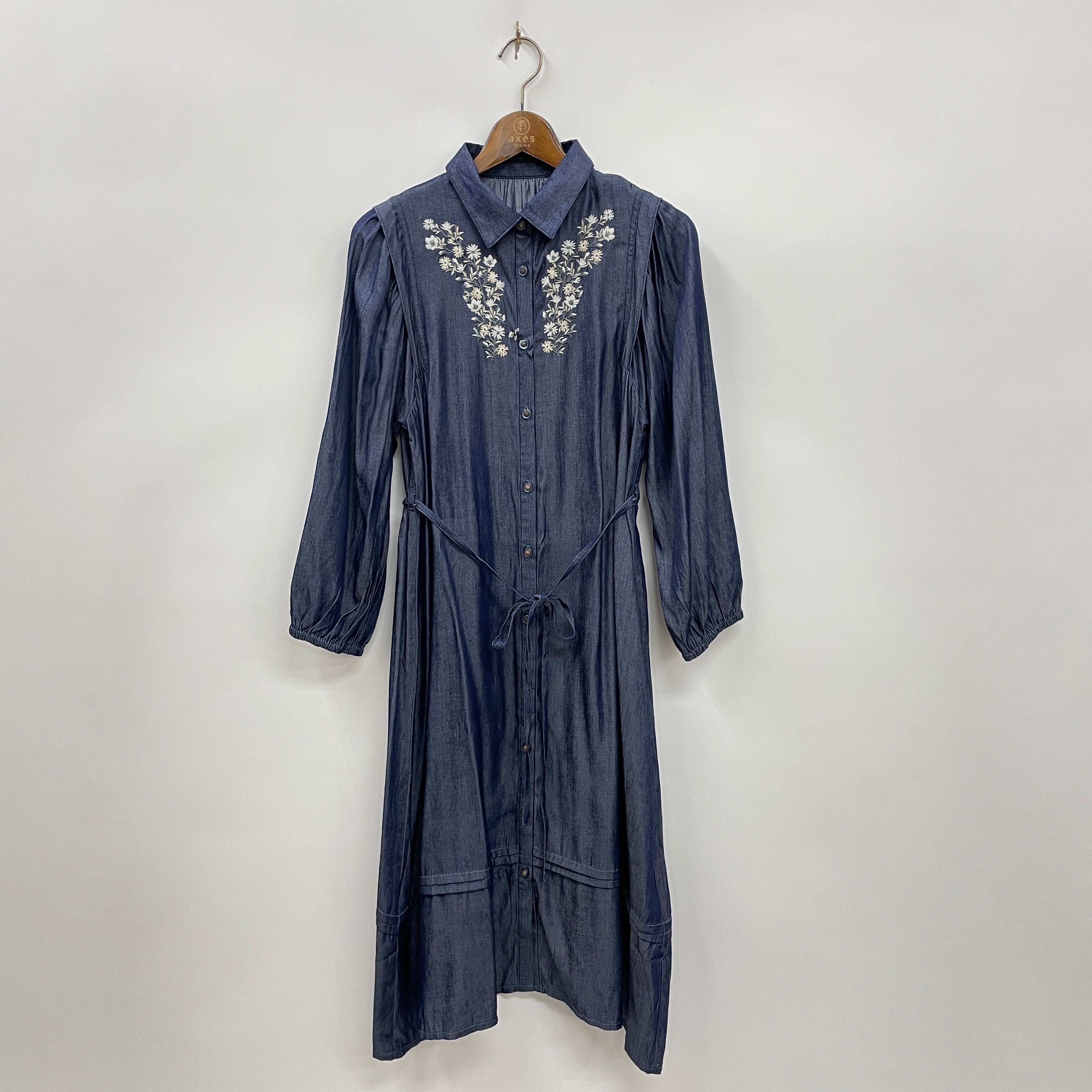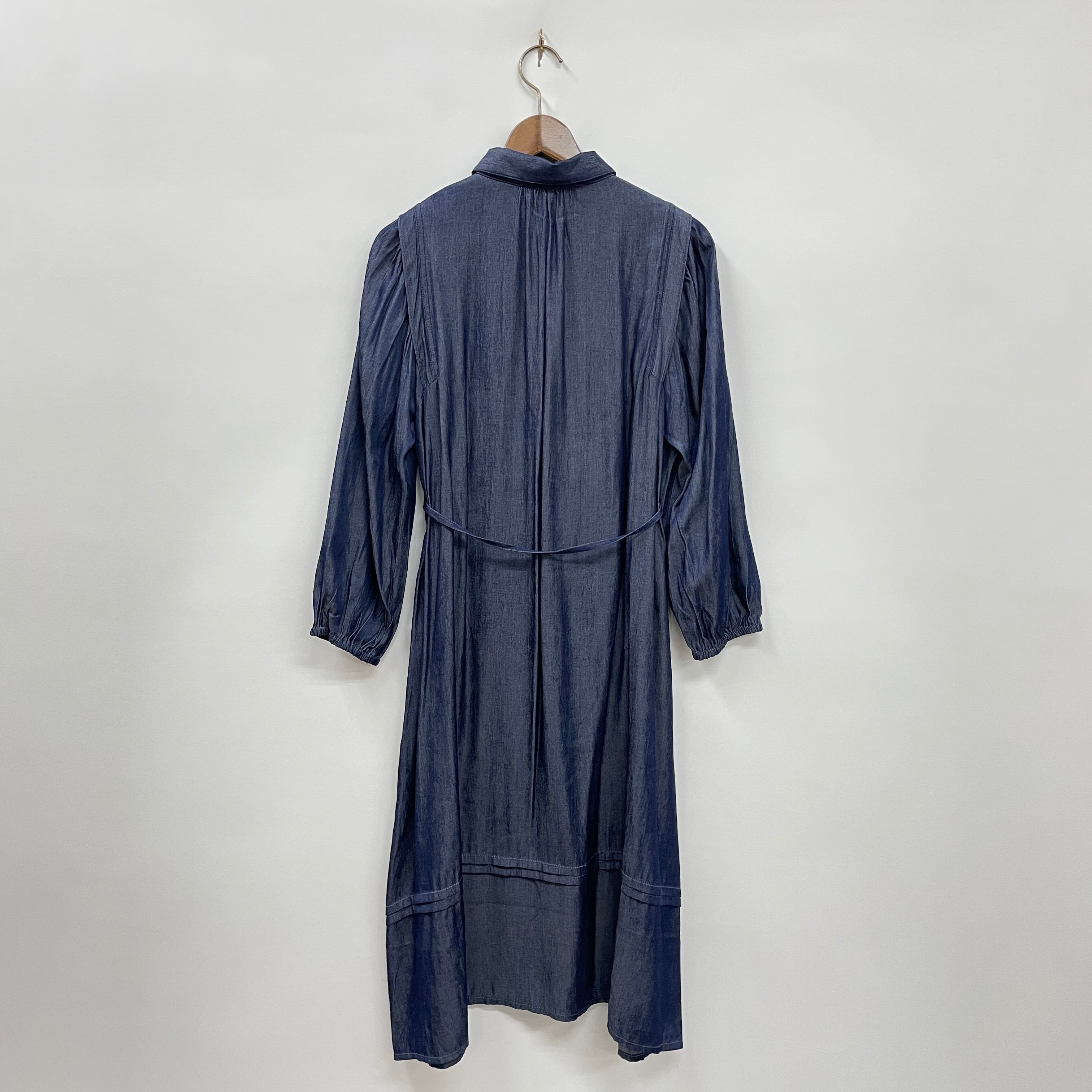 たっぷりギャザーを寄せたボリューム袖のシャツワンピースです。