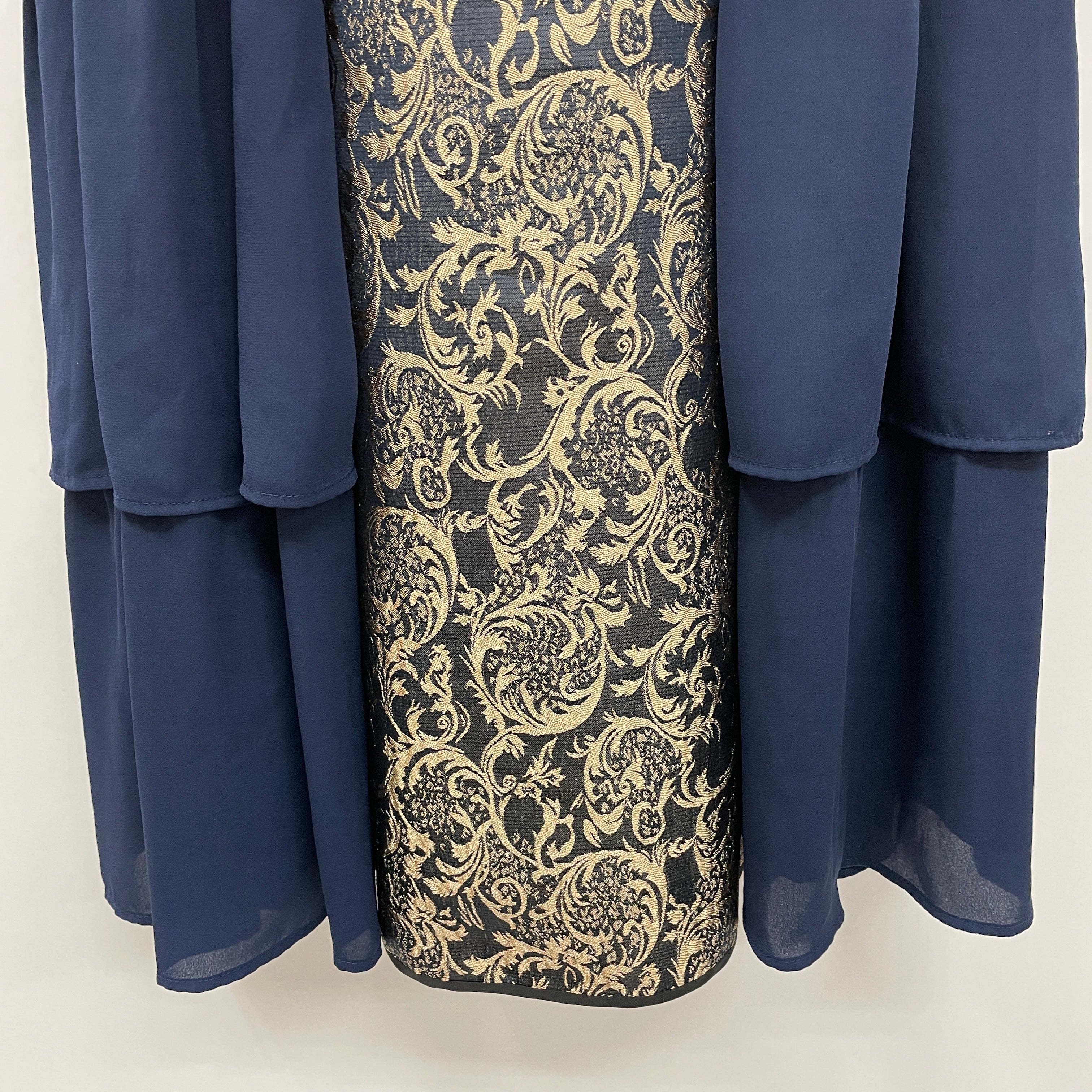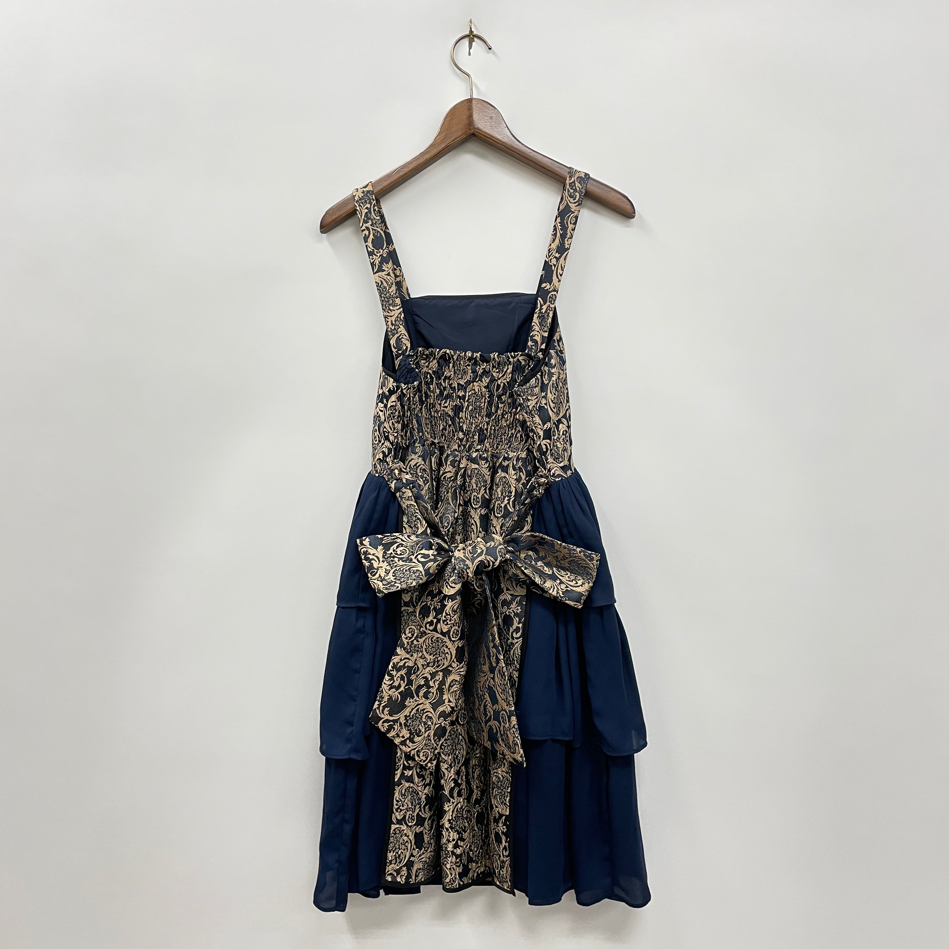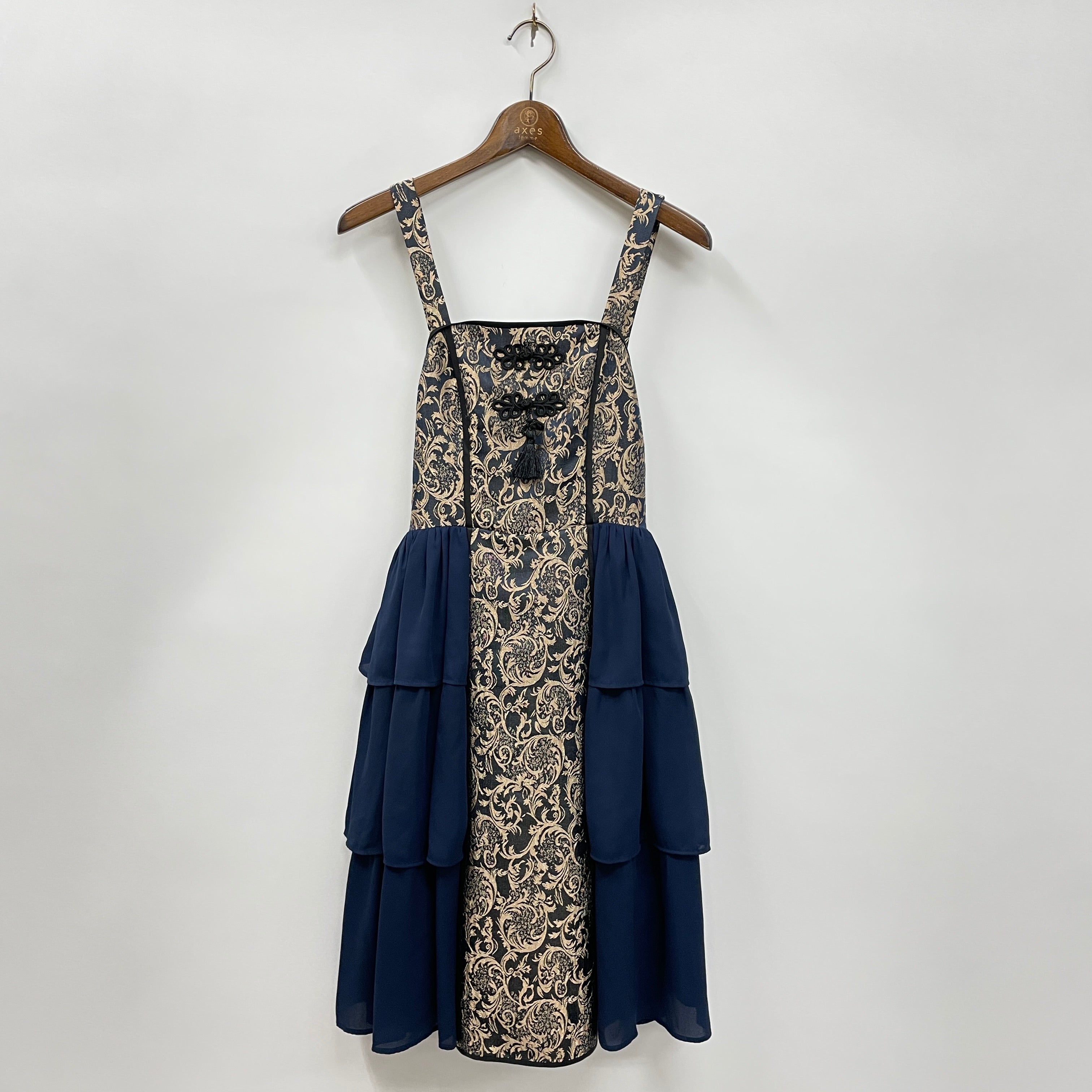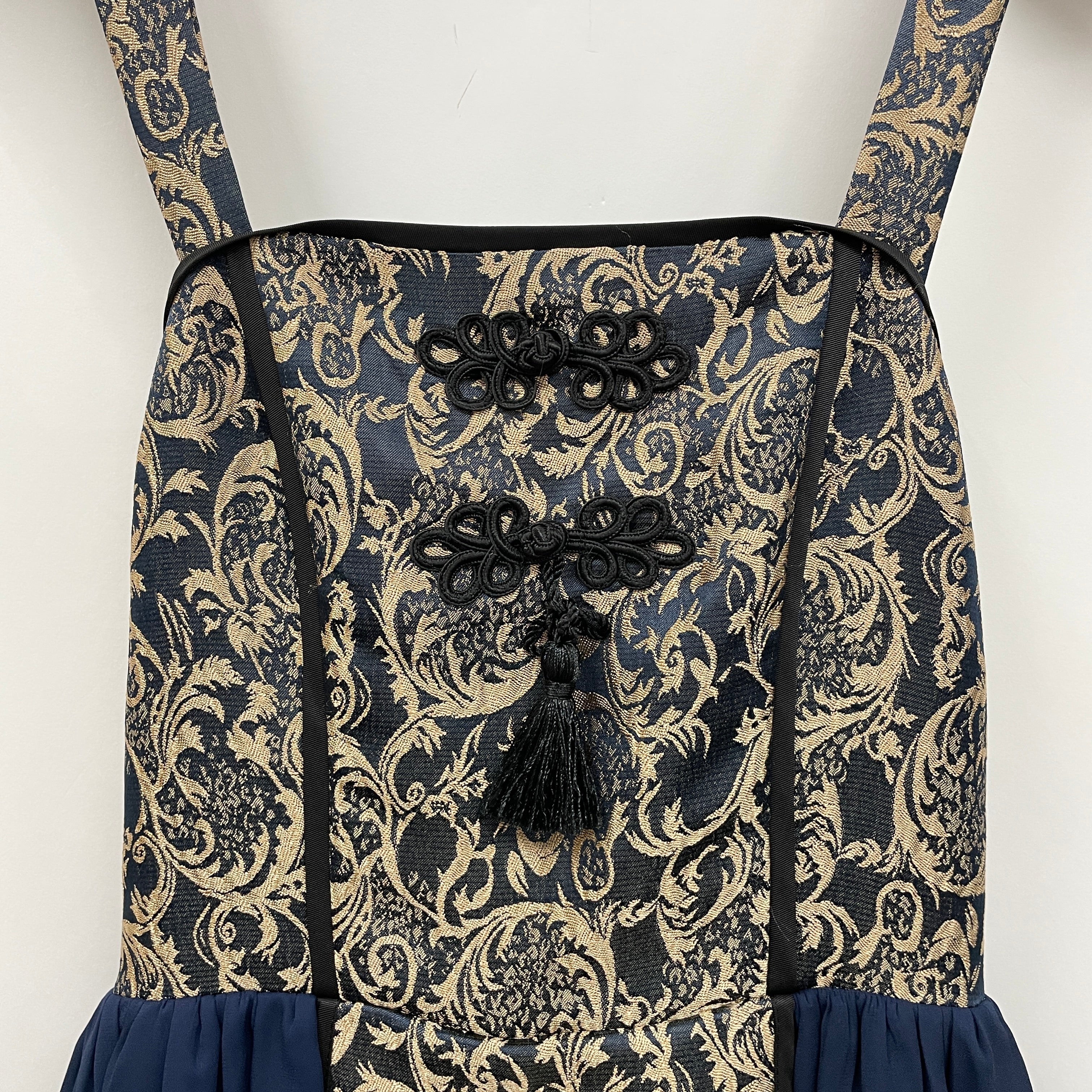 スカートの両サイドが三段フリルになったボリューミーなチャイナデザインのジャンパースカートです。豪華なジャガード生地で一気に華やかになる1着です。下にパニエを履いてシルエットを綺麗に出すのがおすすめです。
