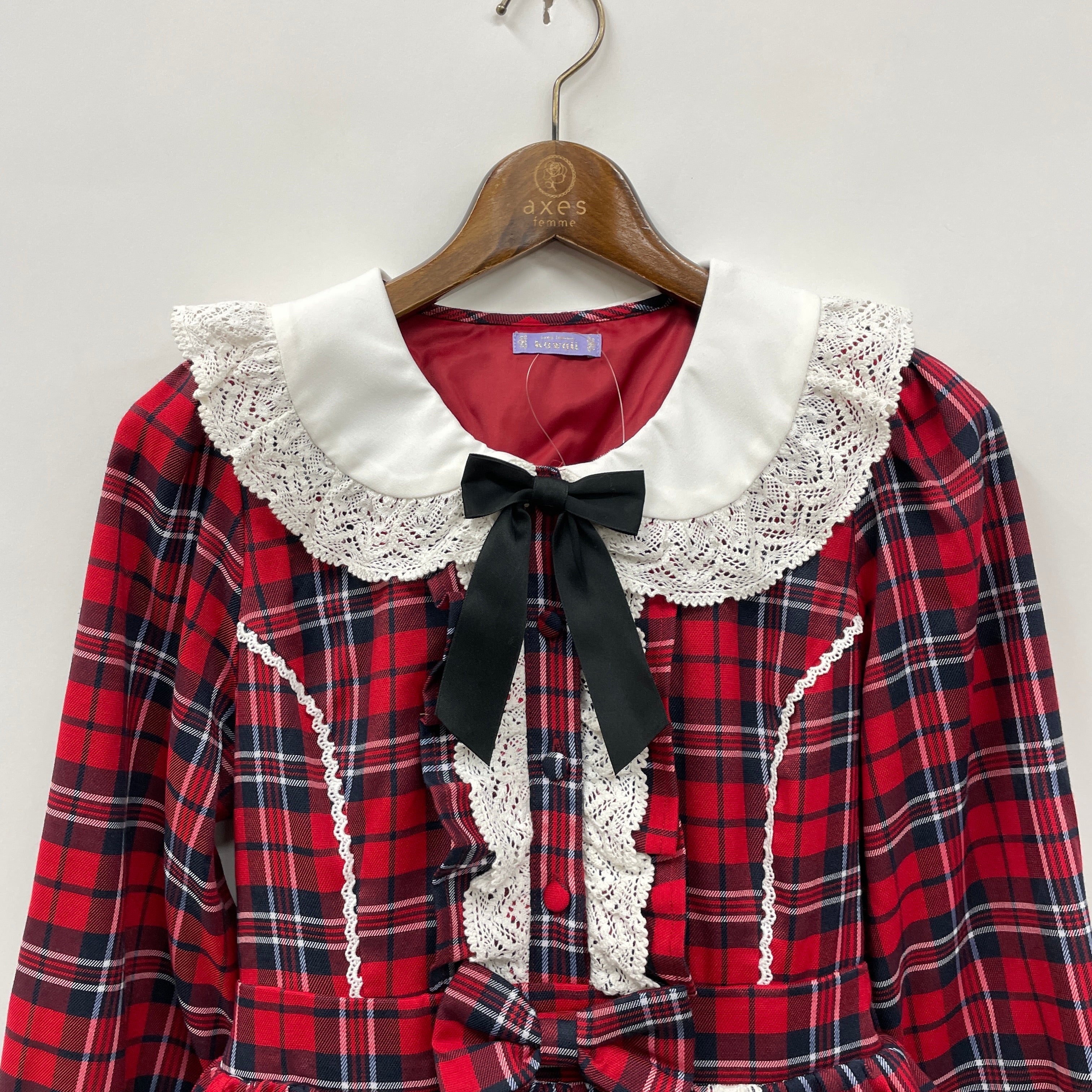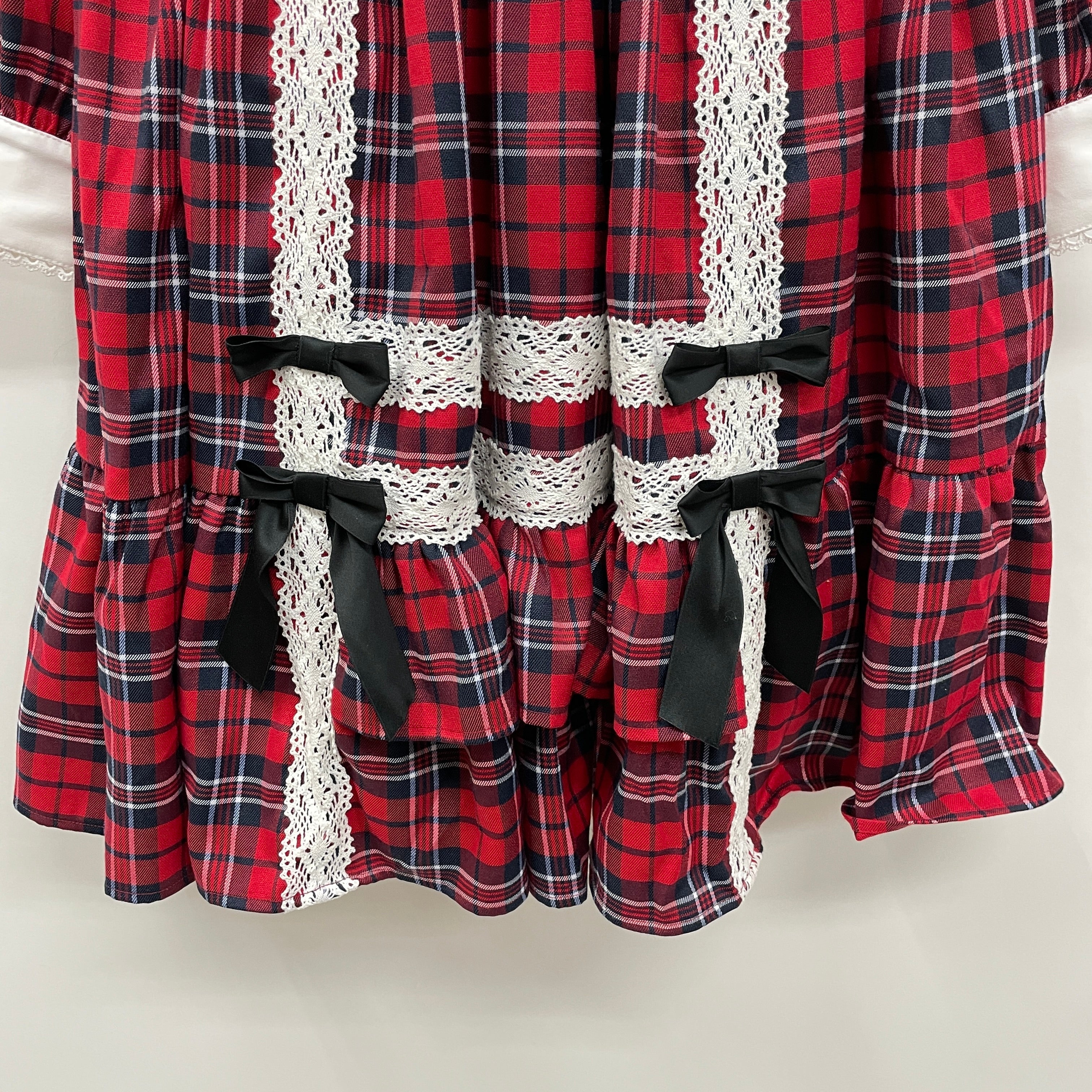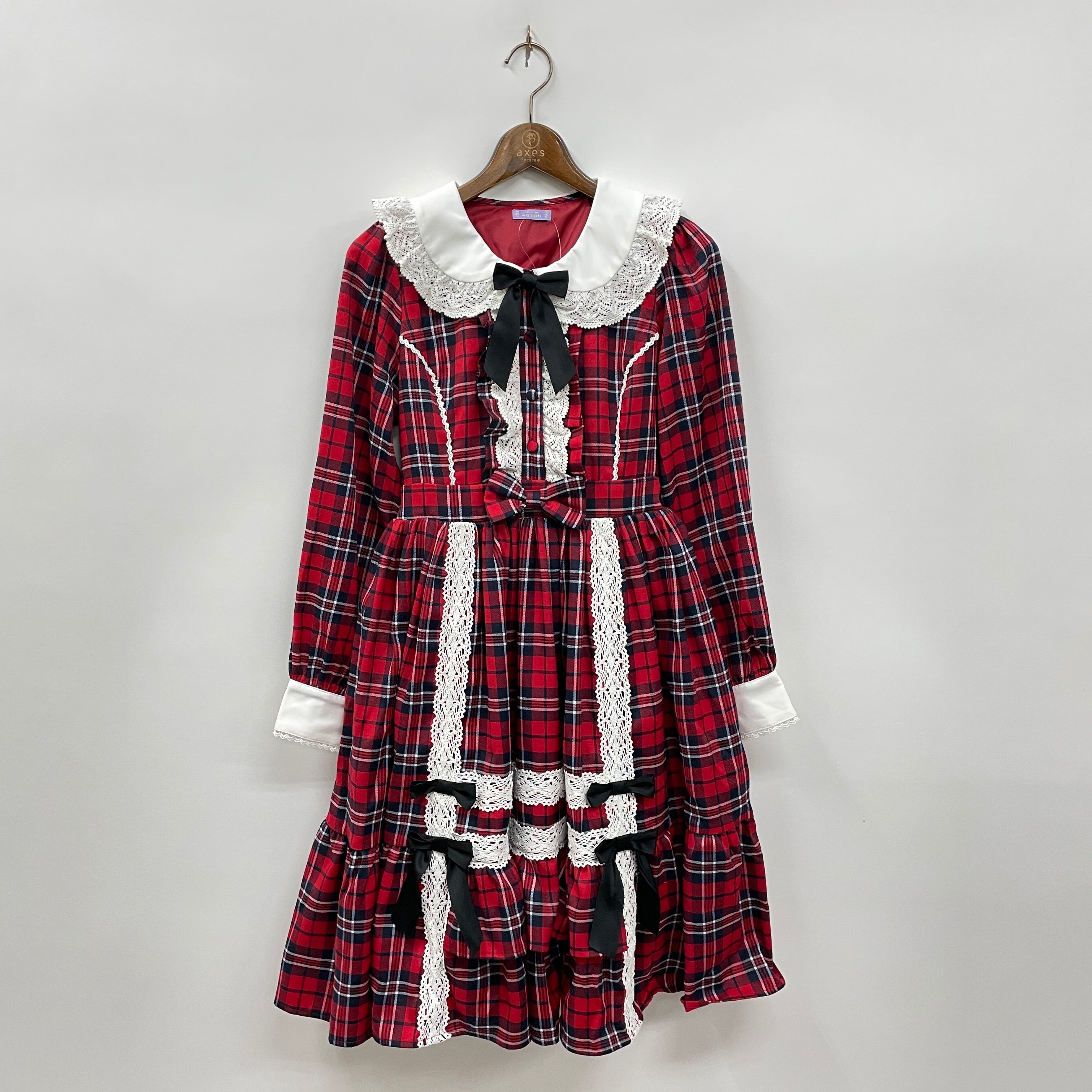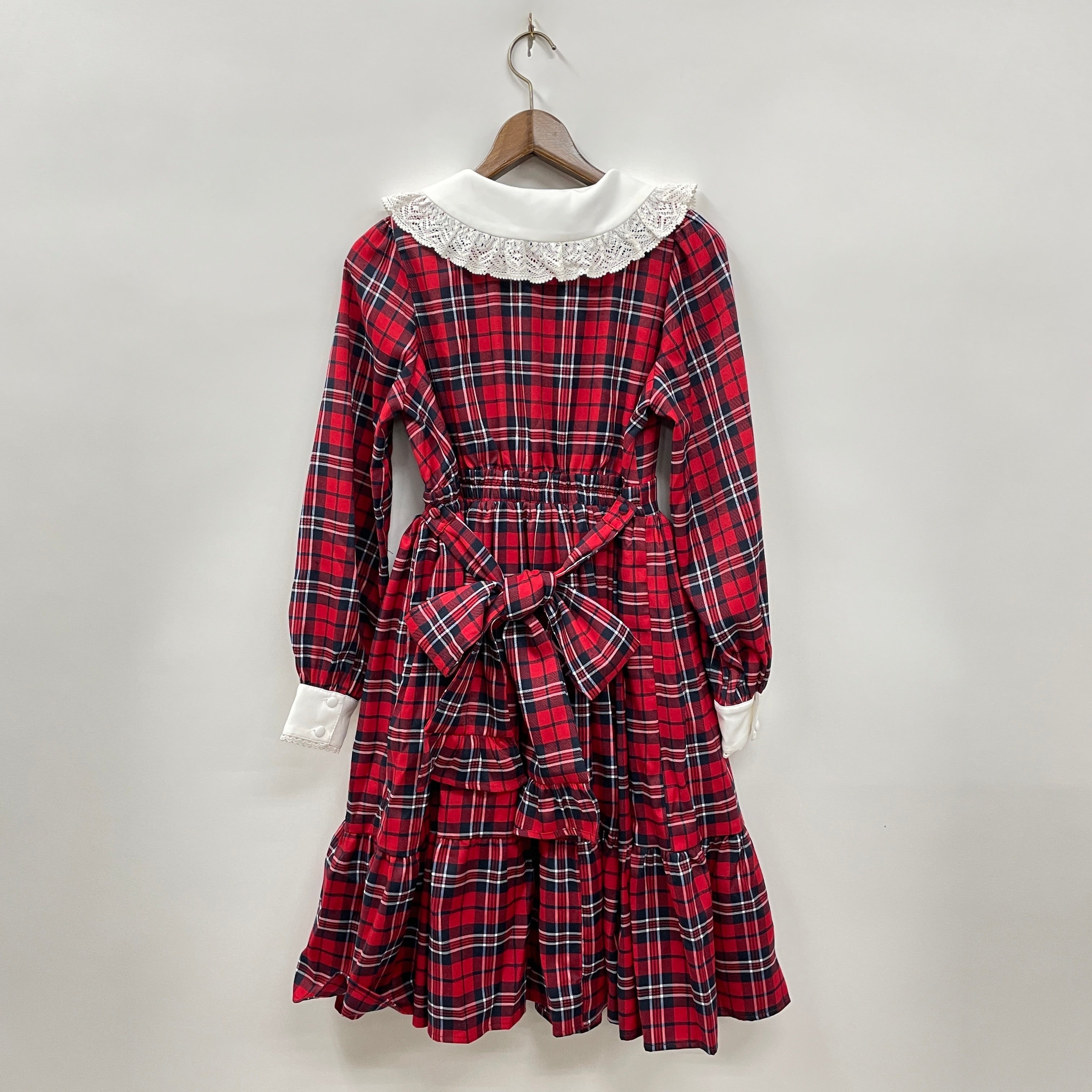 頭物やバッグとお揃いのタータンチェック柄を使用した長袖ワンピースです。丸襟でケミカルレースをあしらったドーリーなシルエット。