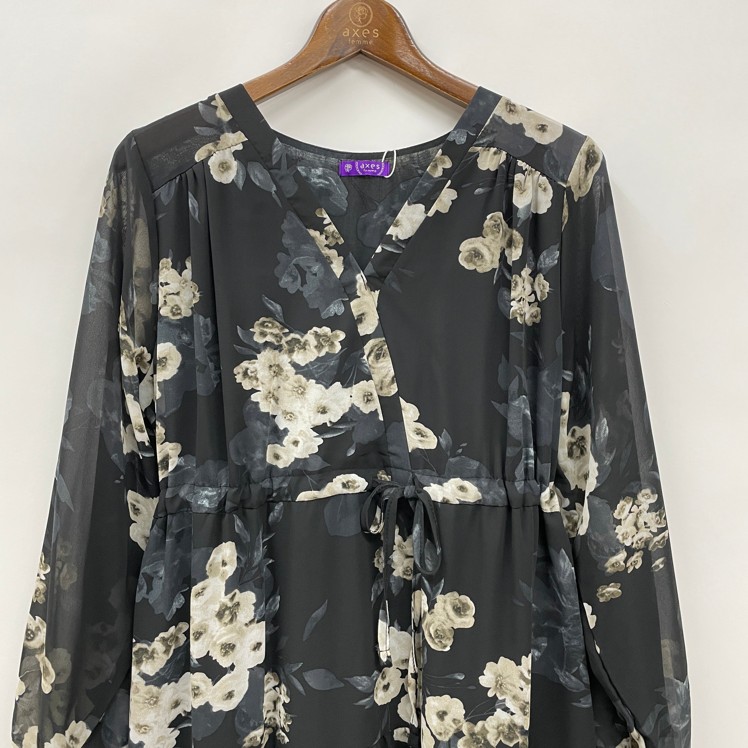 大胆な花柄が全体に施され、シンプルながらも存在感を放つデザイン。Vネックで顔周りがすっきりと見え、女性らしさを引き立てます。