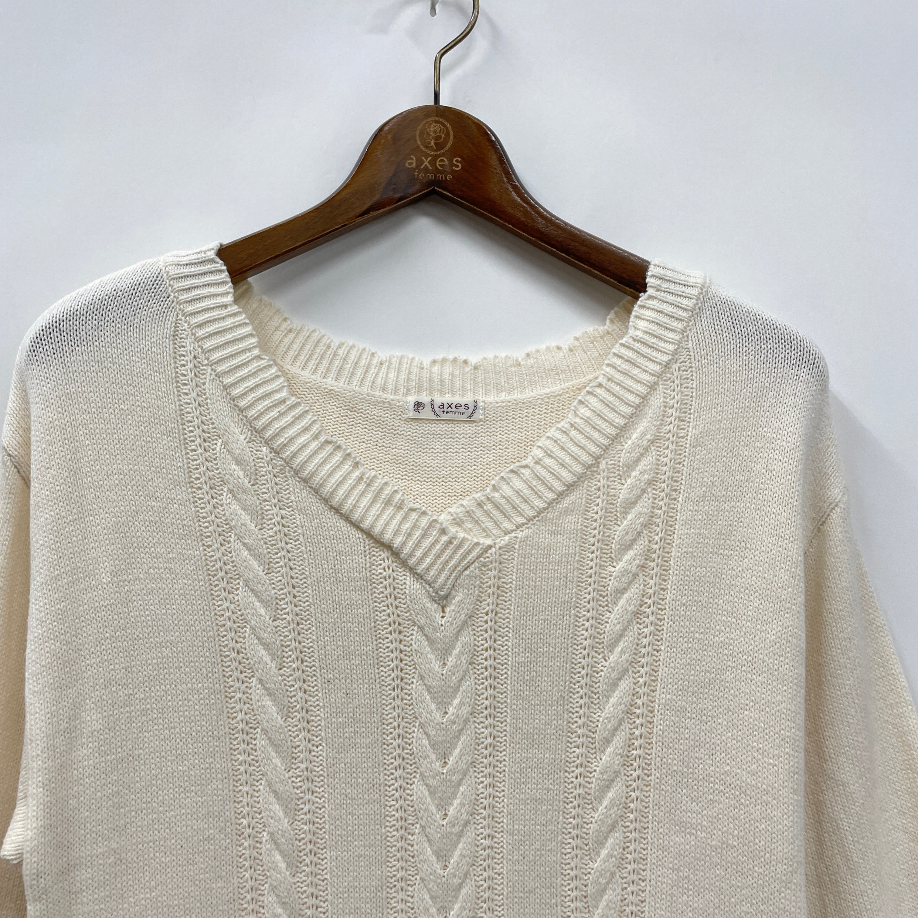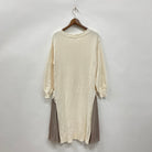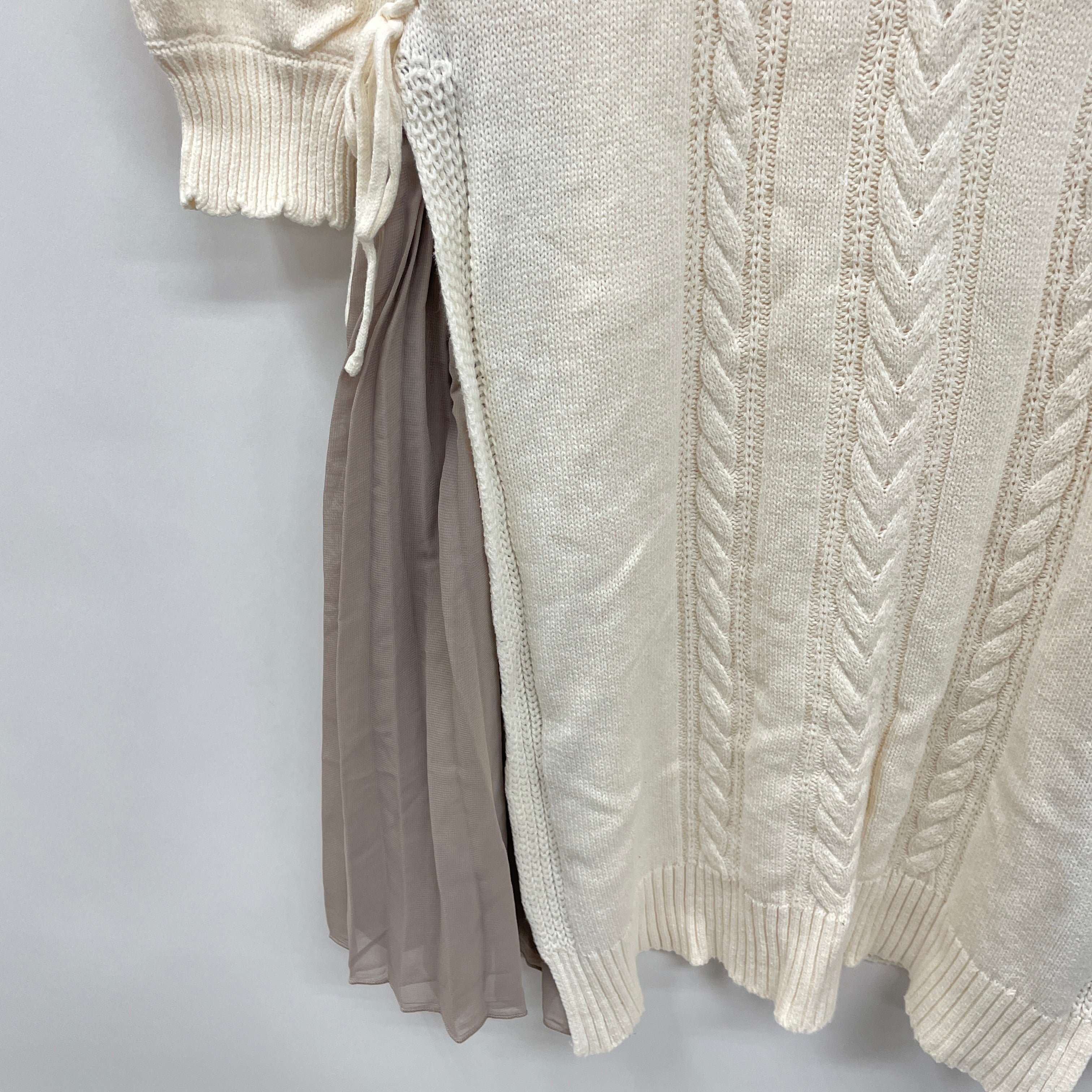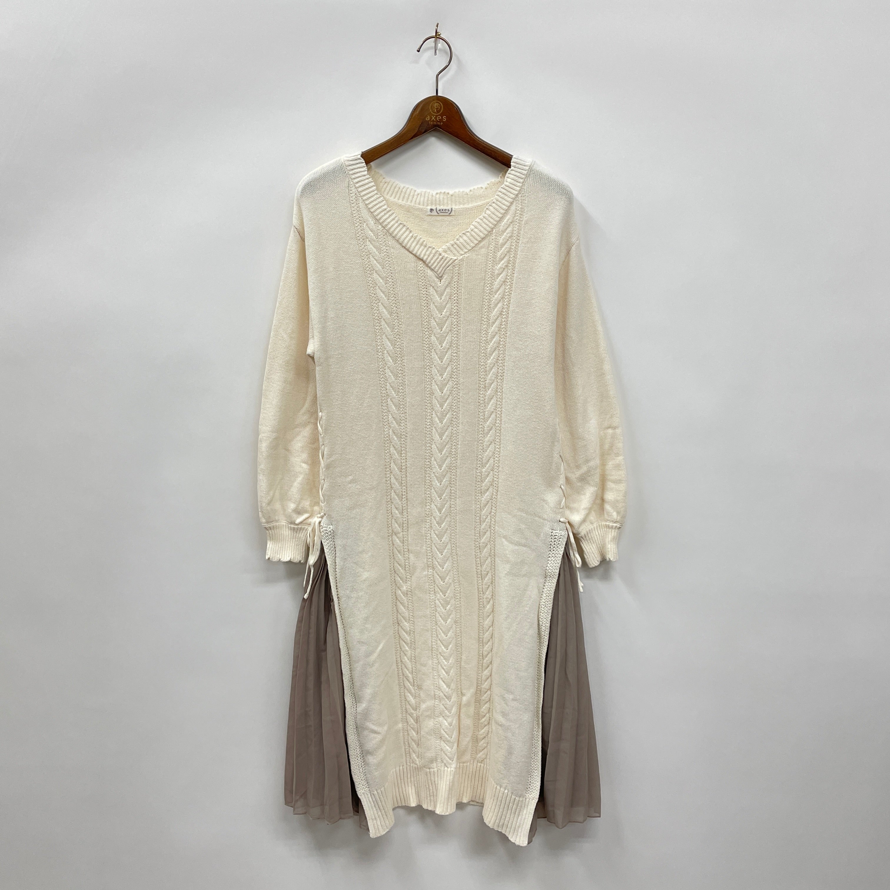 トレンドライクなサイドプリーツを取り入れたニットワンピース。配色がポイントになります。Vネックなので、中にタートルなどを合わせて温かく着まわせます。
