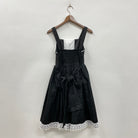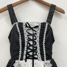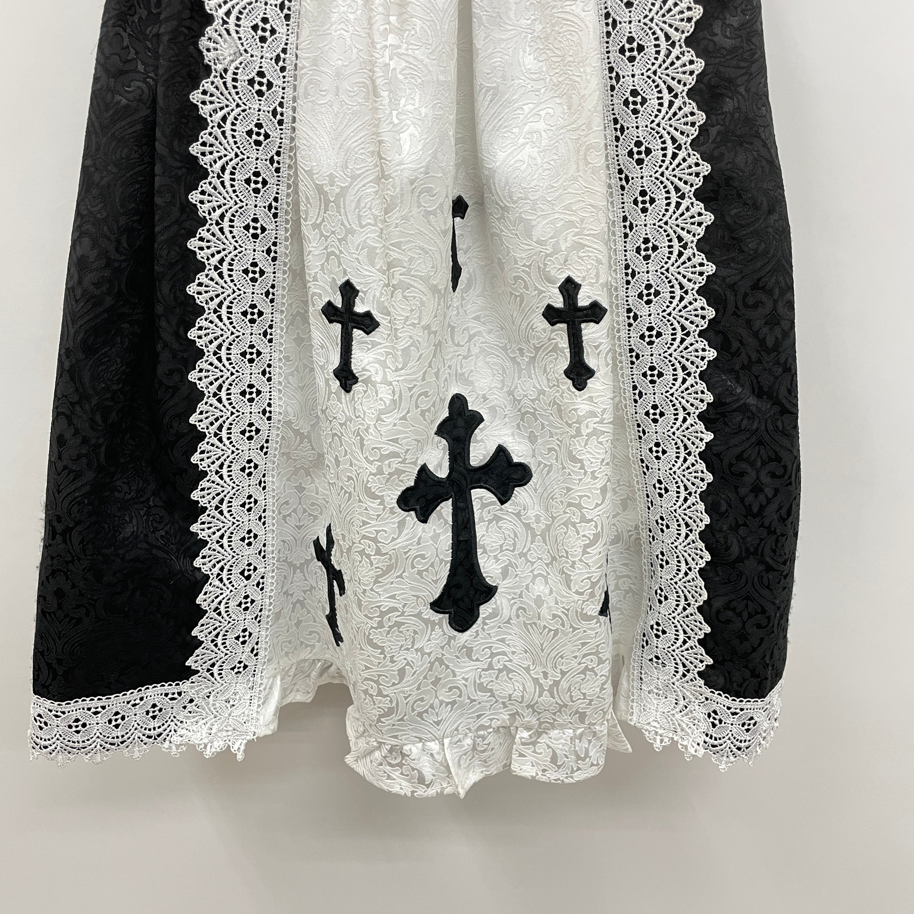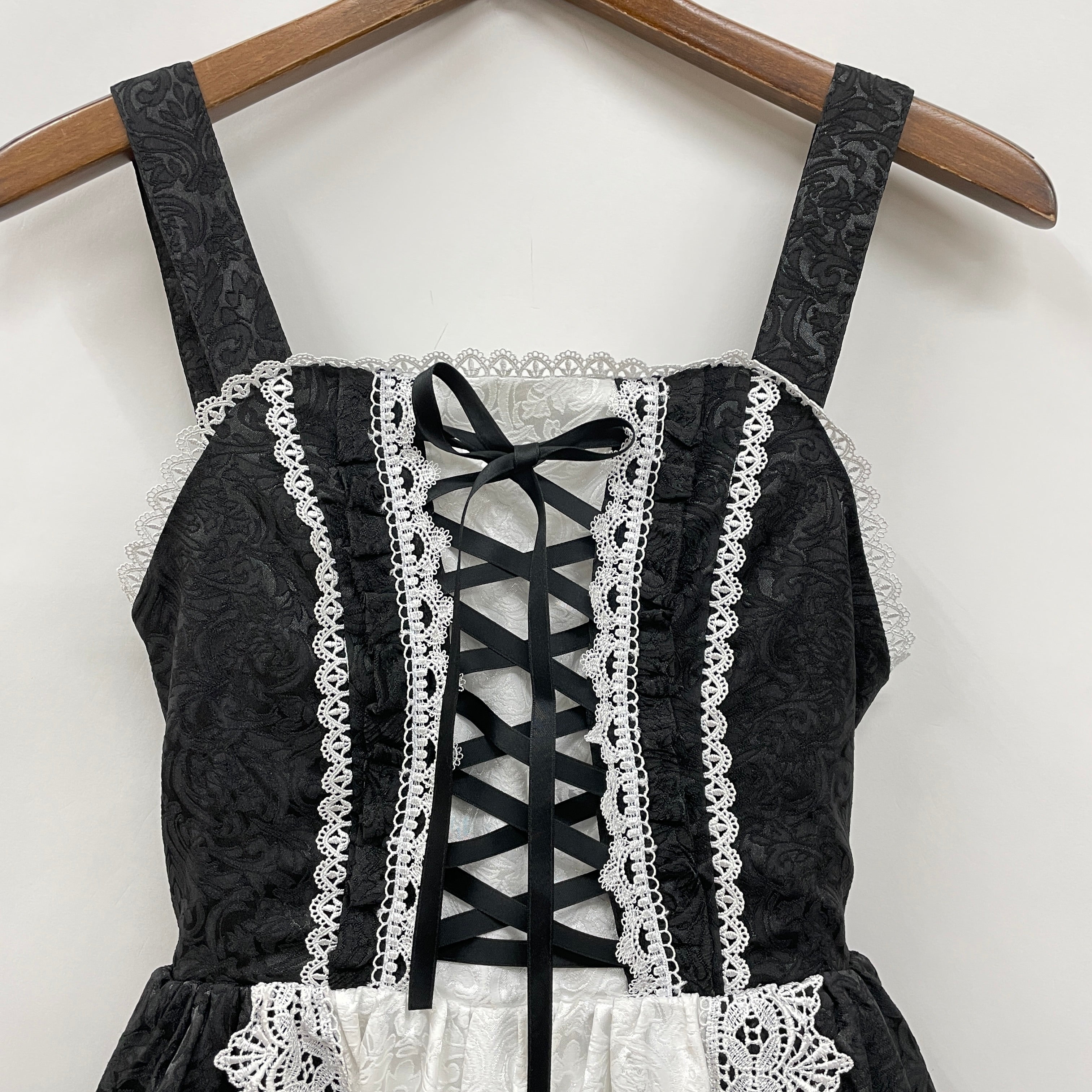 上身頃は胸元のレースアップ、スカートには大きな十字架モチーフをあしらっています。上品な光沢のジャガード生地をたっぷり使用したジャンパースカートです。