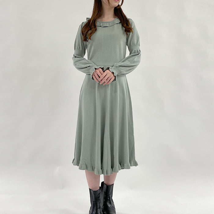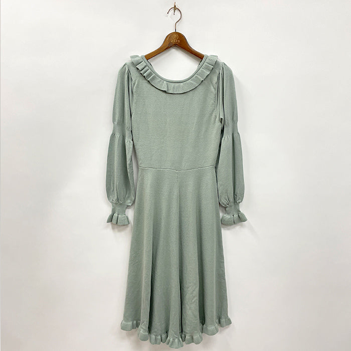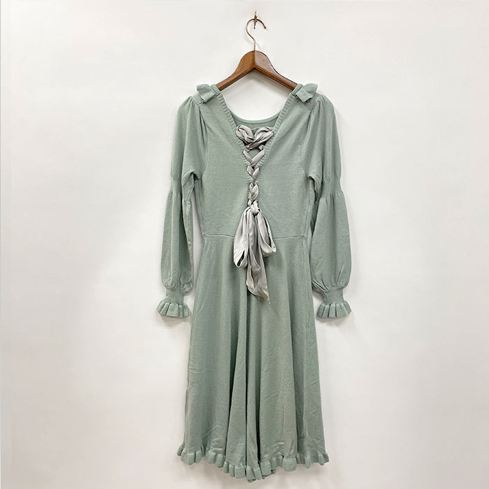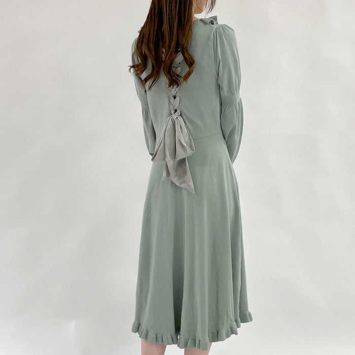 背中が上品な艶のサテンリボンで大胆にレースアップされたフェミニンなニットワンピース。スカートはフレアがたっぷり入った広がるロマンティックなシルエットです。