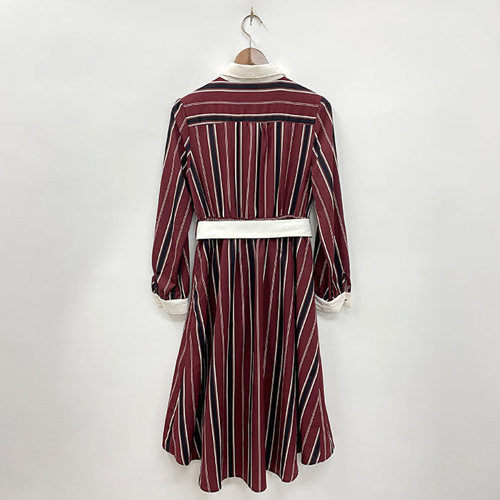 レジメンタル柄がクラシカルなワンピース。レースのデザインやクレリックカラーがさりげないデザインポイント。かすかにフィッシュテールのデザインで足のラインをキレイにみせていただけます。