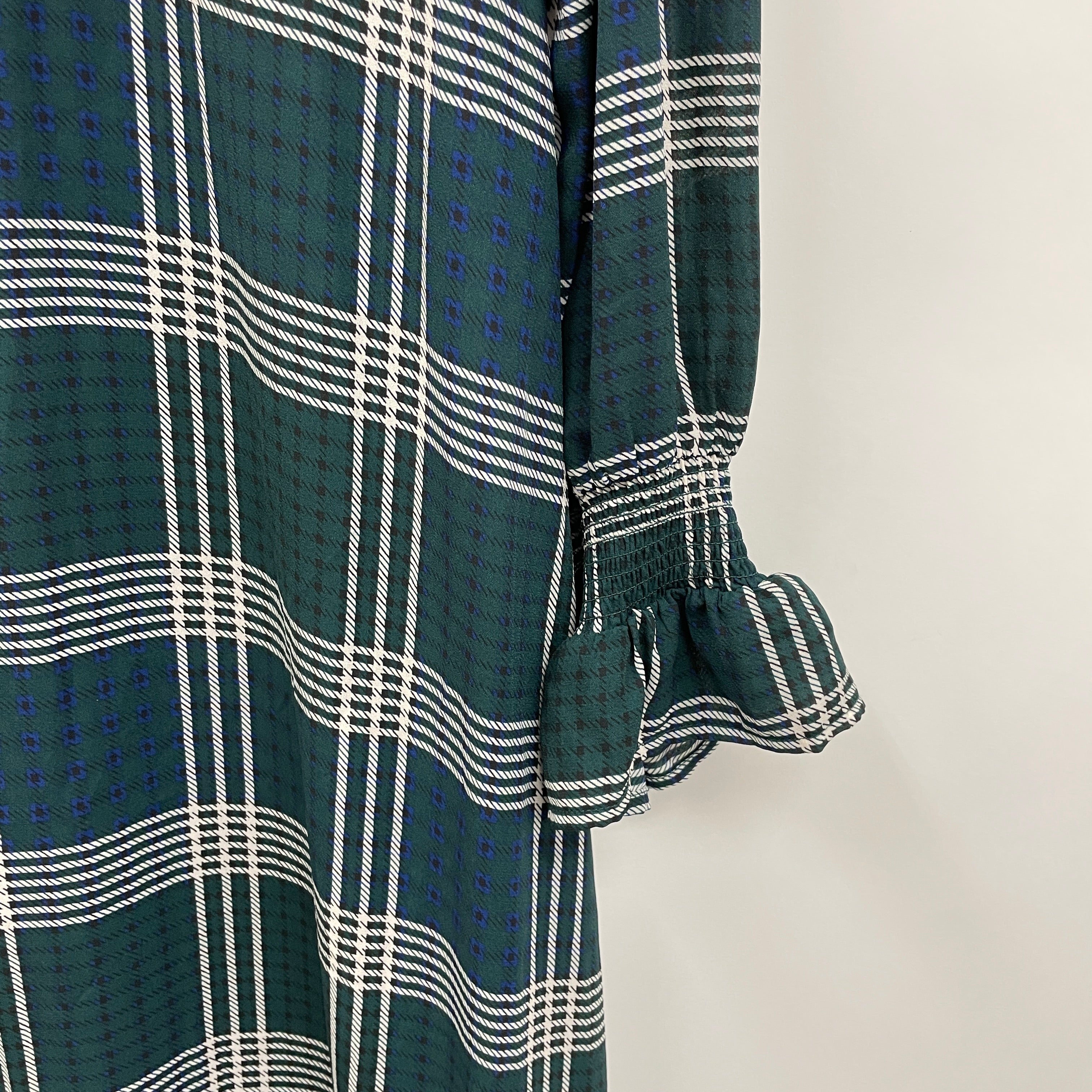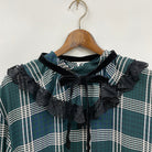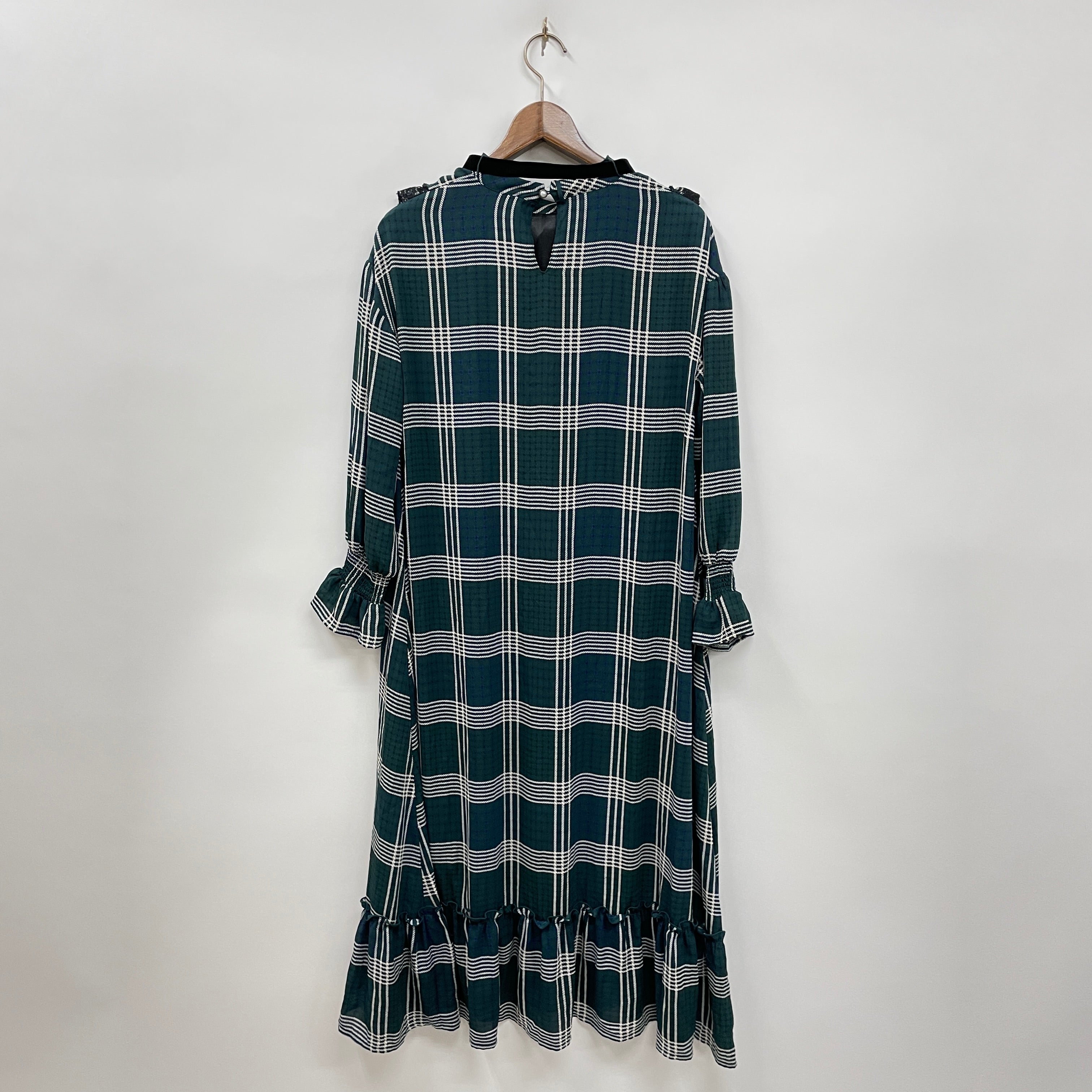首元のフリルがポイントのチェック柄ワンピース。裾のフリル切り替えや袖のシャーリングフリルデザインがクラシカルなアイテム。ベロアリボンは取り外し可能で、アクセサリーに変えたり、フリルインナーを首元から覗かせても◎。今季はベストとあわせトレンドライクなスタイリングもおすすめです。