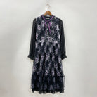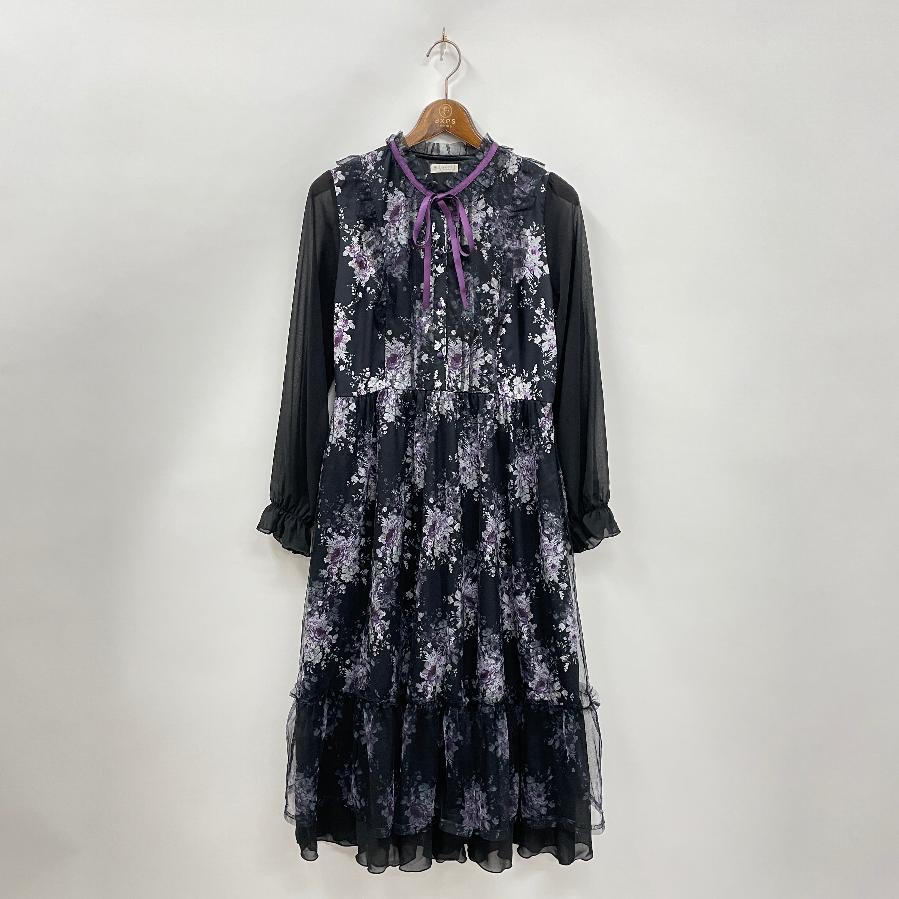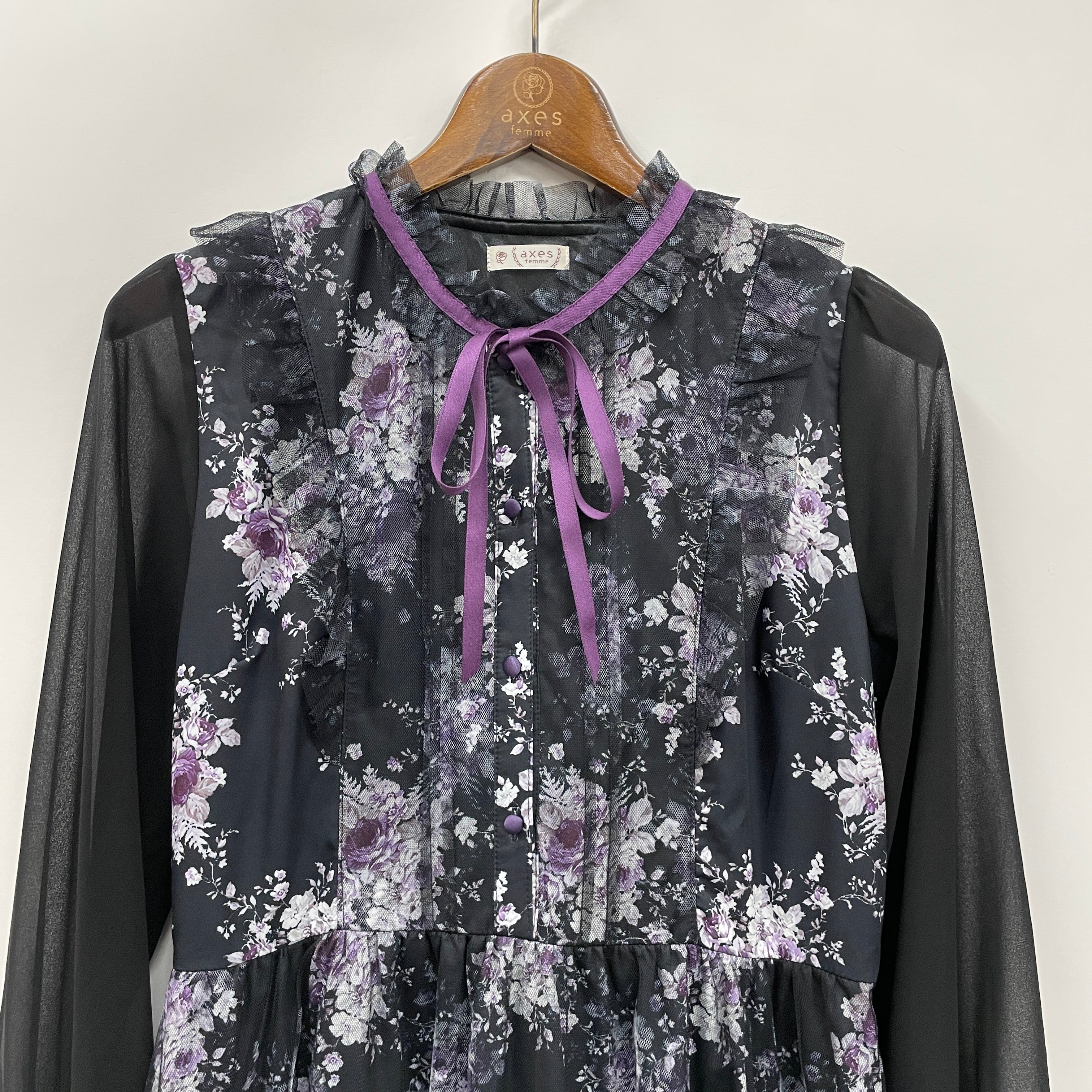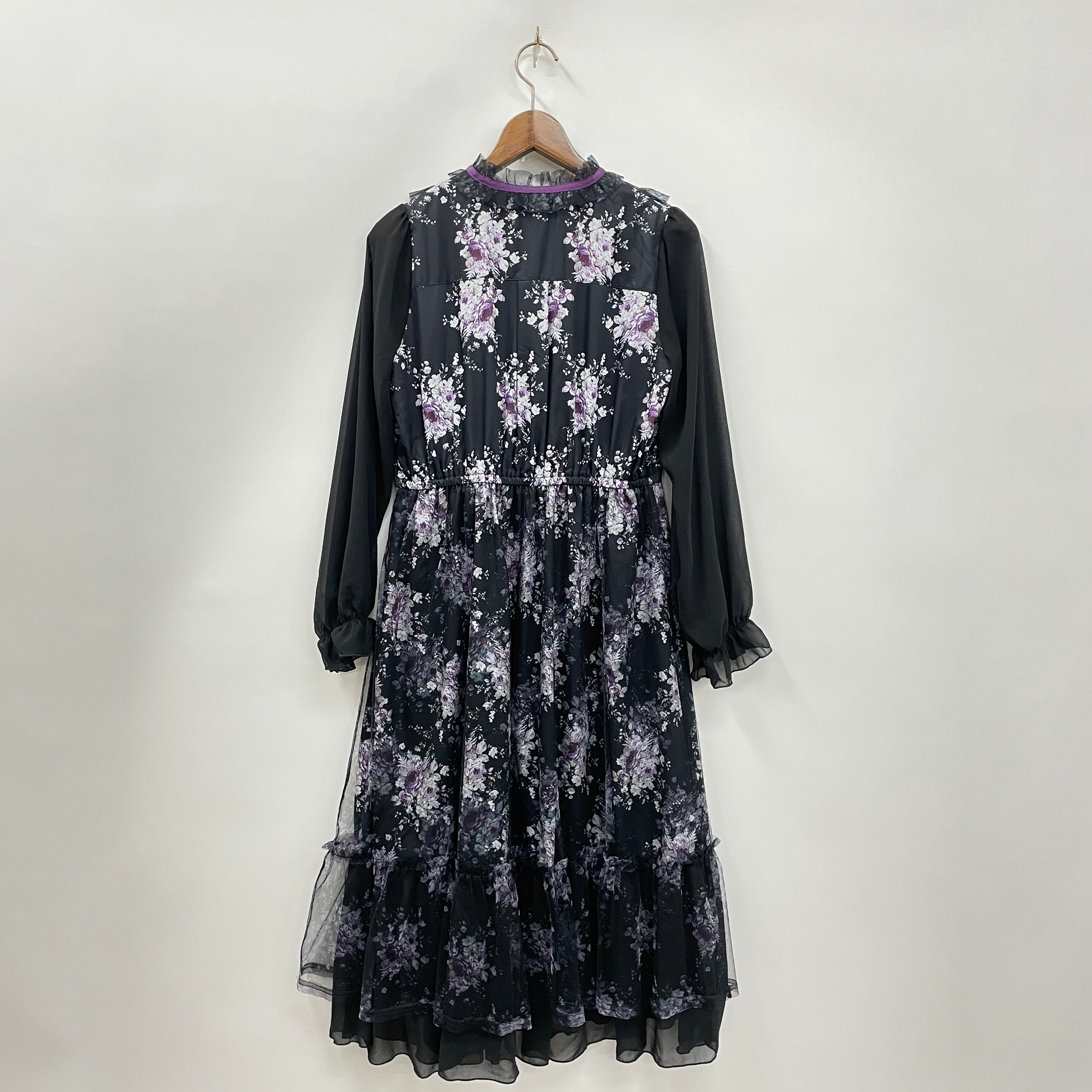 華やかなローズブーケプリントをプリントしたワンピースです。重なり、素材の違いで見え方が異なりより特別感のあるデザインに。