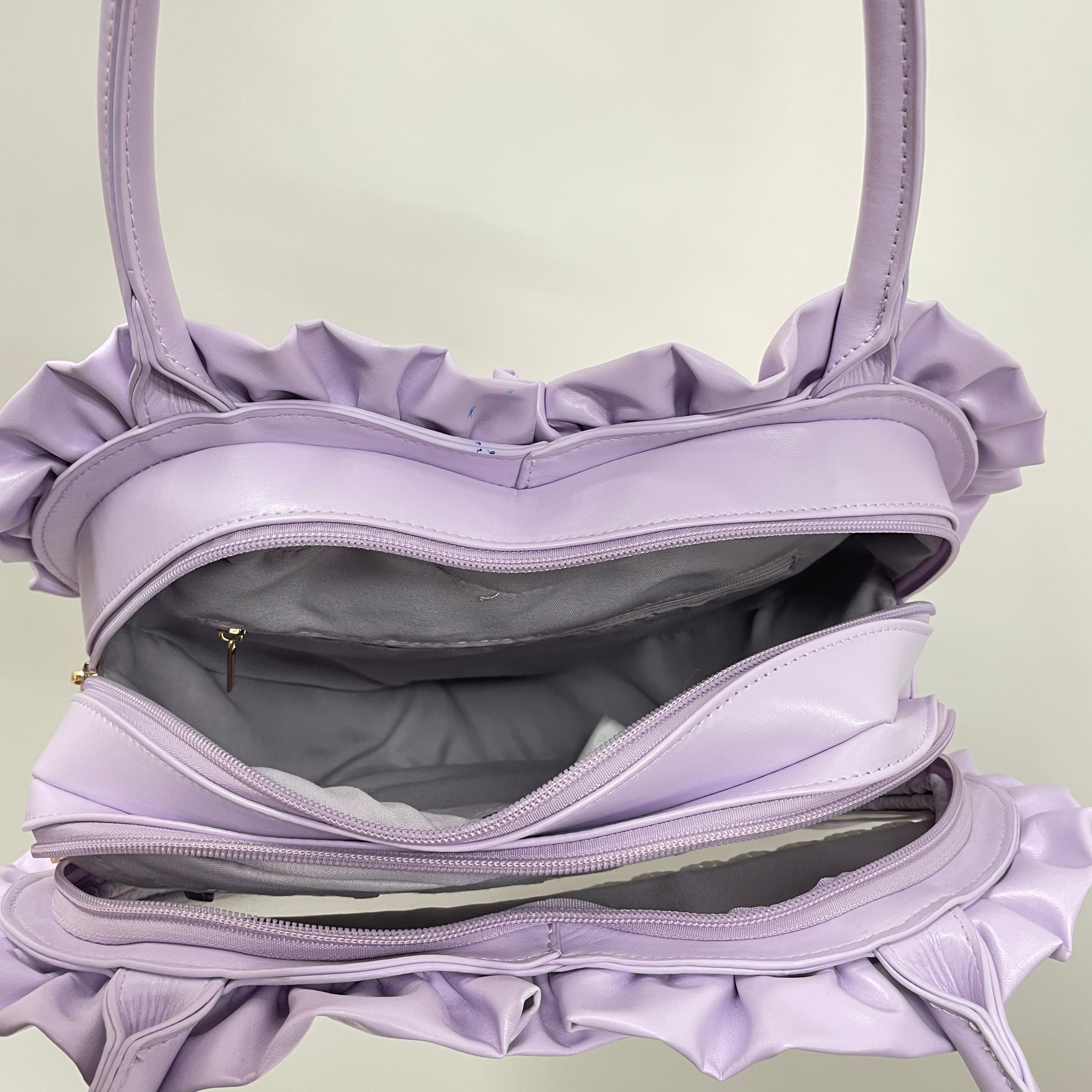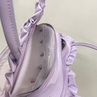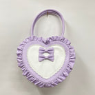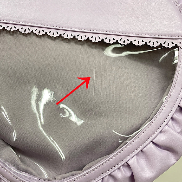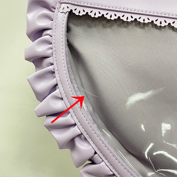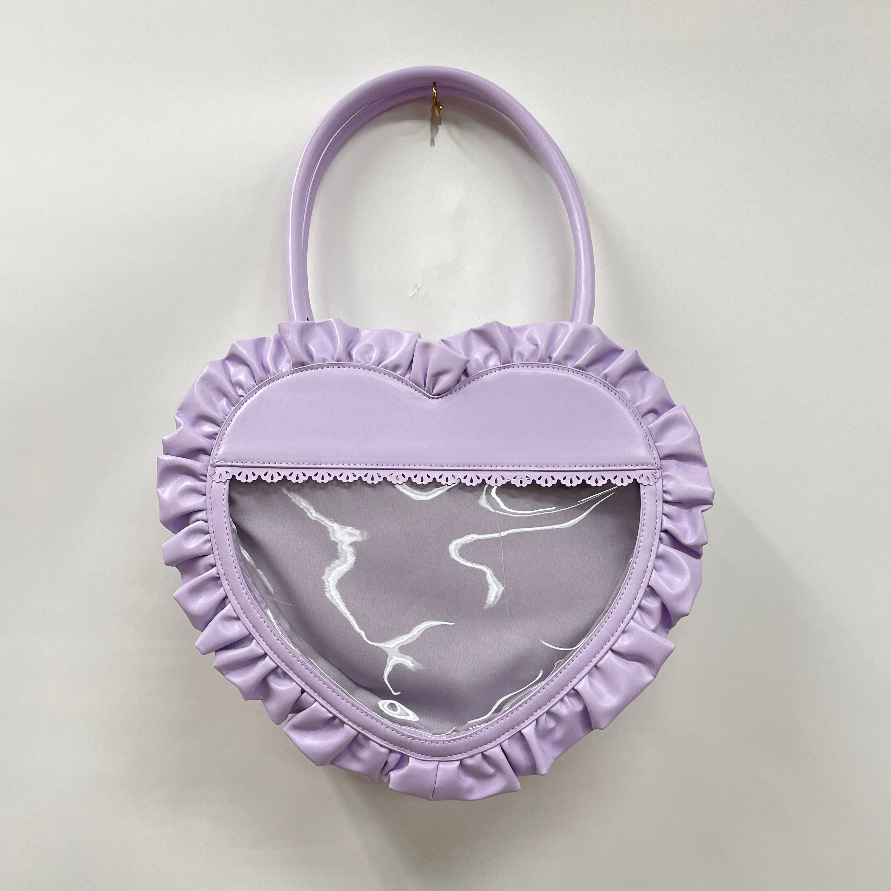 フリルたっぷりのハート型バッグです。クリアポケット面の内側にはループがついており、ボールチェーンやストラップを下げることができます。バック全体のマチは12cmですが、前面側の荷物を入れるスペースのマチは7cm幅で、背面側のクリアポケット側のマチが3cmとなっております。