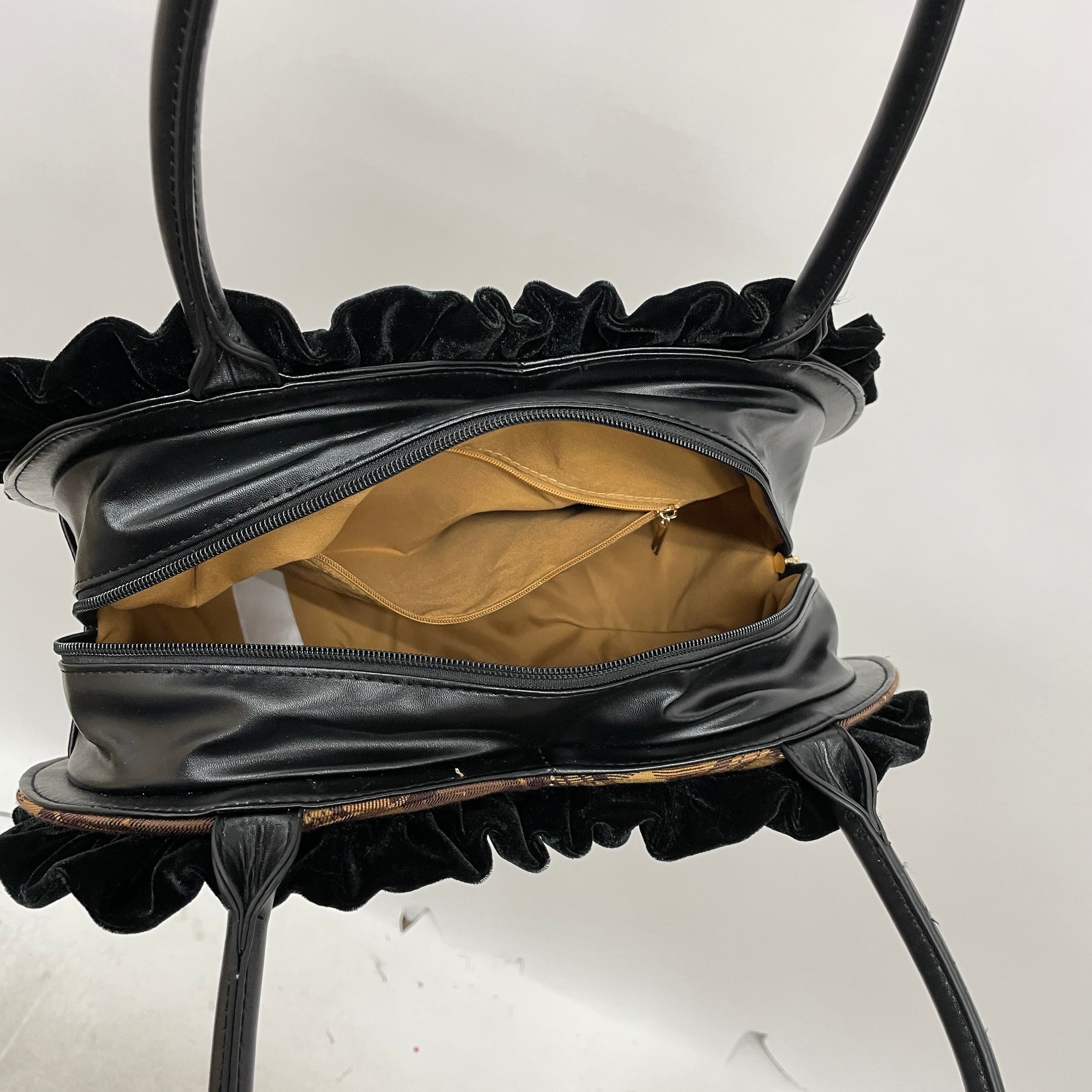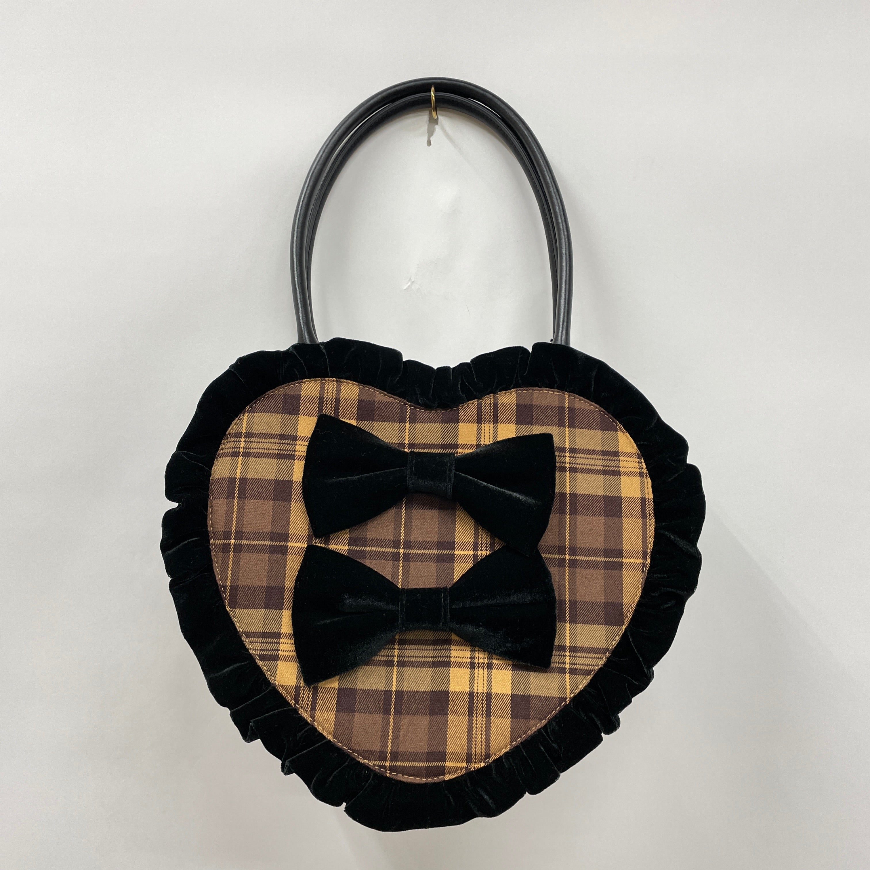 頭物やお洋服とお揃いのタータンチェック柄を使用したハート型バッグです。大き目のベロアリボンをあしらったキャッチーなデザインです。容量もたっぷりあり、荷物がたくさん入るのも嬉しいポイント!