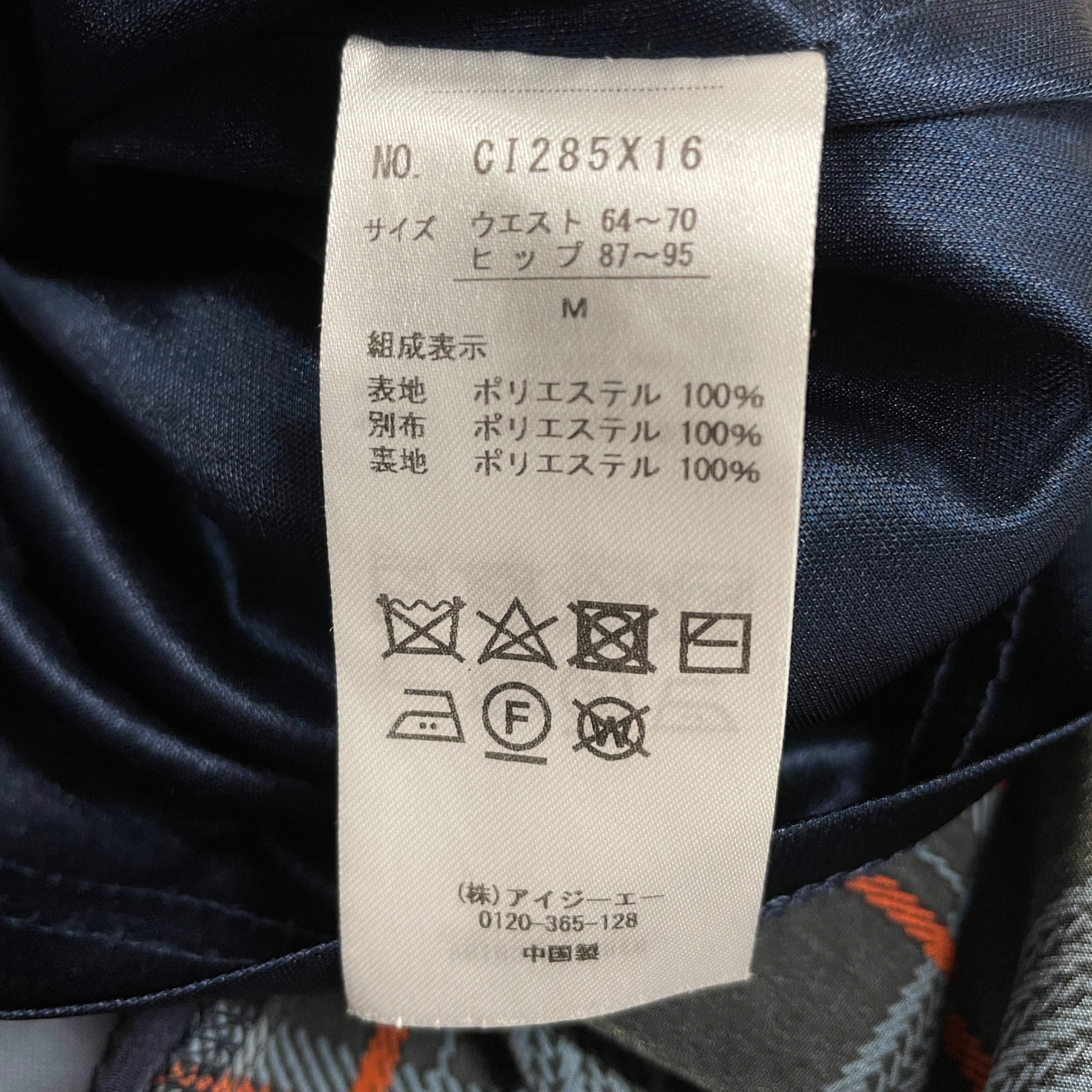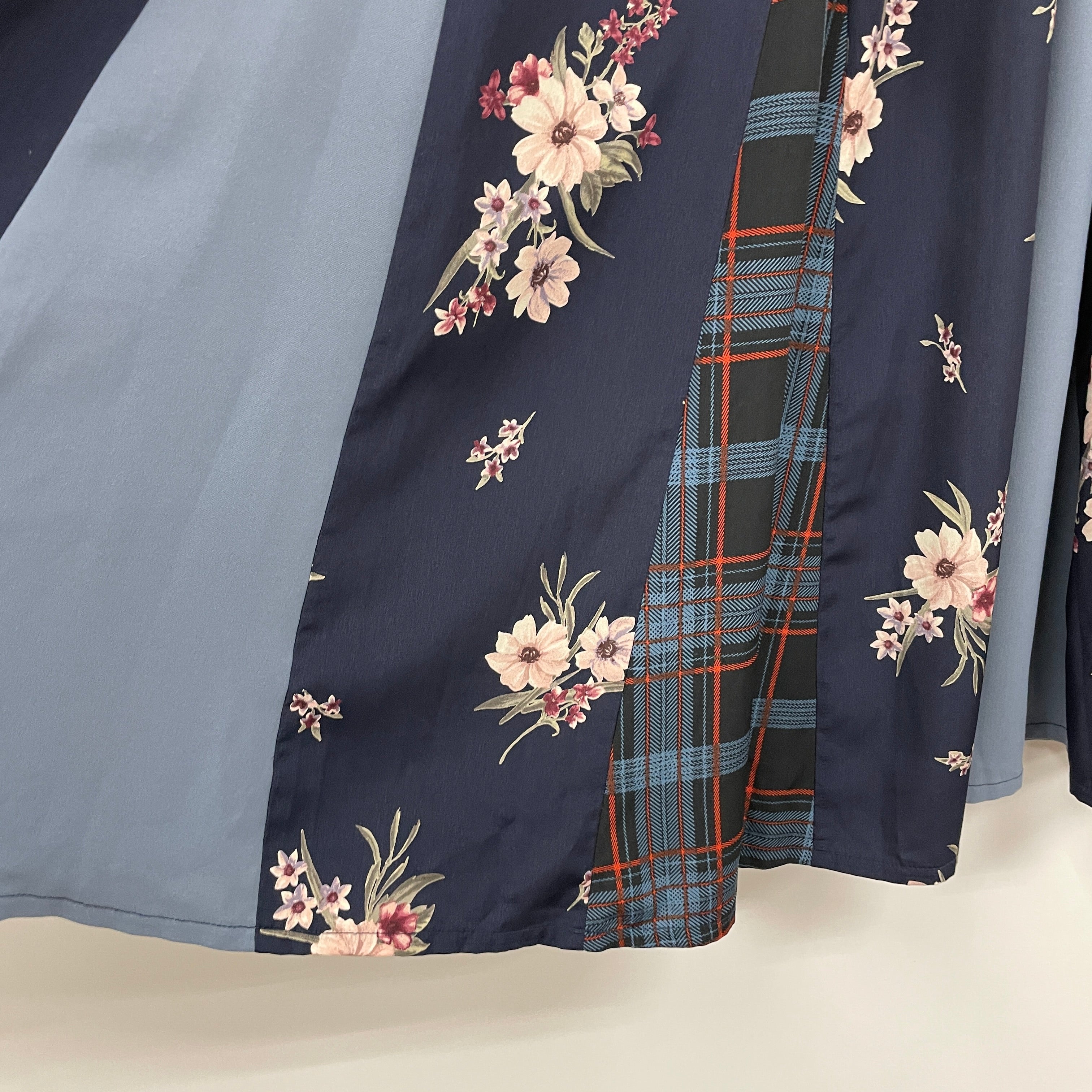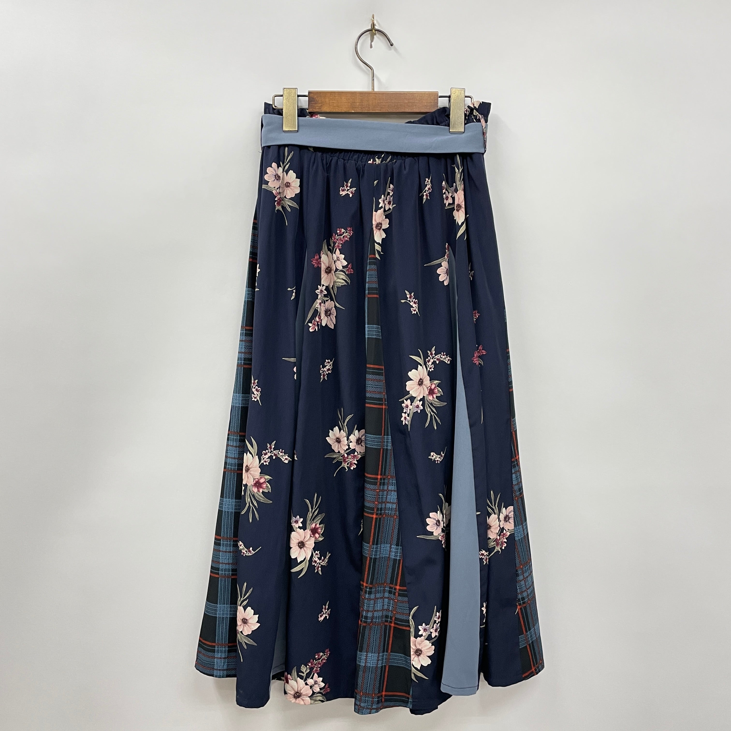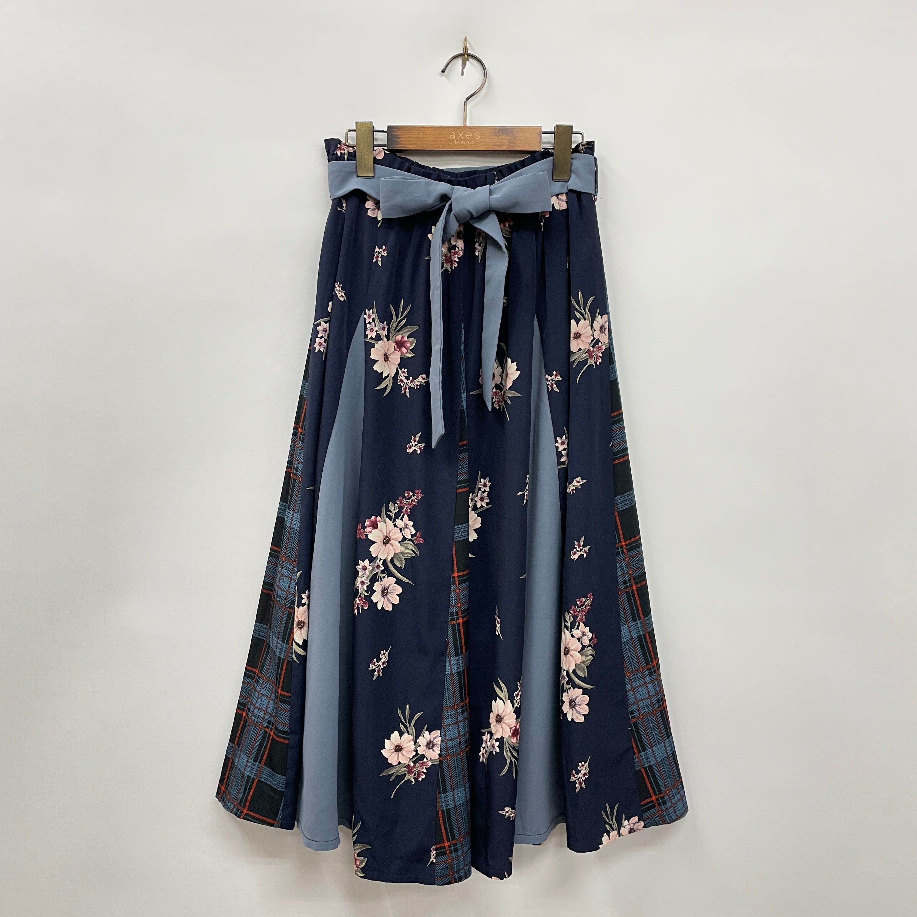 チェック柄・花柄・無地生地ををミックスしたデザインがエレガントなスカート、大人っぽいキレイめスタイリングが完成します。ブラウスやリブニットなどすっきりしたトップスと合わせるのがおすすめ。