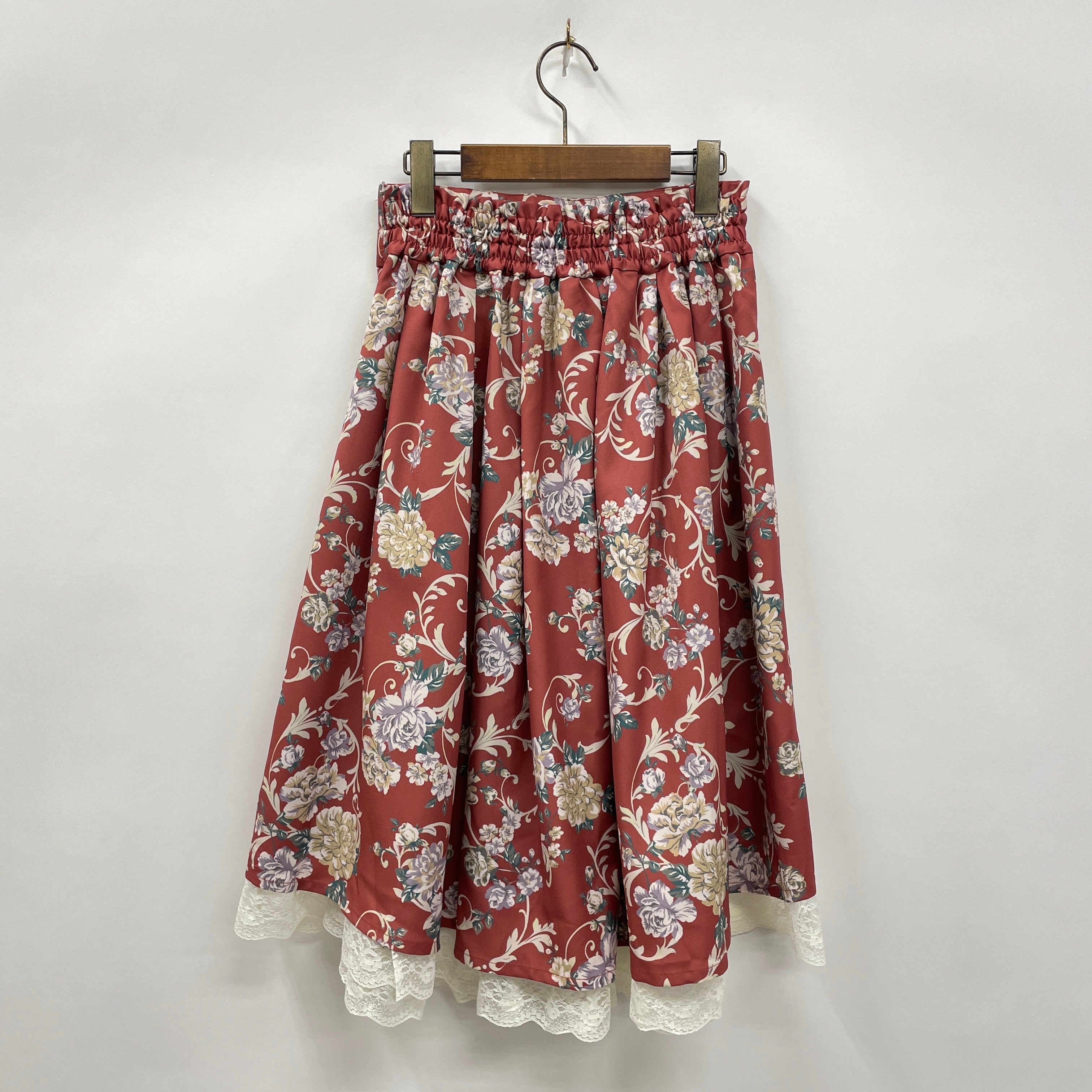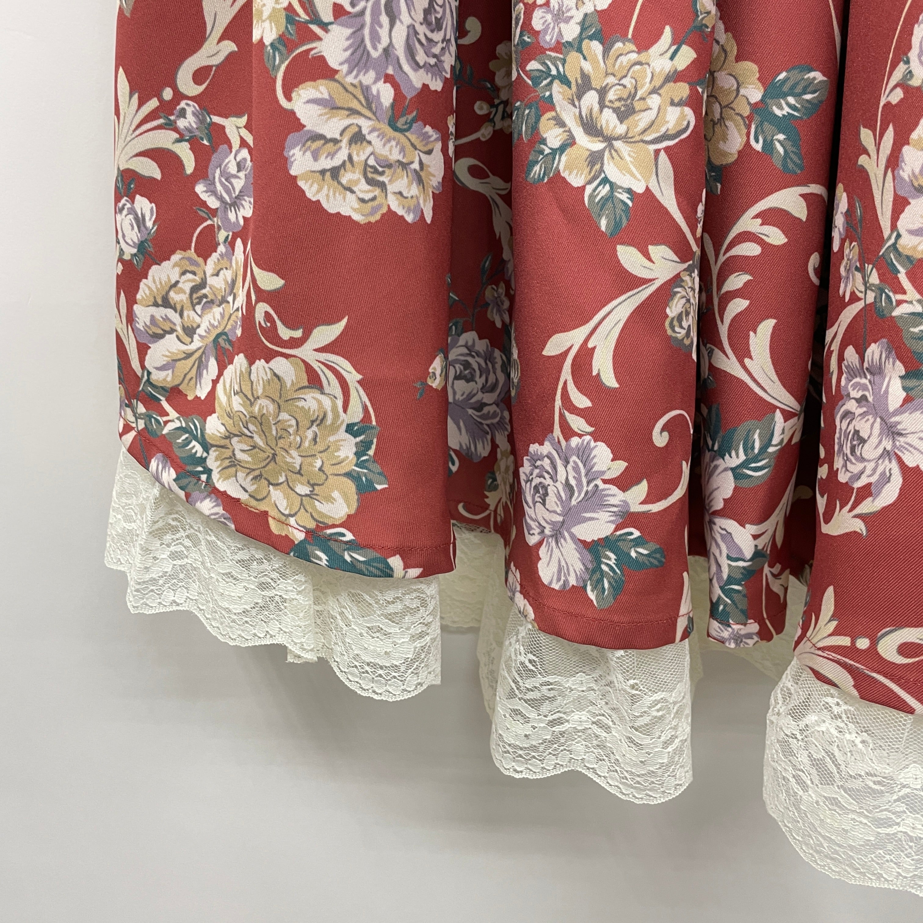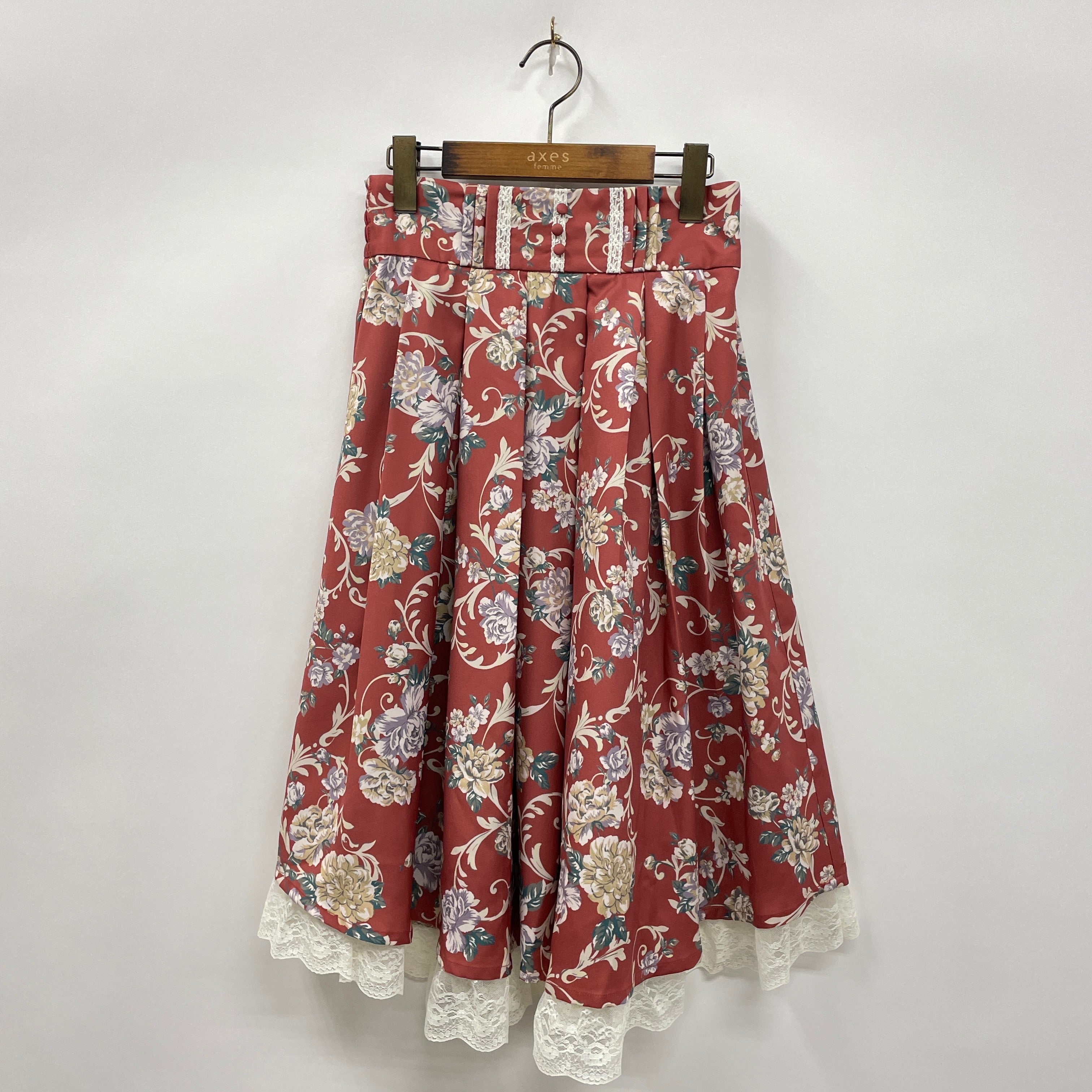タックが入ったミディスカート。ウエストからタックを入れることで広がりすぎずきれいなシルエットを作り上げます。幅広めのウエストはくるみ釦やレース使いでかわいらしいポイントに、裾のレースも華やかさをプラスします。グリーン・オレンジはクラシカルな花柄、黒は使いやすい無地でご用意しています。