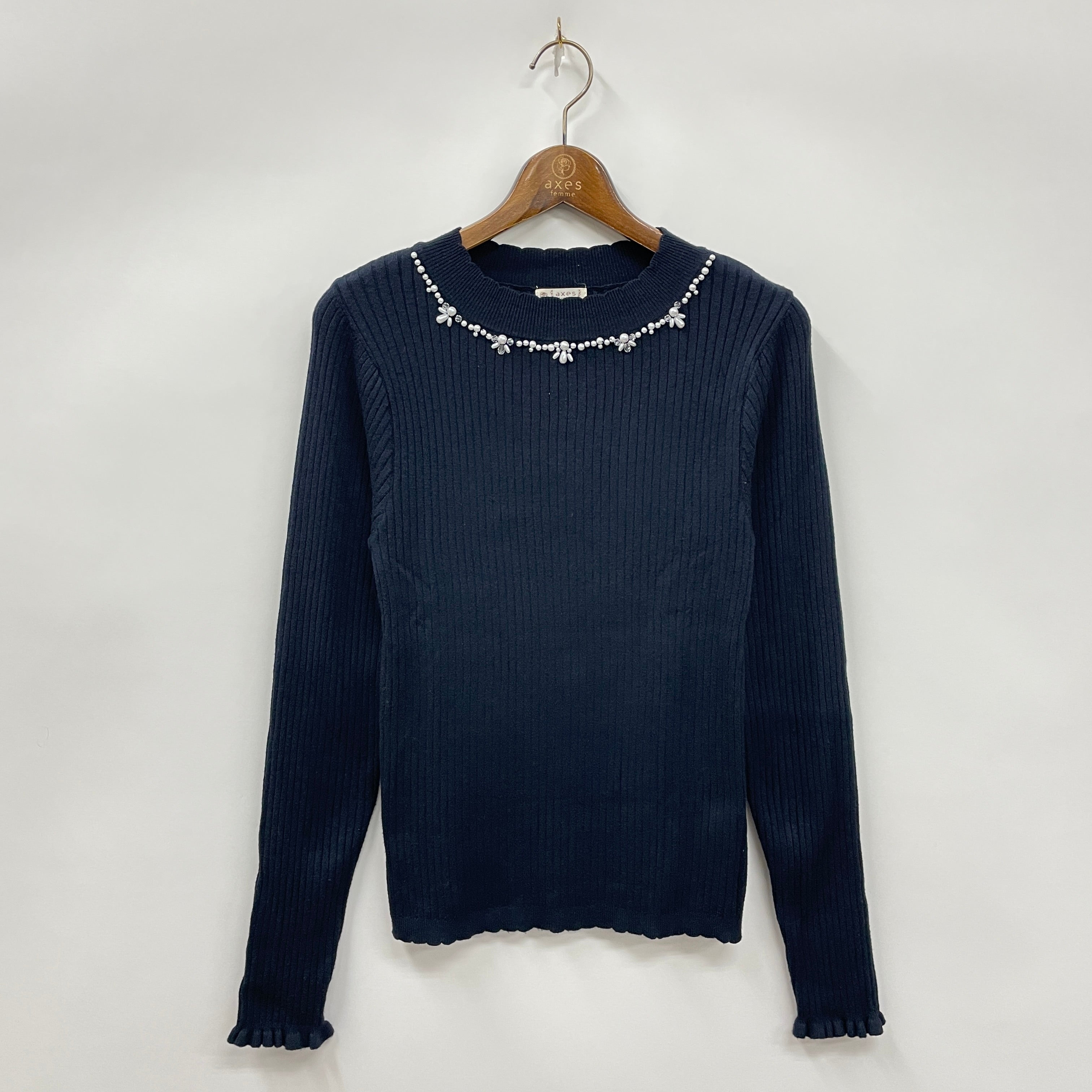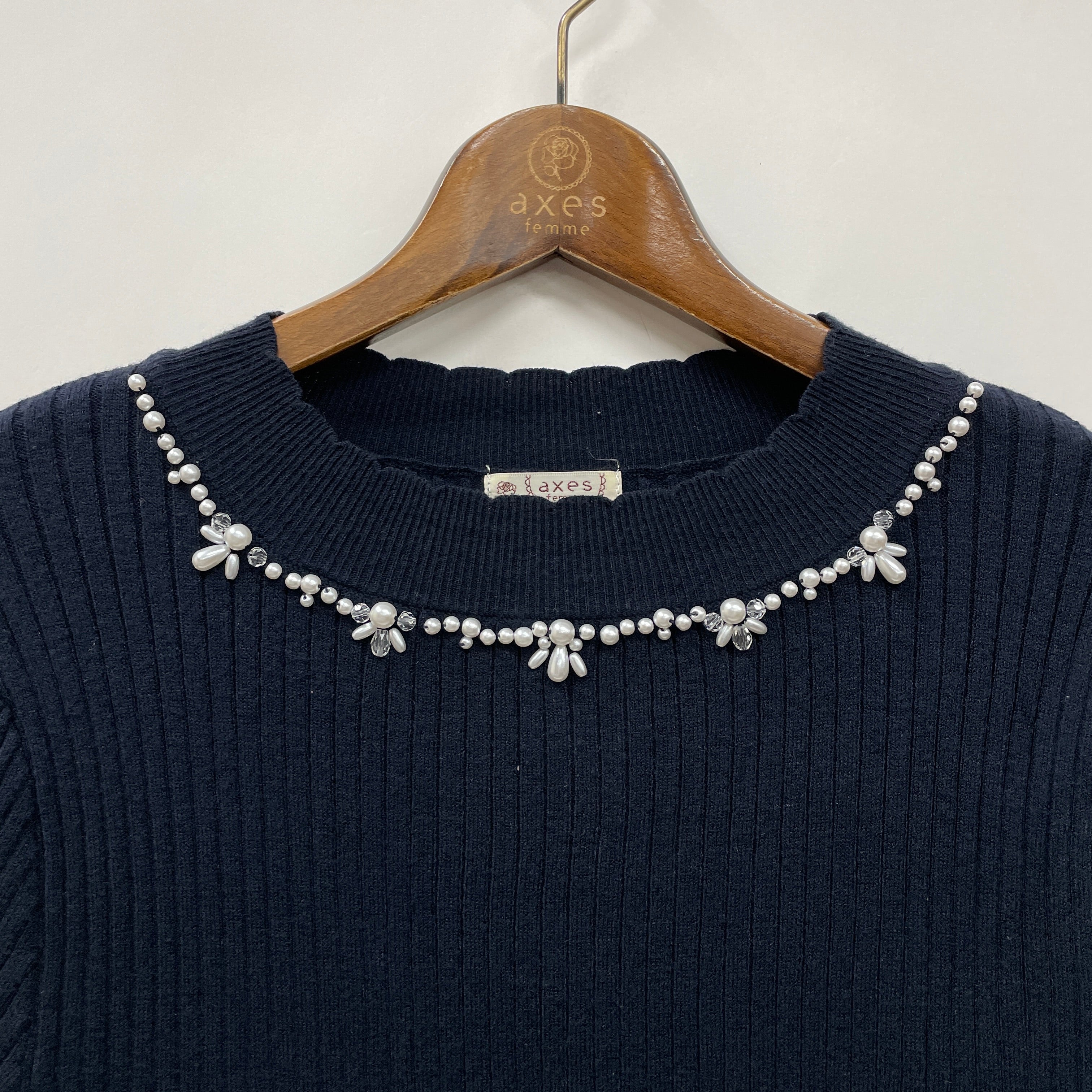 ネックレス風にパールやビーズをあしらった、大人っぽく華やかな印象のニットプルオーバーです。