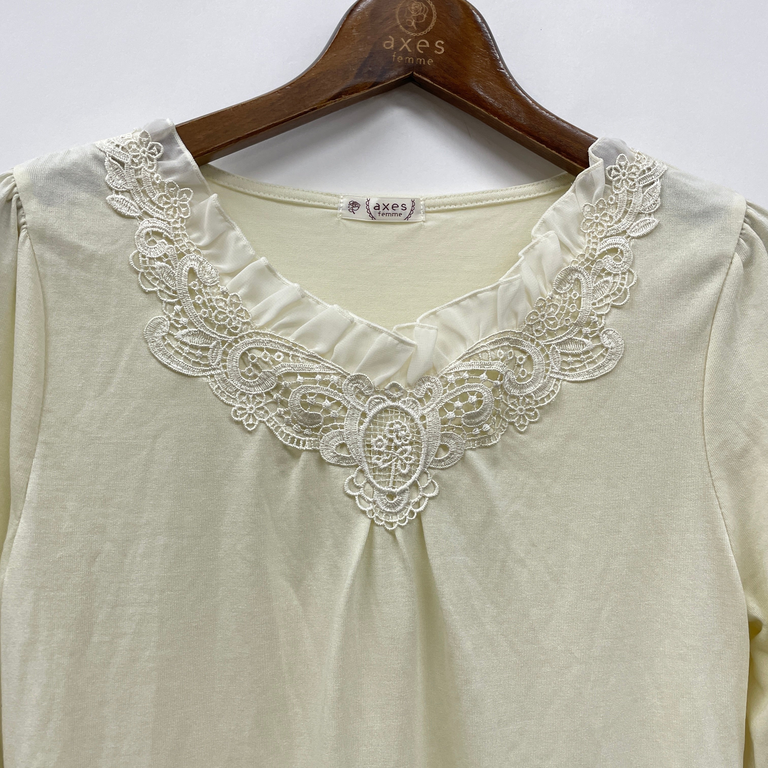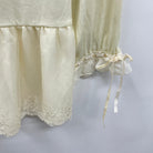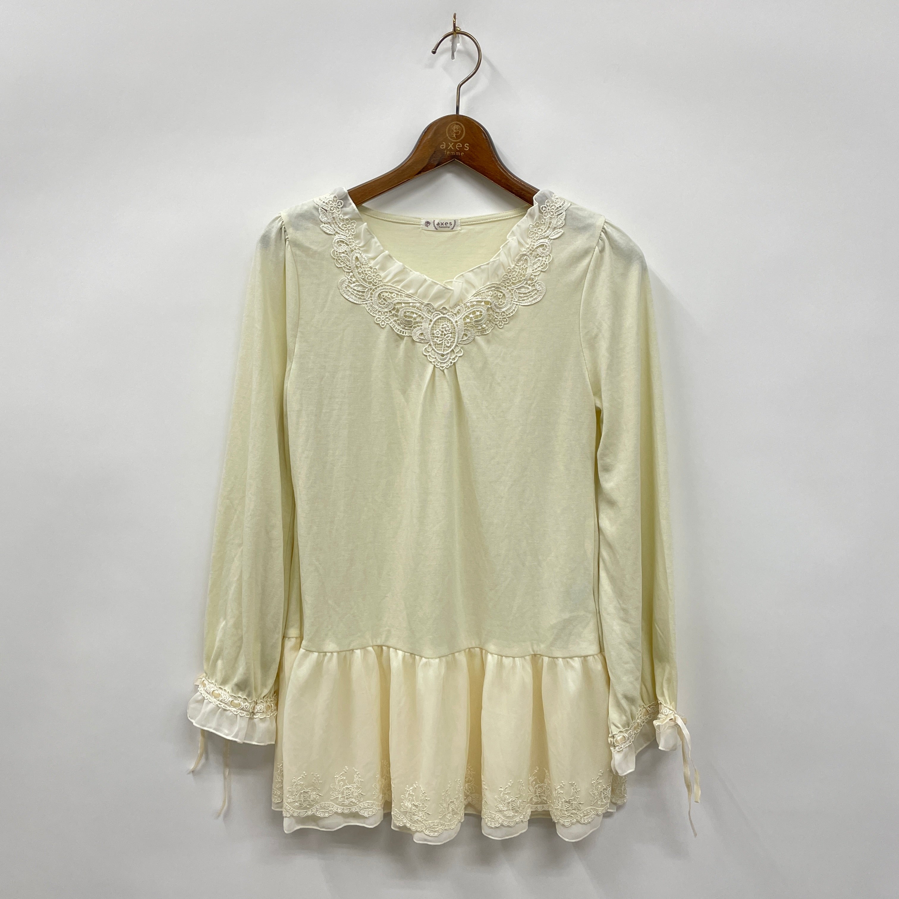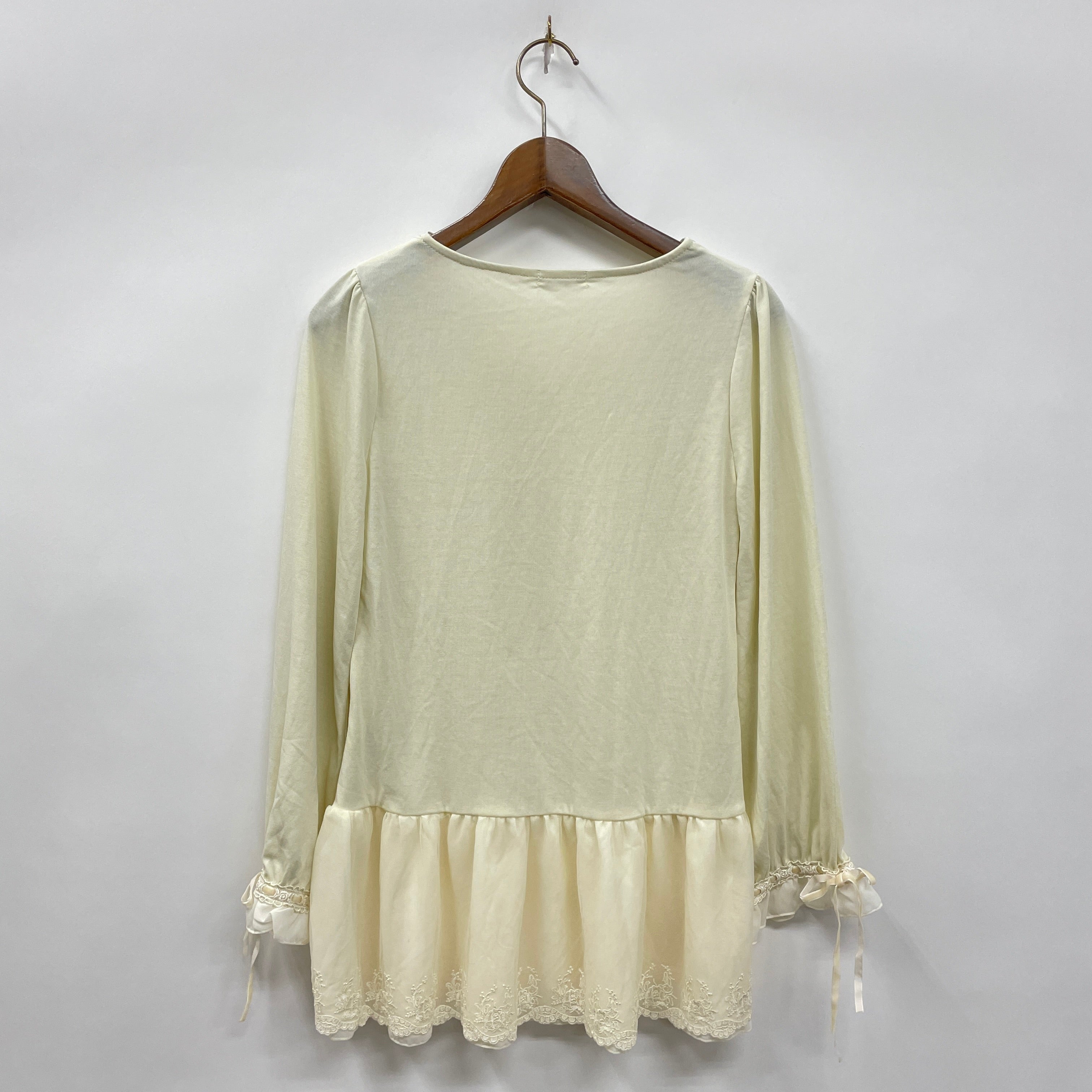 重ね着をすると裾から繊細なチュールレースとシフォンが覗くデザインのロングインナーです。袖口のはしごレースにはベロアリボンが通っており、キュッと締めて結ぶとになるのもポイントです。1枚中に着るだけでフェミニンな印象になるアイテムなので、ニットPOなどとのレイヤードスタイルがオススメです。