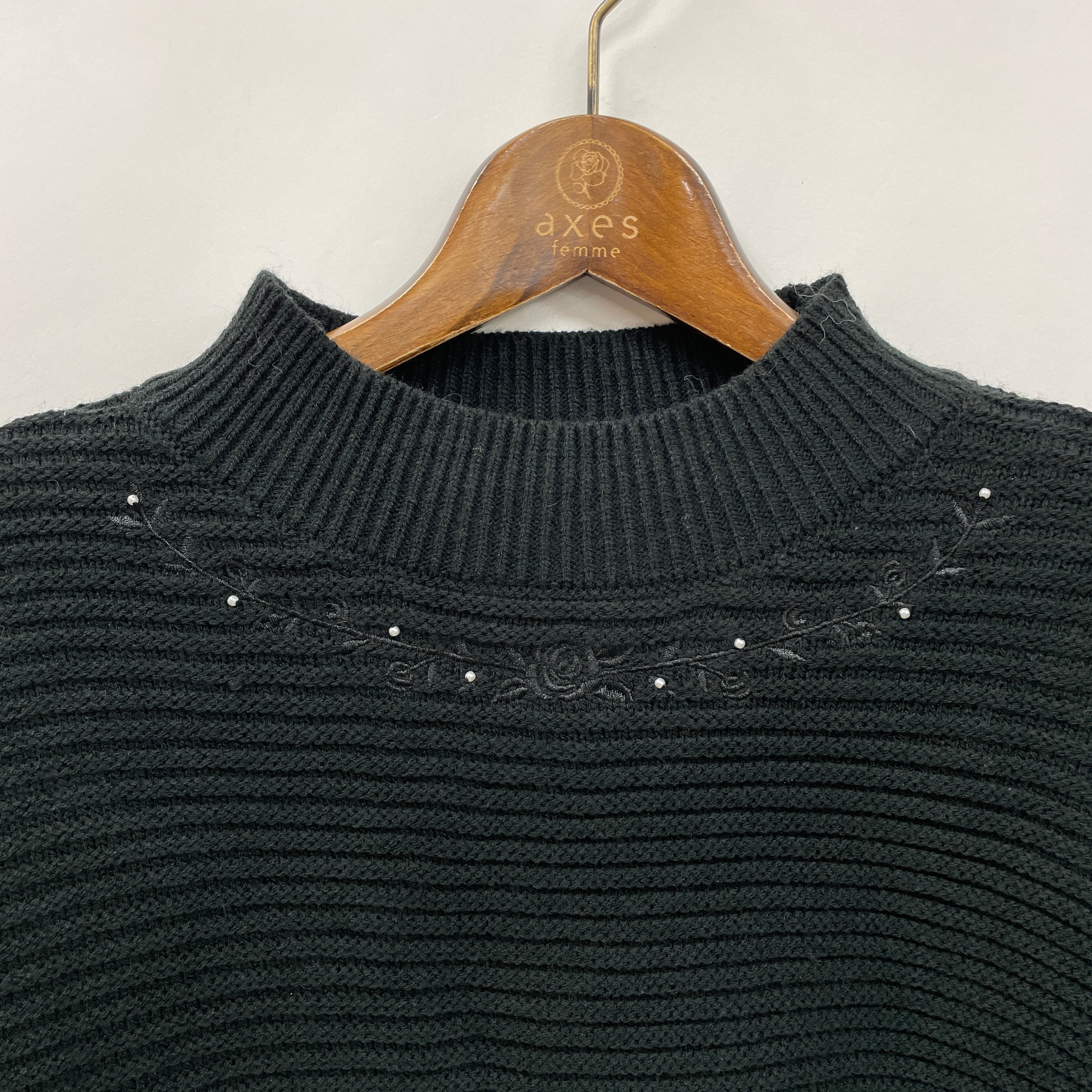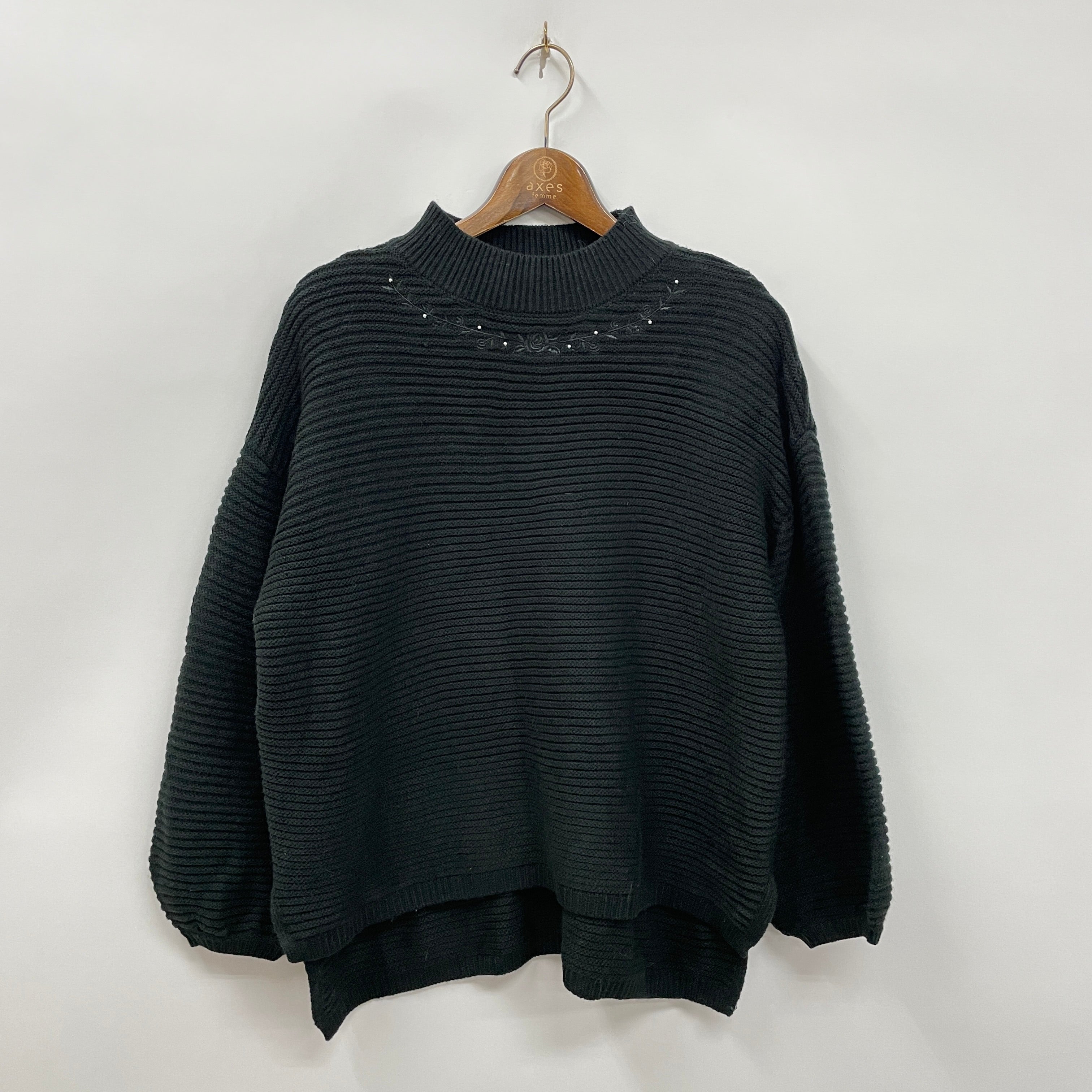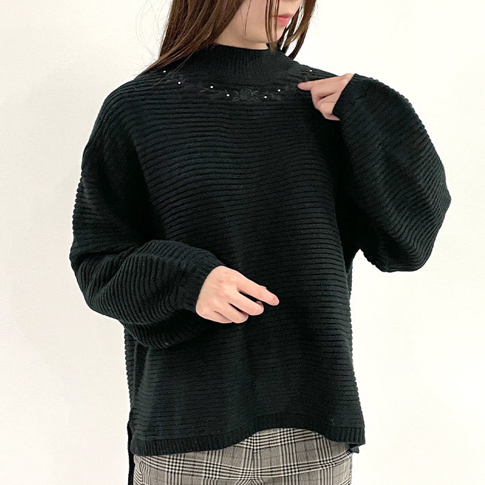 胸元のバラ刺繍がさりげなくおしゃれなニットプルオーバーです。刺繍の上にはパールが手付けされており上品な印象に。ドルマンスリーブやゆったりしたウエスト周りは体型カバーにも◎。ロングスカートやパンツスタイルでカジュアルにあわせるのがおすすめ。