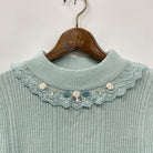 花柄のチュールレースやパール・ビーズをネックレスのように襟ぐりに施した、装飾性の高いデザイン。