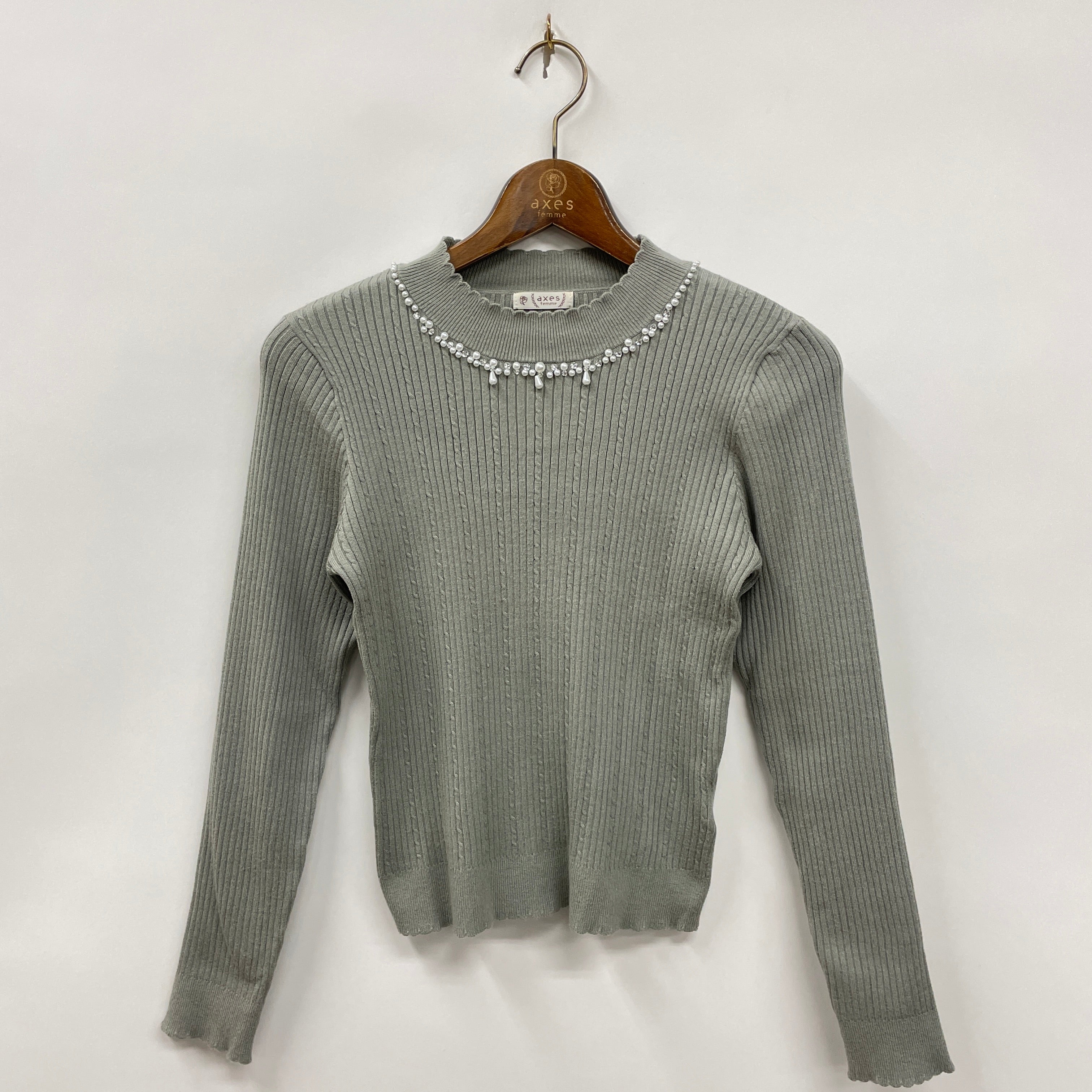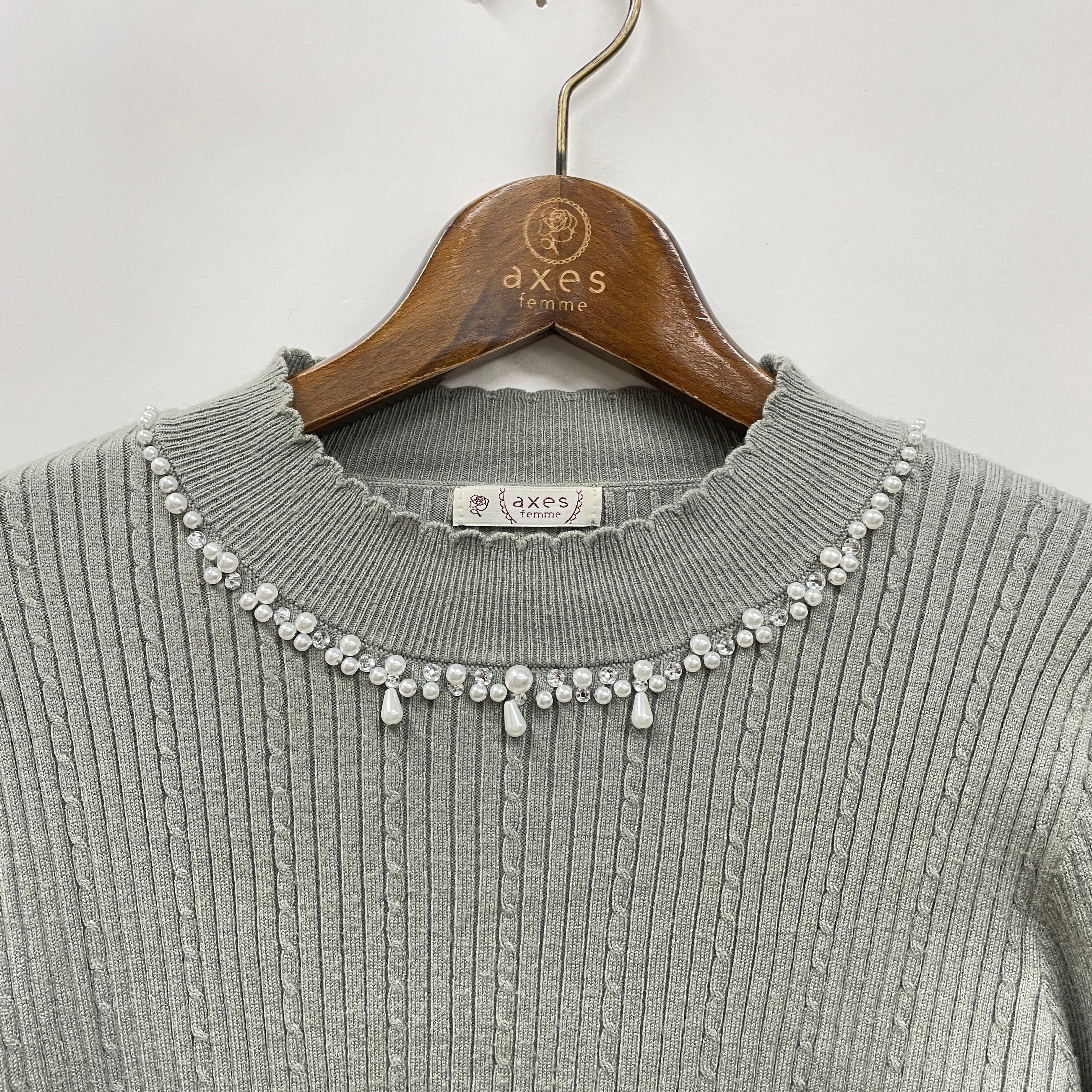 胸元のパールビジューがゴージャスなニットトップスです。ボトムを選ばないシンプルで着まわしのきくデザイン。滑らかなニット生地で肌当たり、着心地も抜群です。